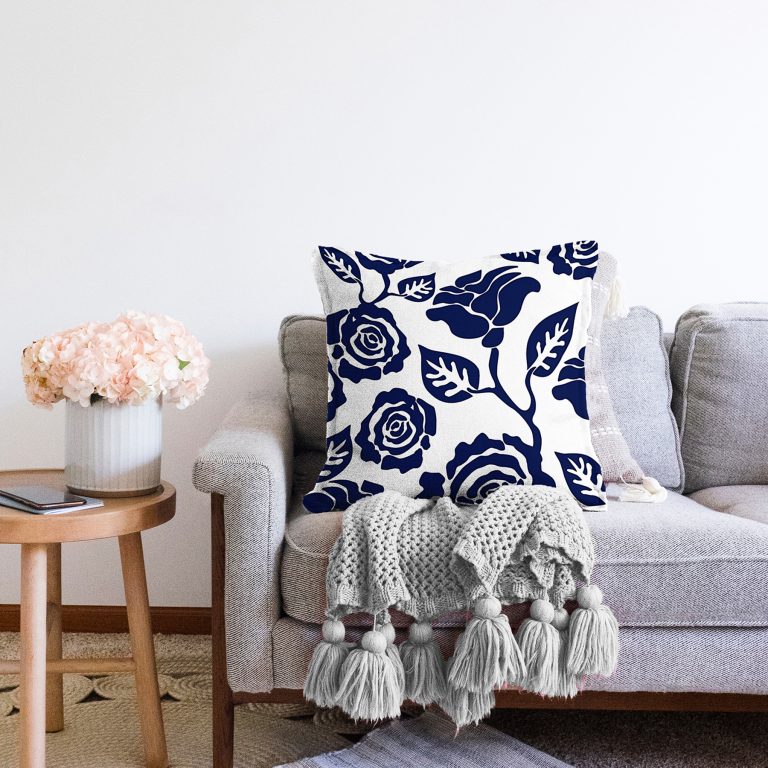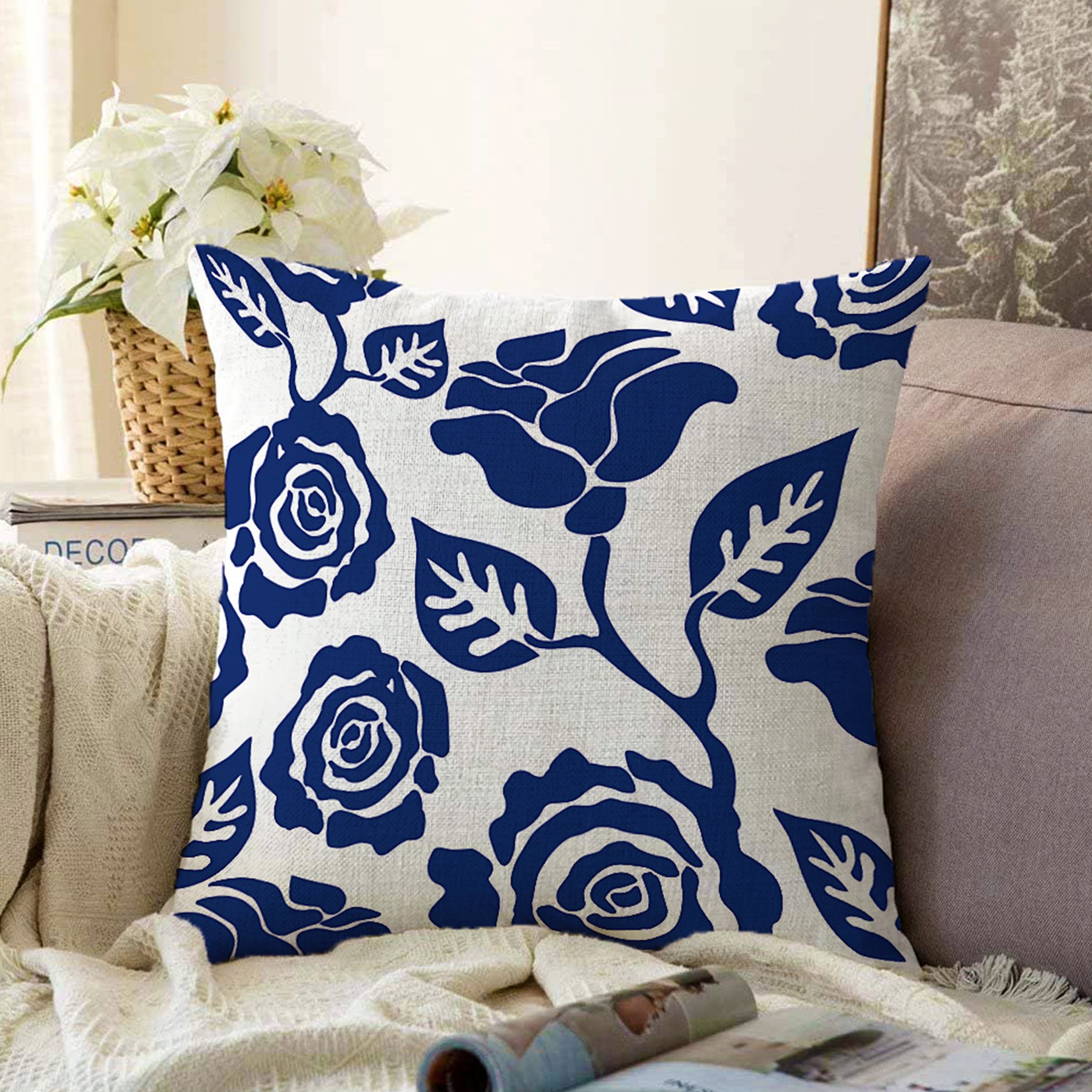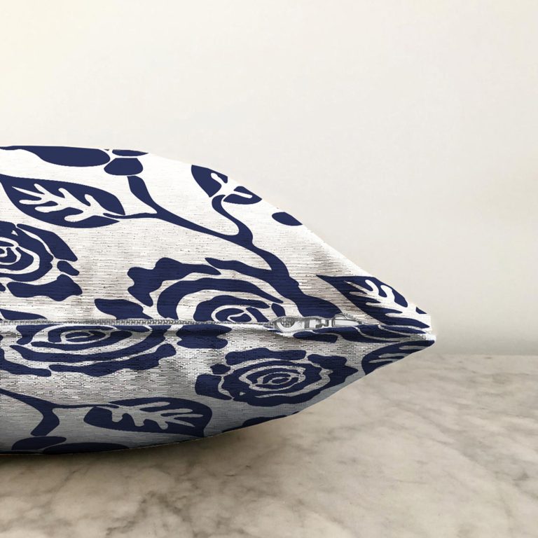 Beyaz Zeminli Lacivert Gül Tasarımlı Modern Raşel Yastık Kırlent Kılıfı