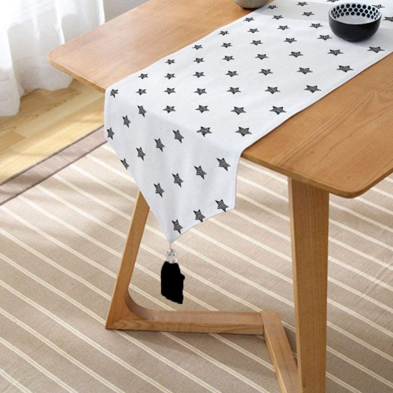 Beyaz Zeminli Yıldız Desenli Dijital Baskılı Dekoratif Püsküllü Şönil Üçgen Runner