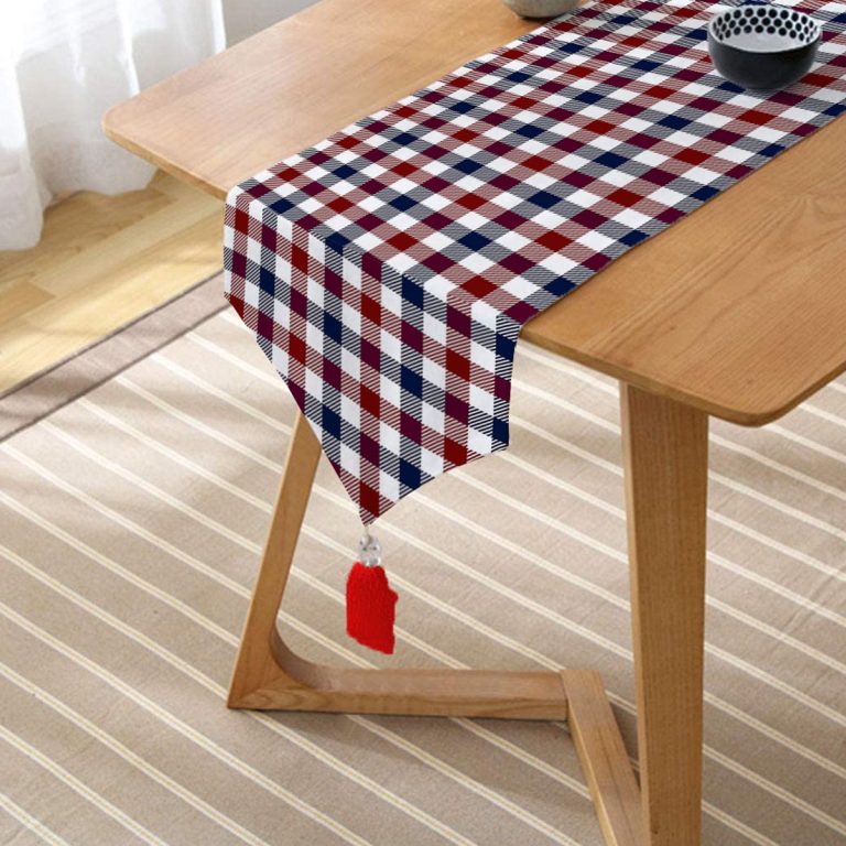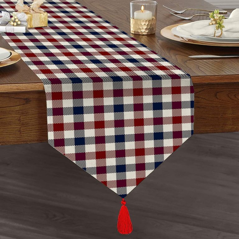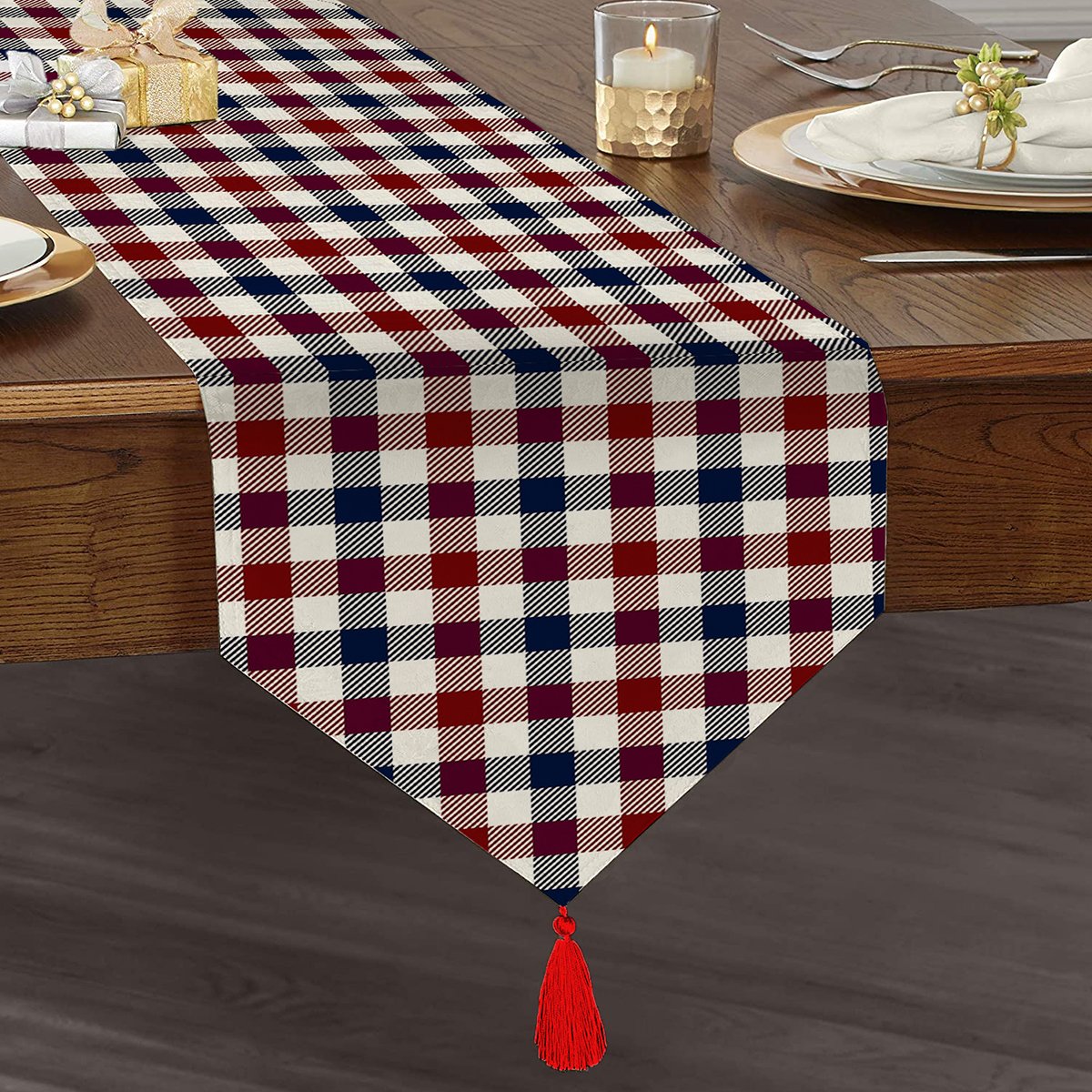 Bordo Lacivert Ekose Desenli Dekoratif Püsküllü Şönil Üçgen Runner