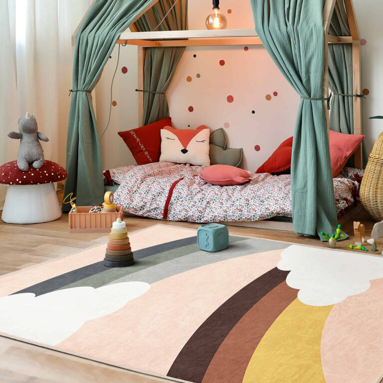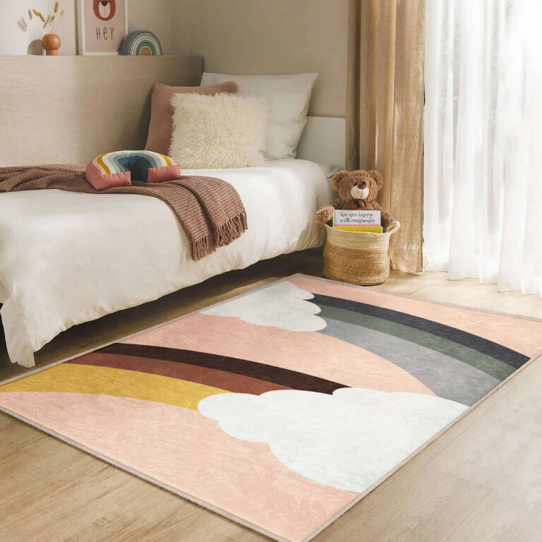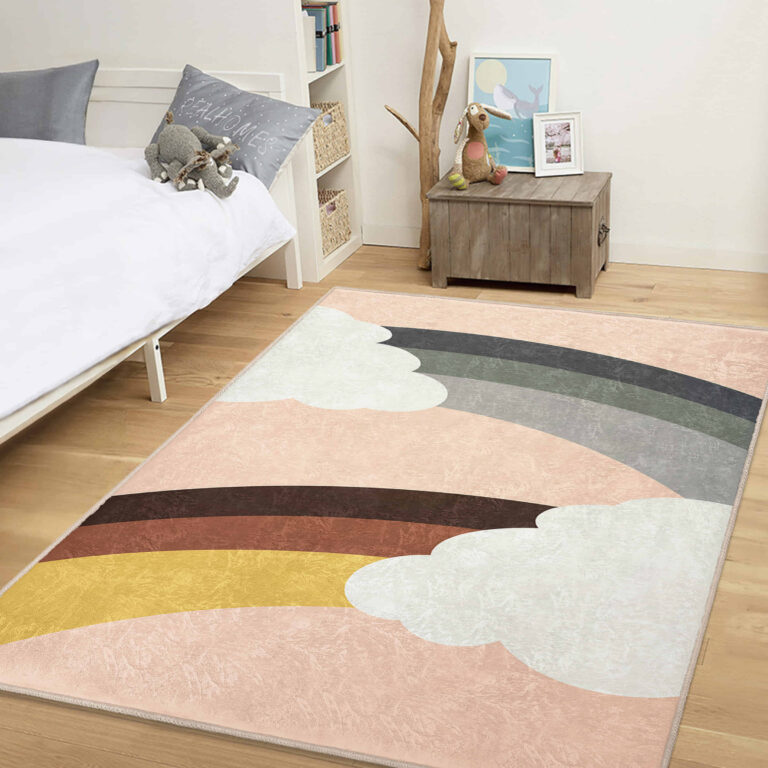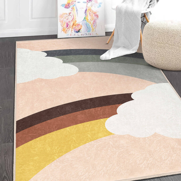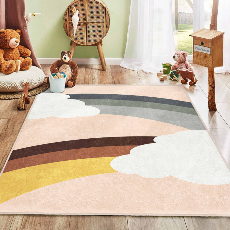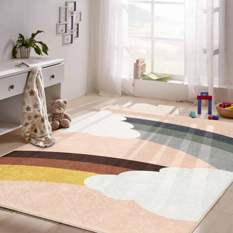 Bulut ve Gökkuşağı Desenli Sevimli Dikdörtgen Çocuk Halısı – Kaymaz Taban & Yıkanabilir