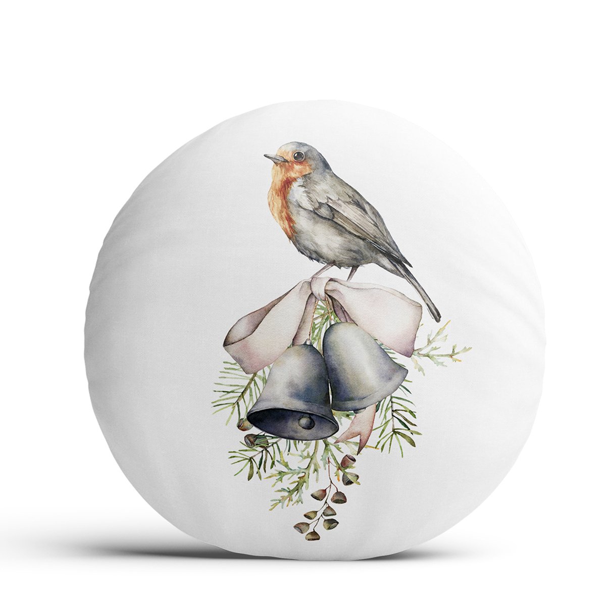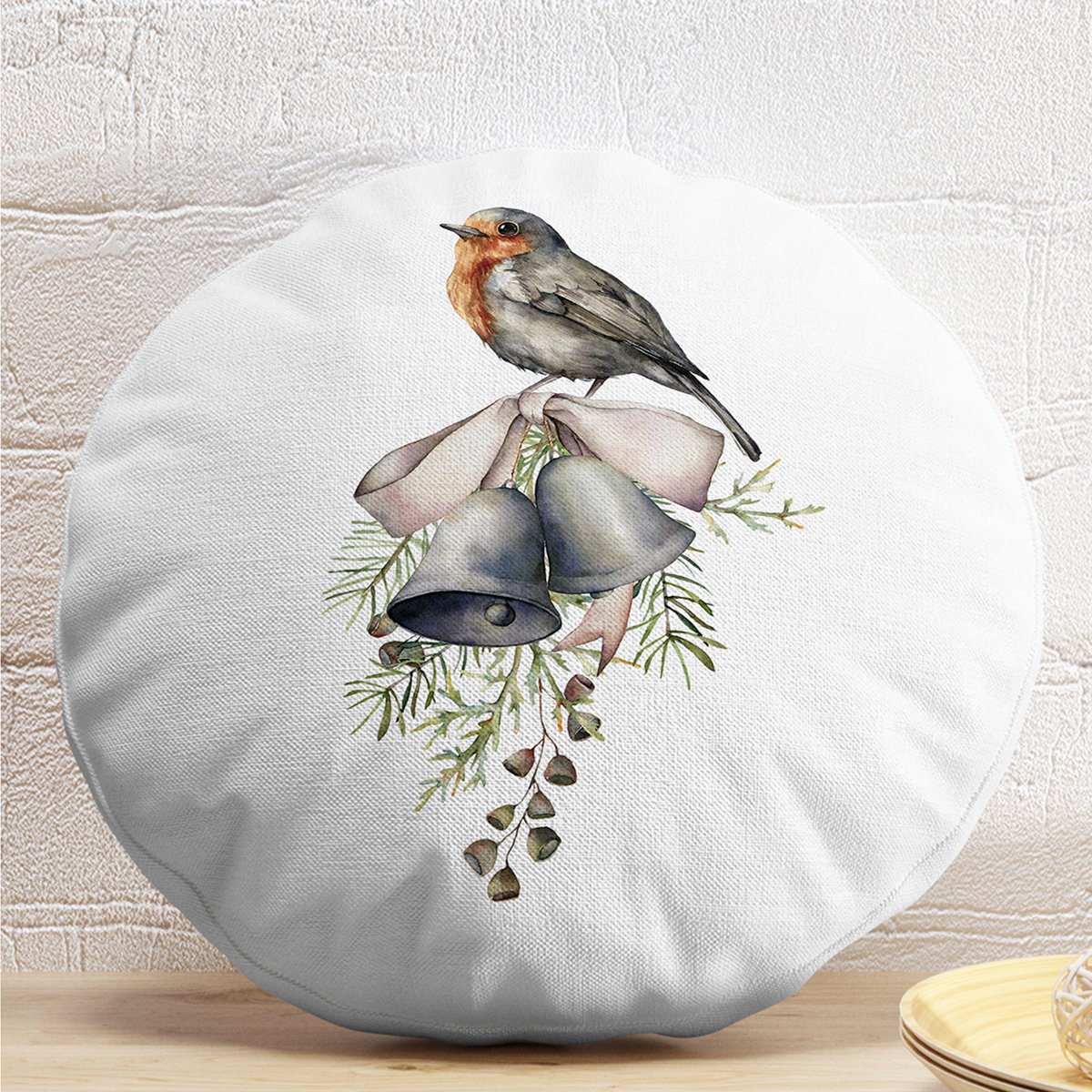 Çan & Kuş Motifli Dijital Baskılı Modern Yuvarlak Yastık Kırlent Kılıfı