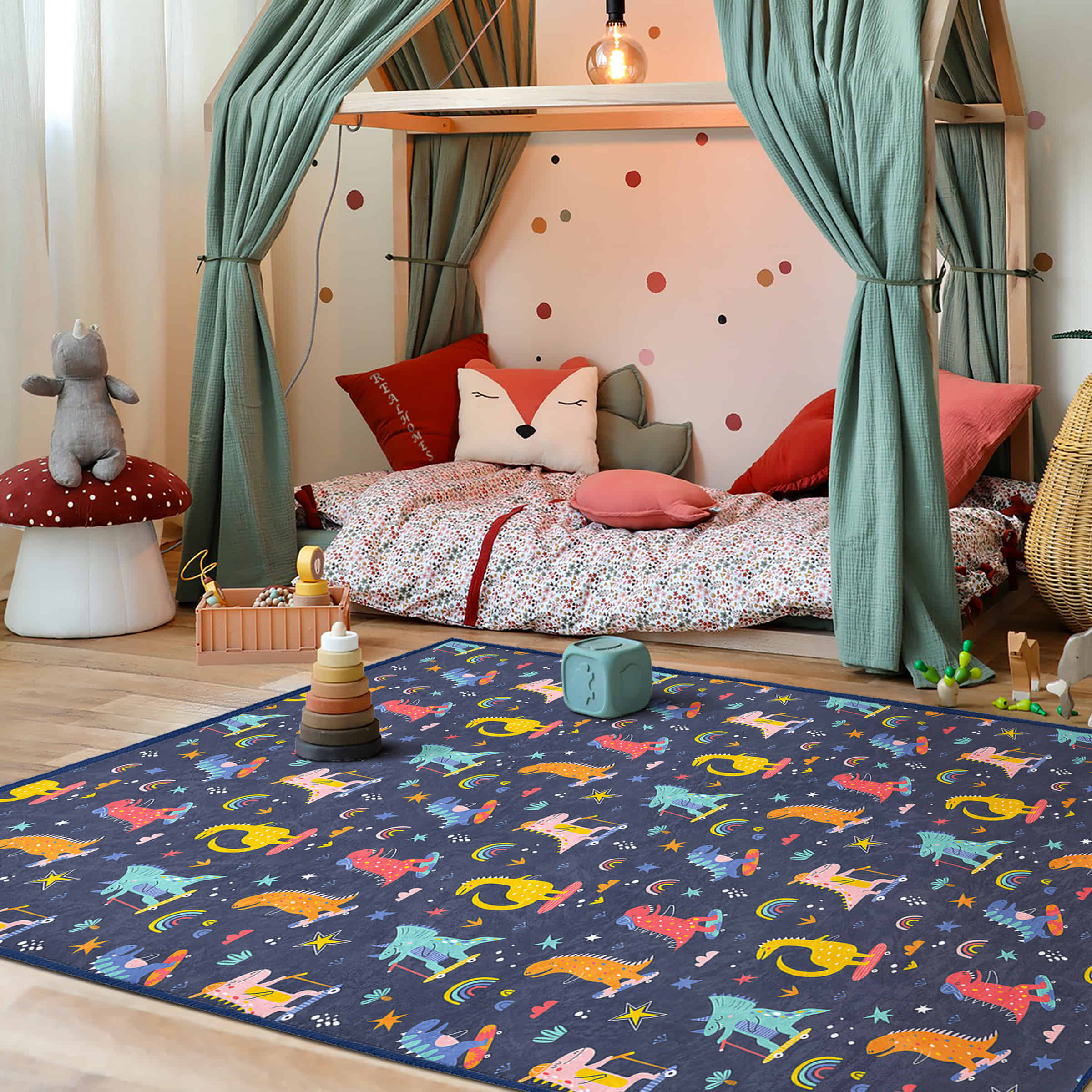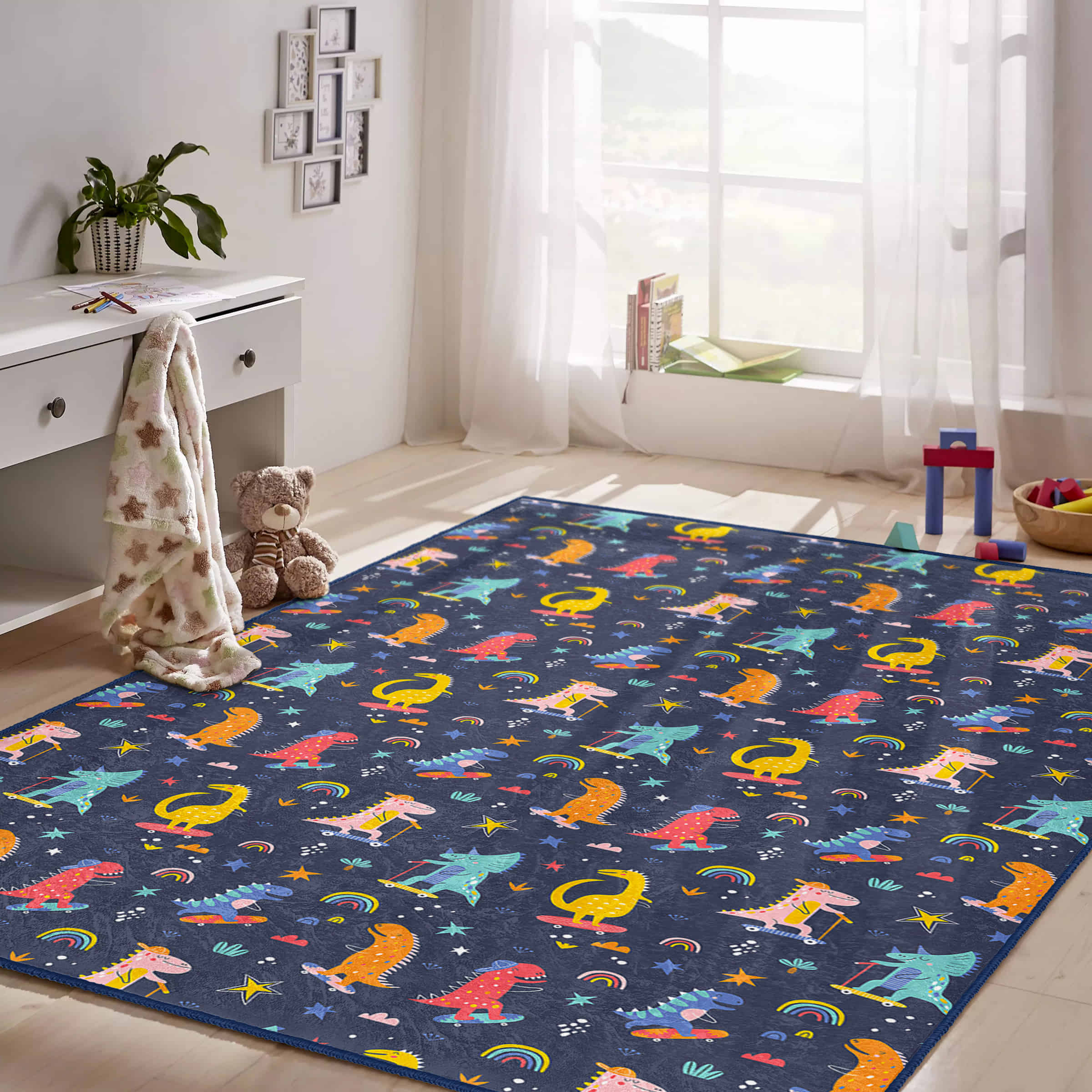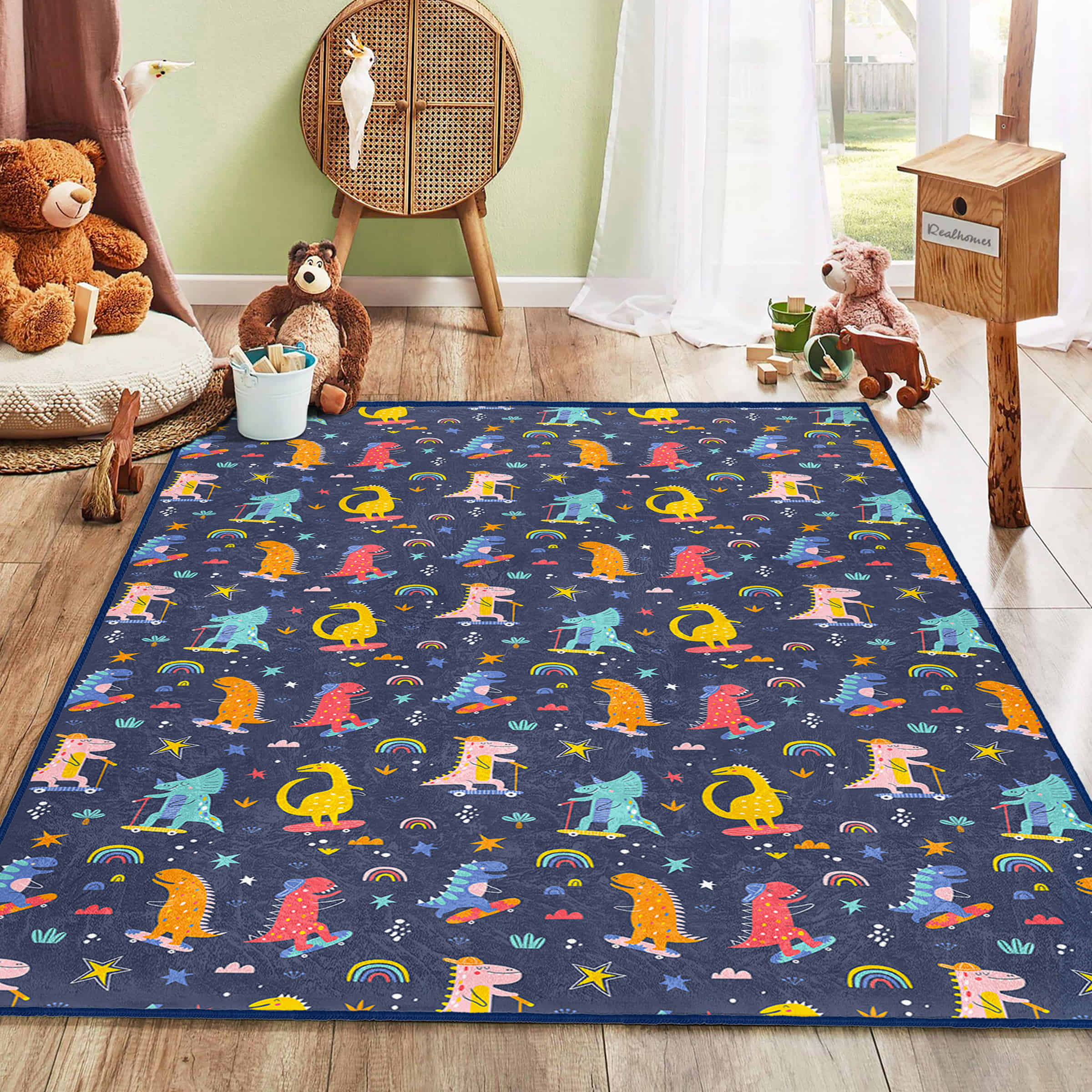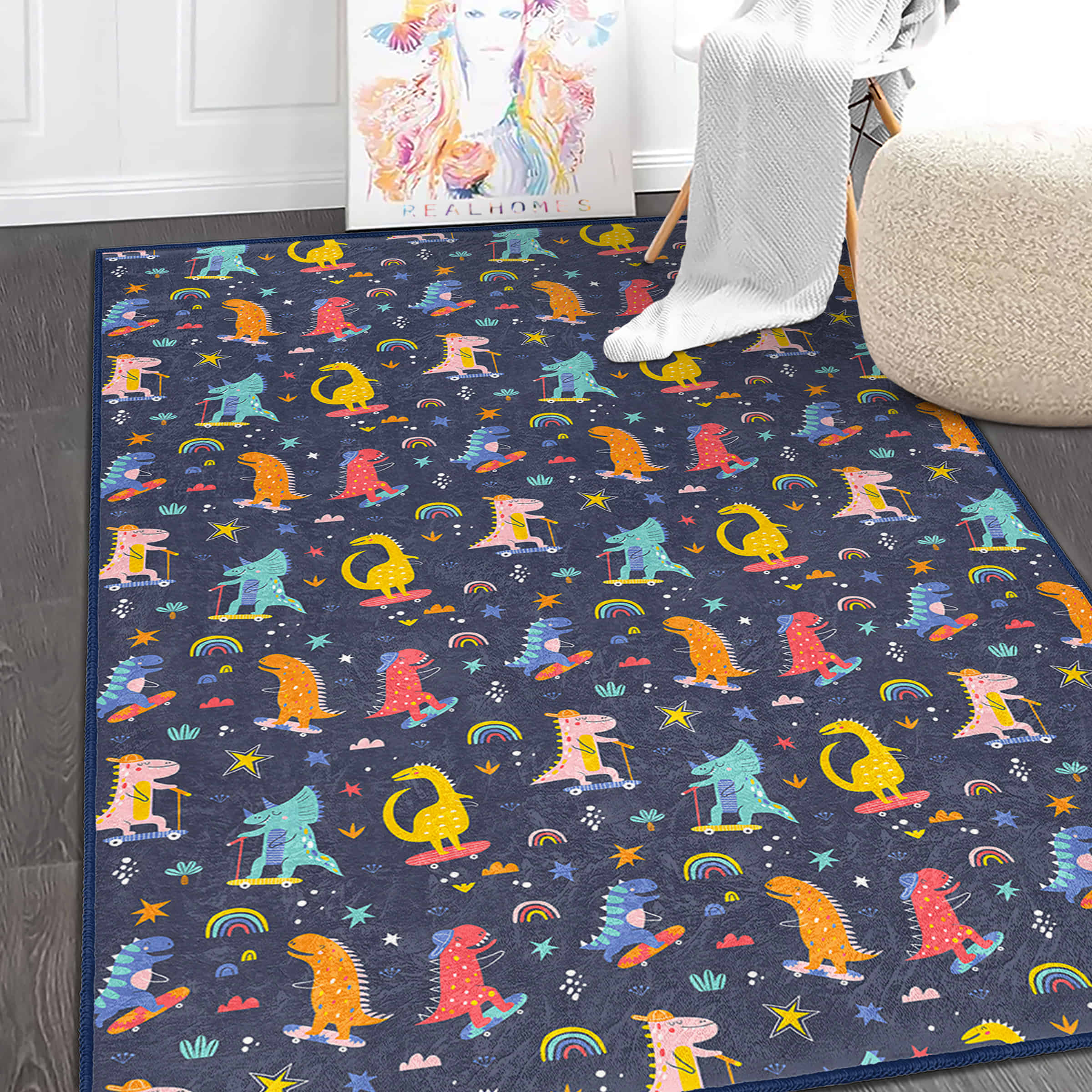 Canlı Renklerde Çocuk Halısı: Dinosaurus ve Gökkuşağı Motifli Yıkanabilir Kaymaz Taban Halı