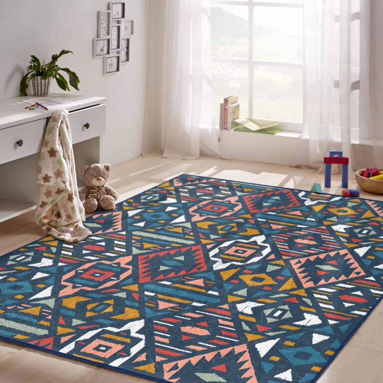 Canlı Renklerde Geometrik Desenli Dikdörtgen Çocuk Halısı – Makinede Yıkanabilir Kaymaz Tabanlı Halı