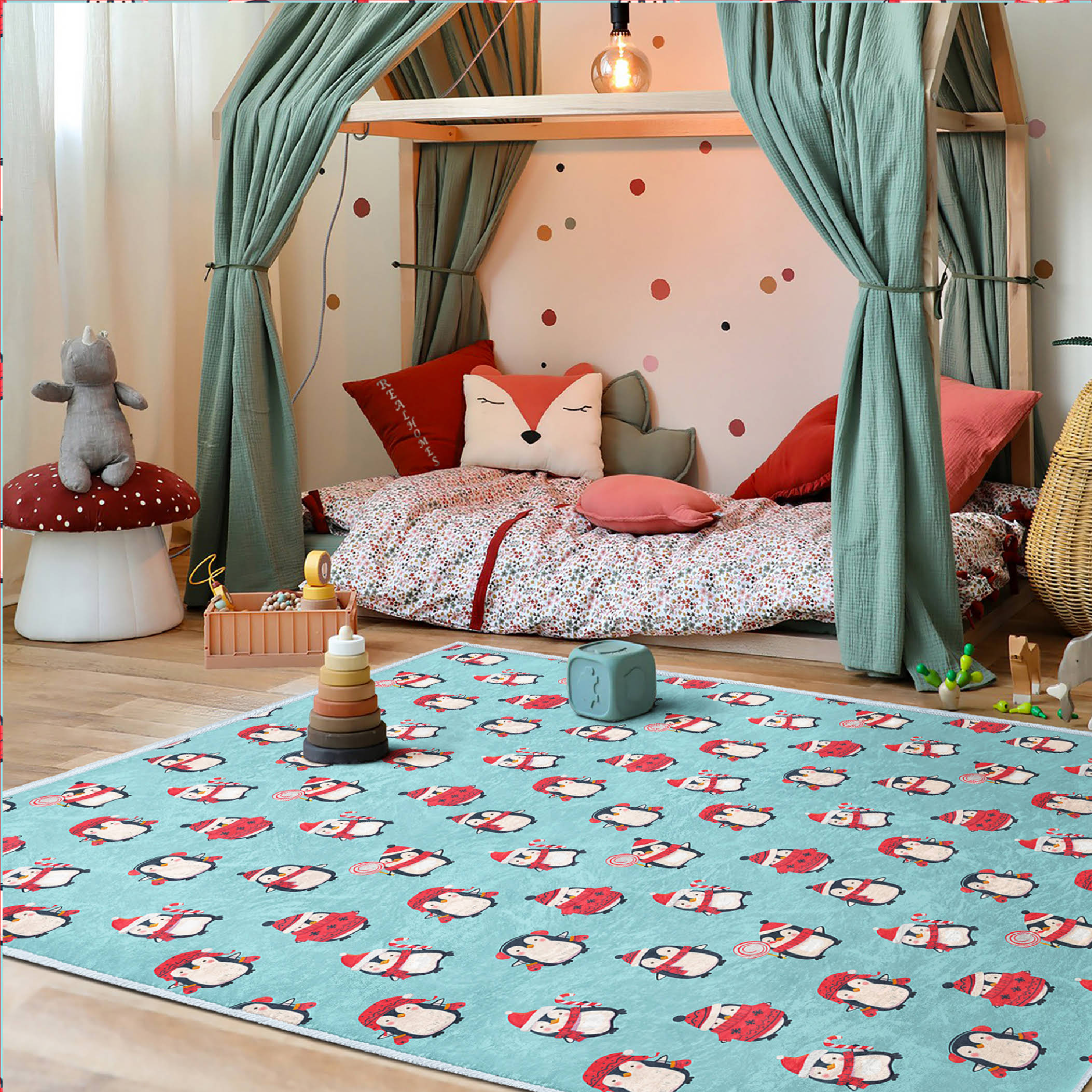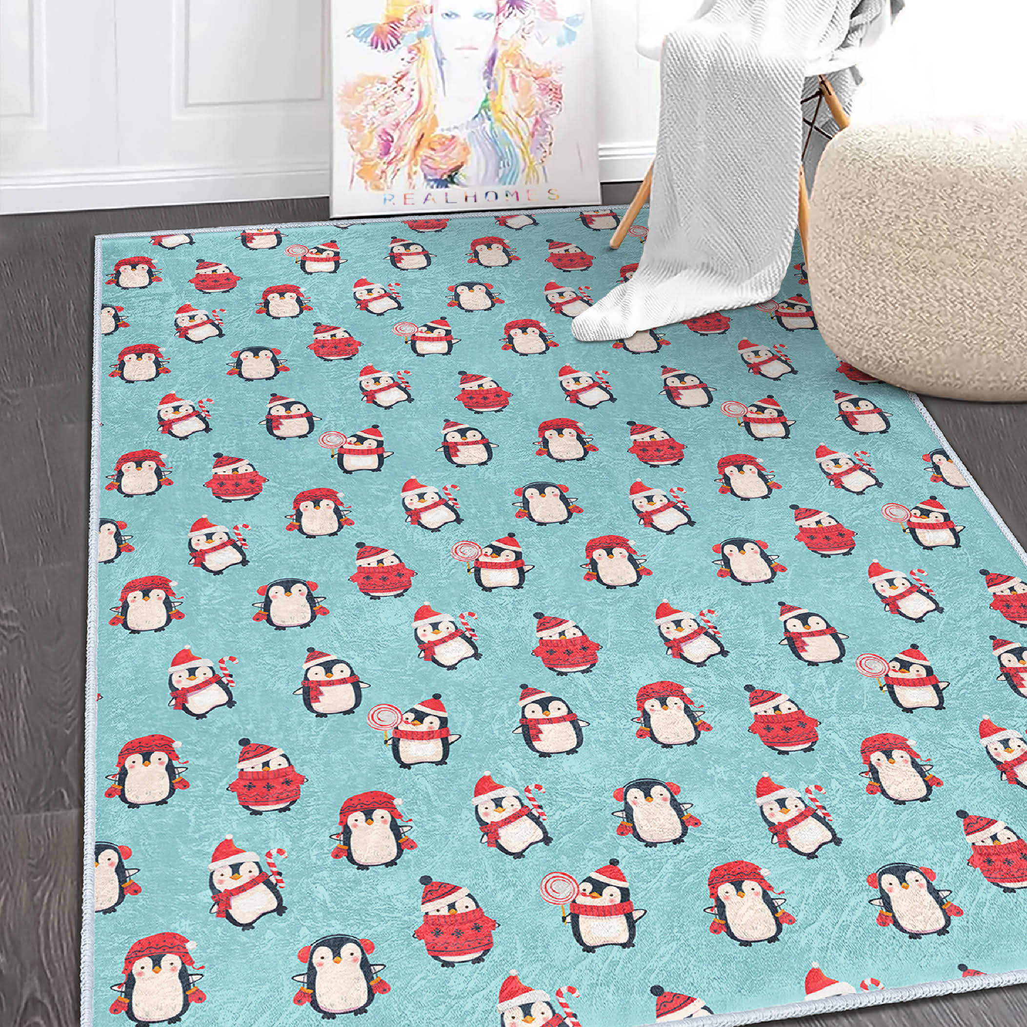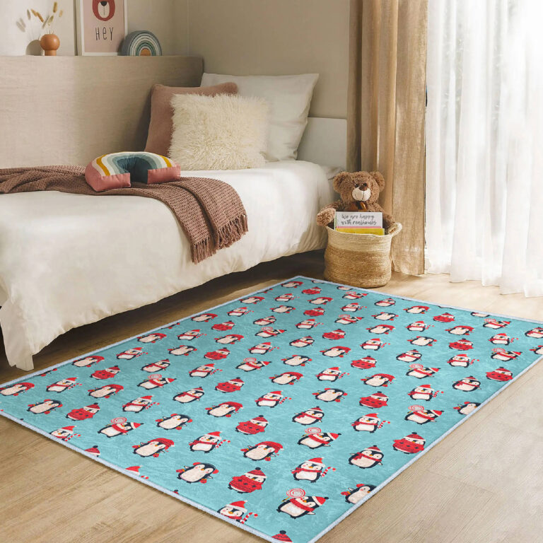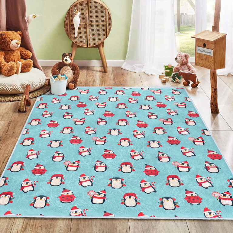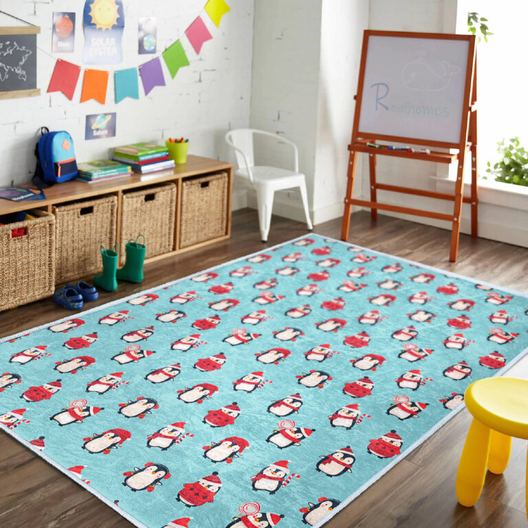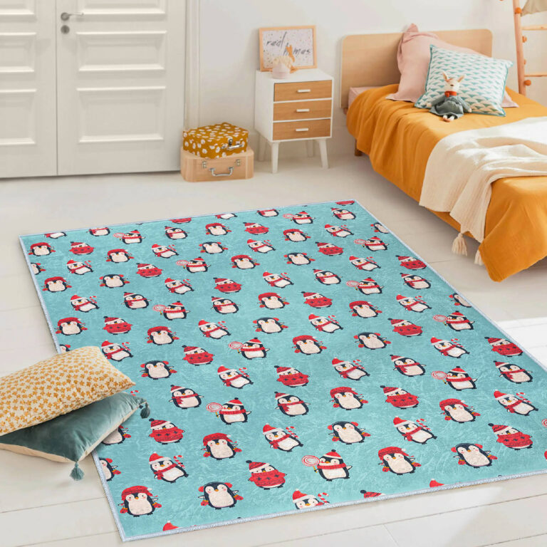 Canlı Renklerde Penguen Motifli Dikdörtgen Çocuk Halısı – Kaymaz Tabanlı Yıkanabilir Halı
