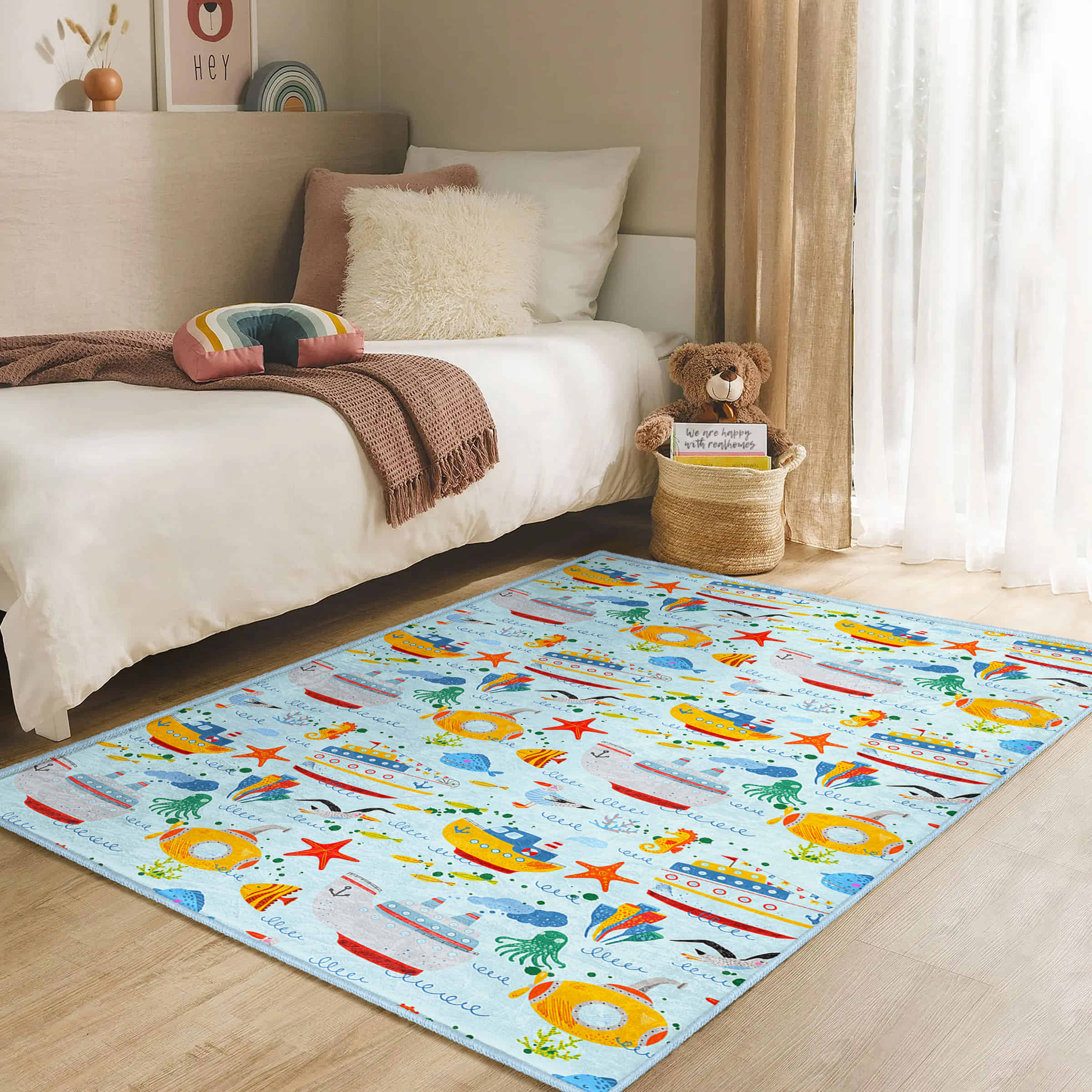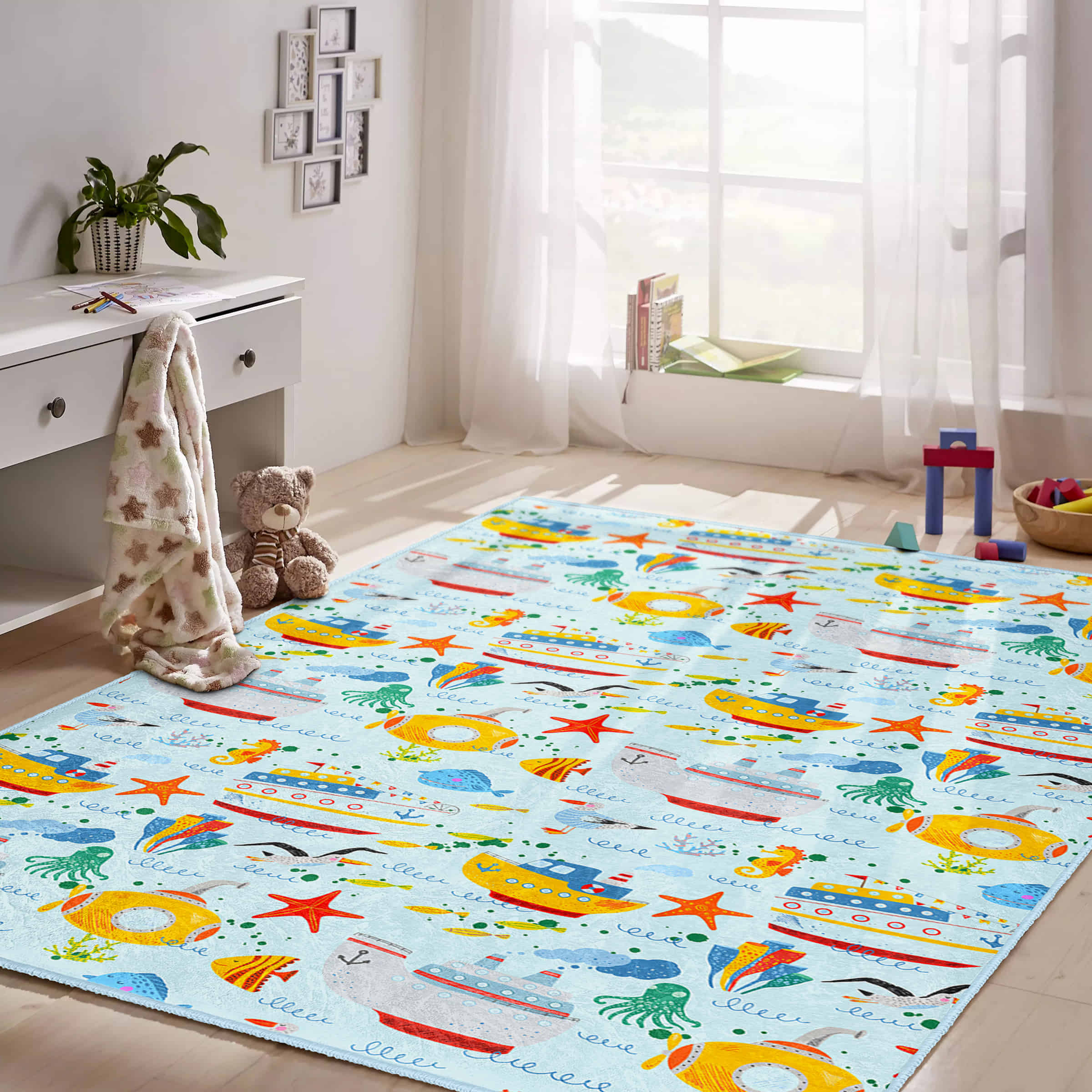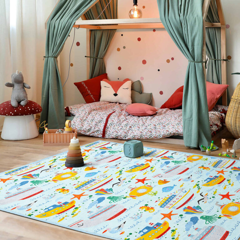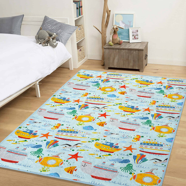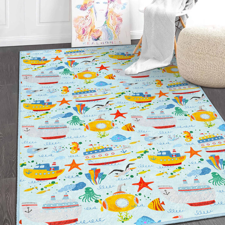 Canlı Renklerle Tasarlanmış Deniz Temalı Çocuk Halısı – Yıkanabilir Kaymaz Tabanlı Dikdörtgen Halı
