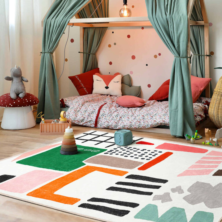 Canlı Renklerle Tasarlanmış Dikdörtgen Çocuk Halısı – Modern Desenli Kaymaz Tabanlı Yıkanabilir Halı