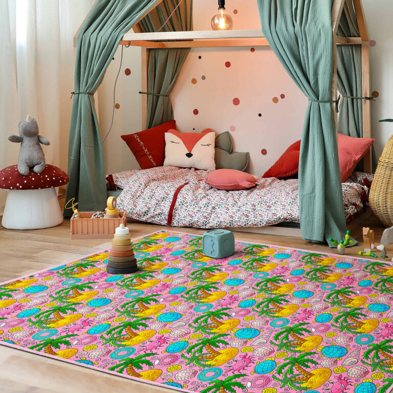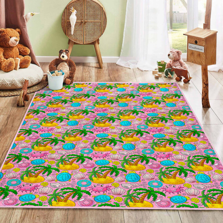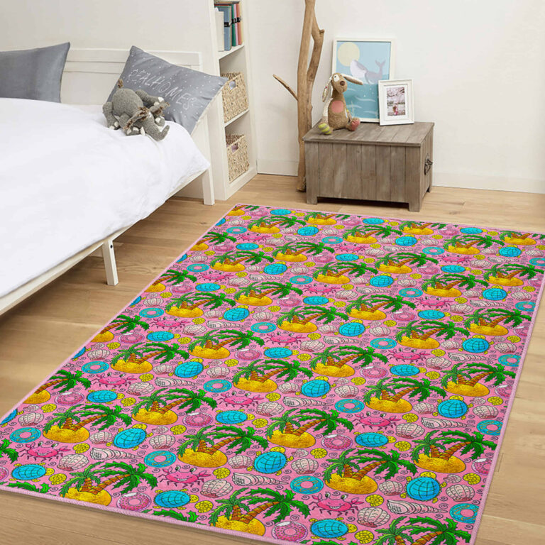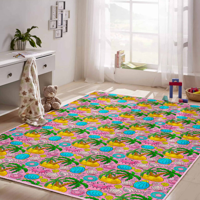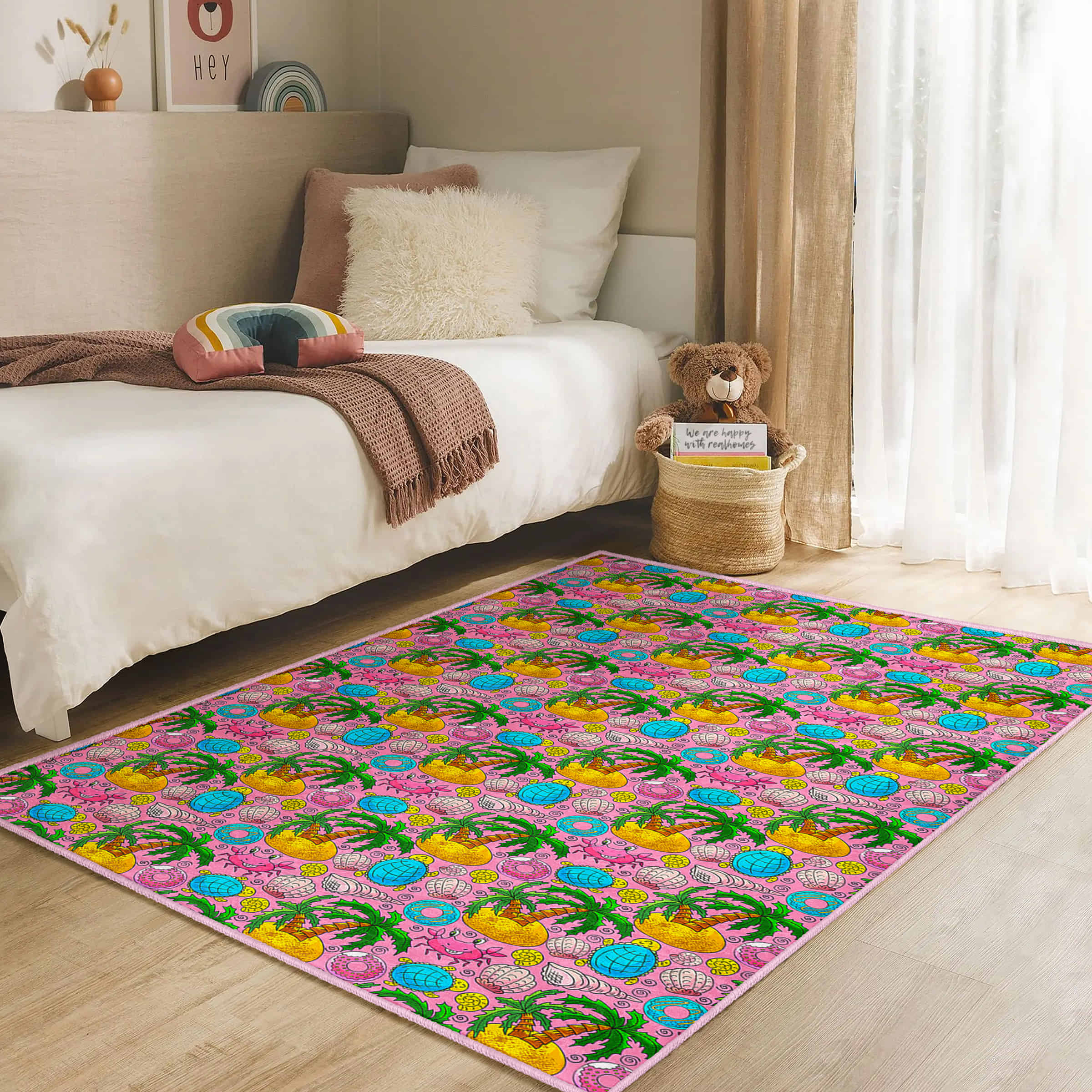 Canlı Renklerle Tasarlanmış Palmiye, Deniz Kabuğu ve Şeker Desenli Dikdörtgen Çocuk Halısı
