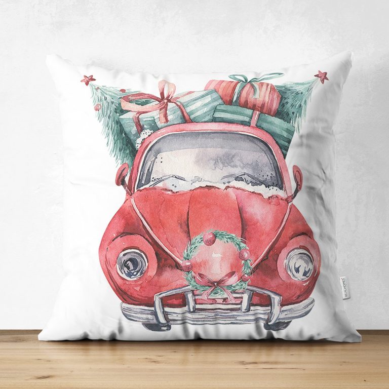 Christmas Temalı Araba Tasarımlı Dijital Baskılı Modern Süet Yastık Kırlent Kılıfı
