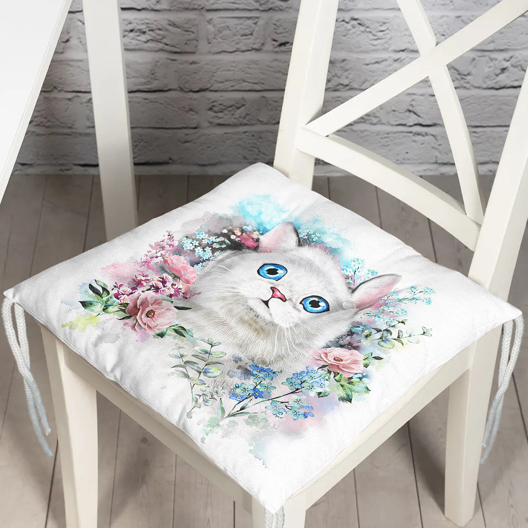 Çiçek Çerçeveli Kedi Motifli Modern Pofidik Sandalye Minderi