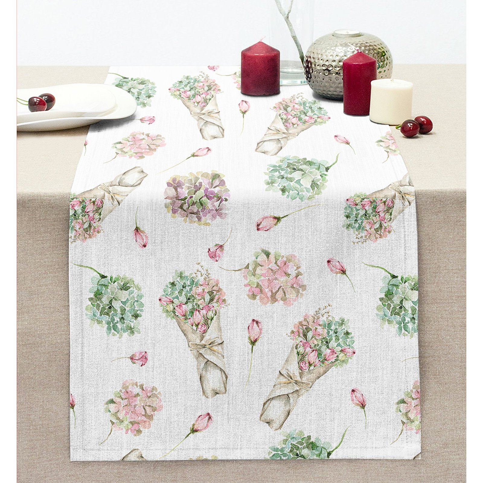 Çiçek Demetleri Özel Tasarım Dijital Baskılı Dekoratif Dikişli Şönil Runner