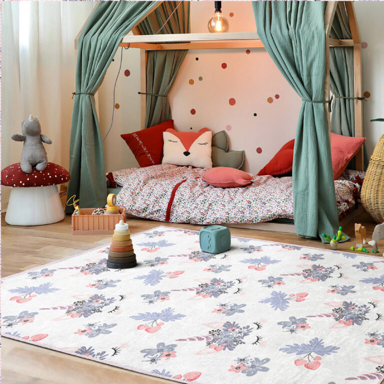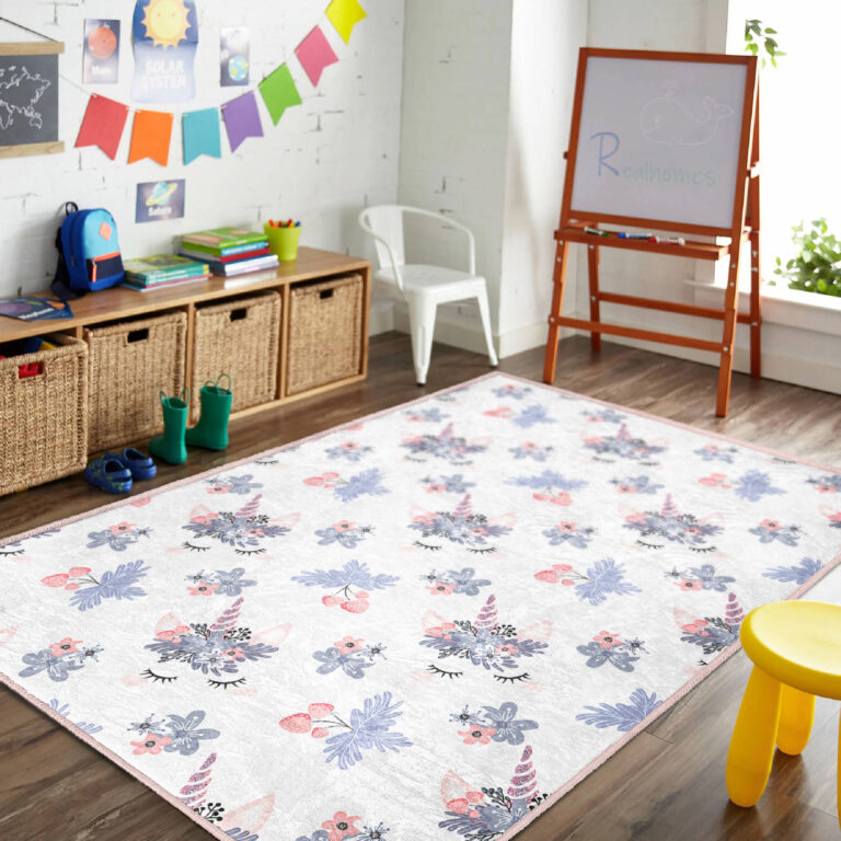 Çiçek Desenli Renkli Dikdörtgen Çocuk Halısı – Makinede Yıkanabilir Kaymaz Tabanlı Halı