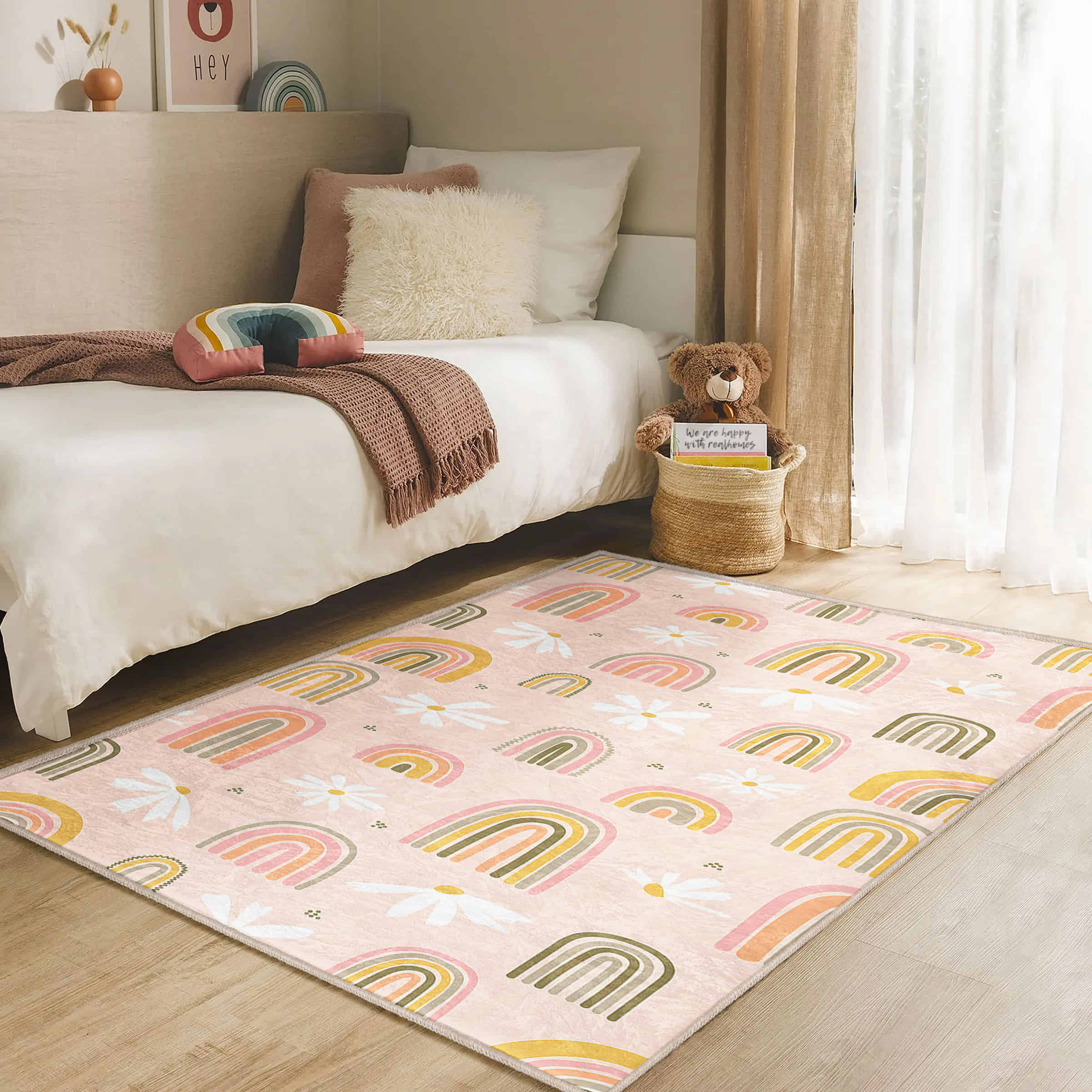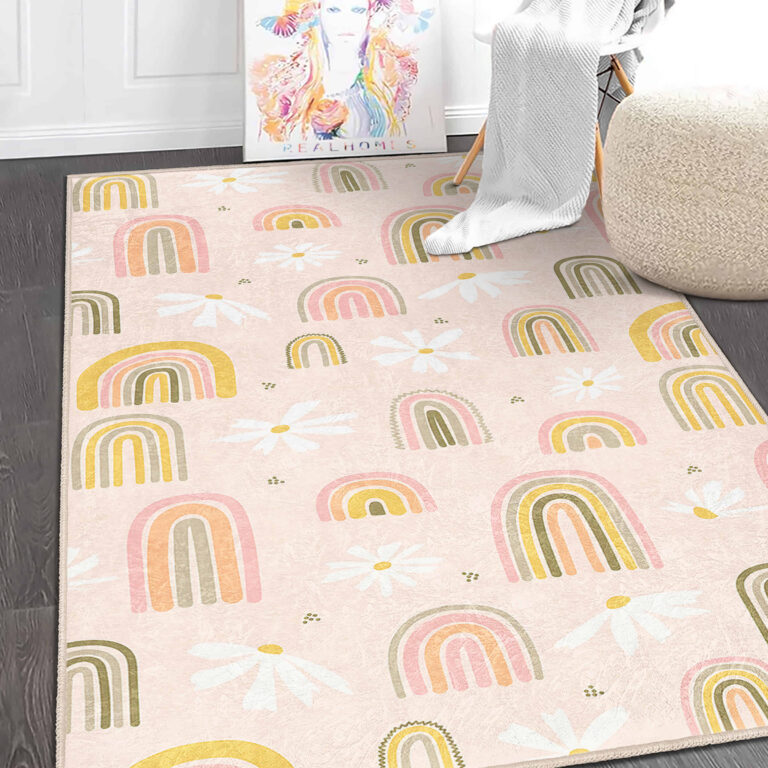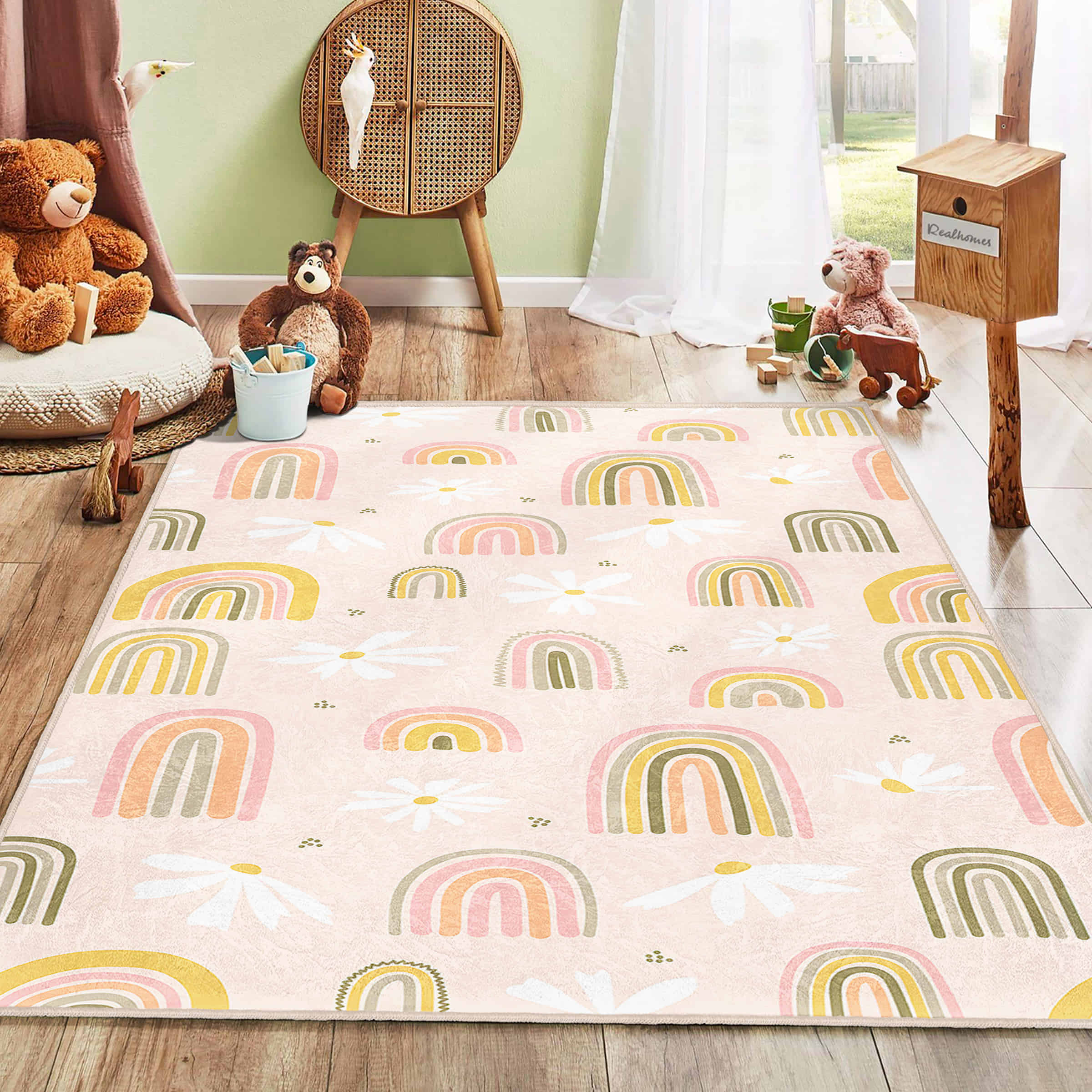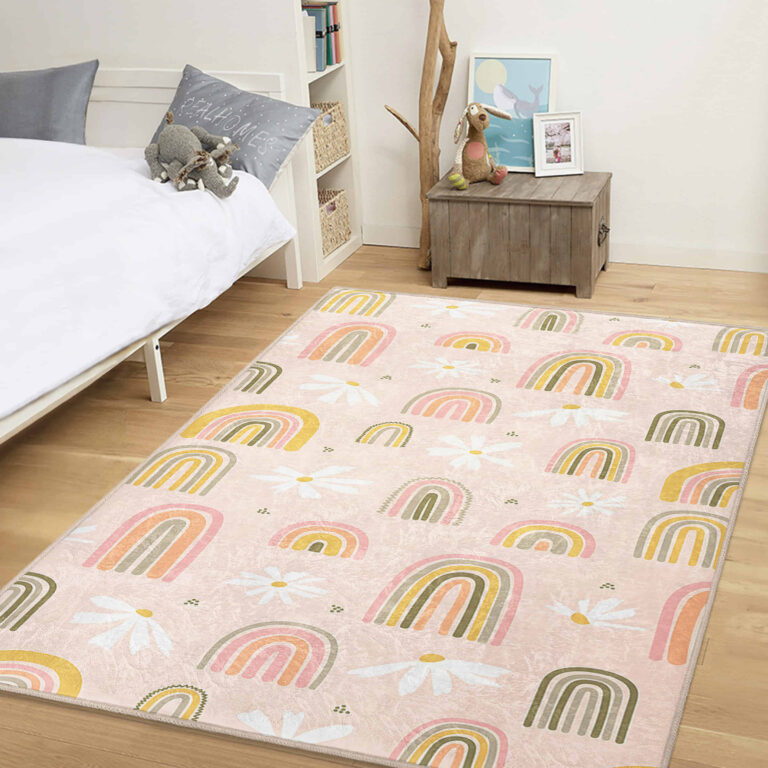 Çiçekli ve Renkli Arkalar Desenli Yıkanabilir Kaymaz Taban Çocuk Halısı – Dikdörtgen