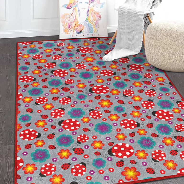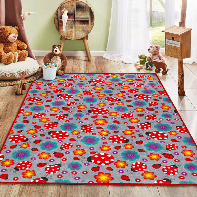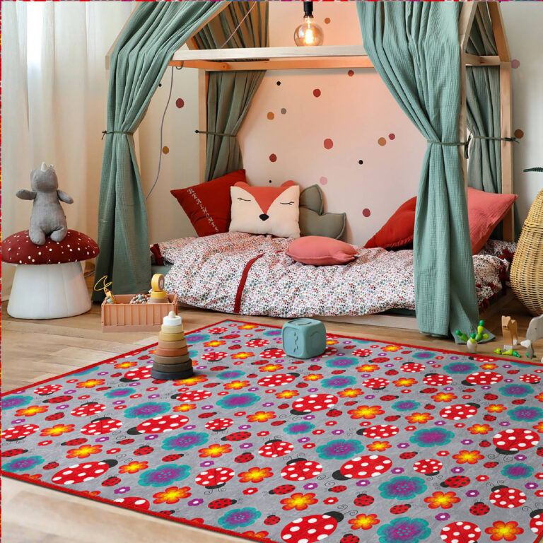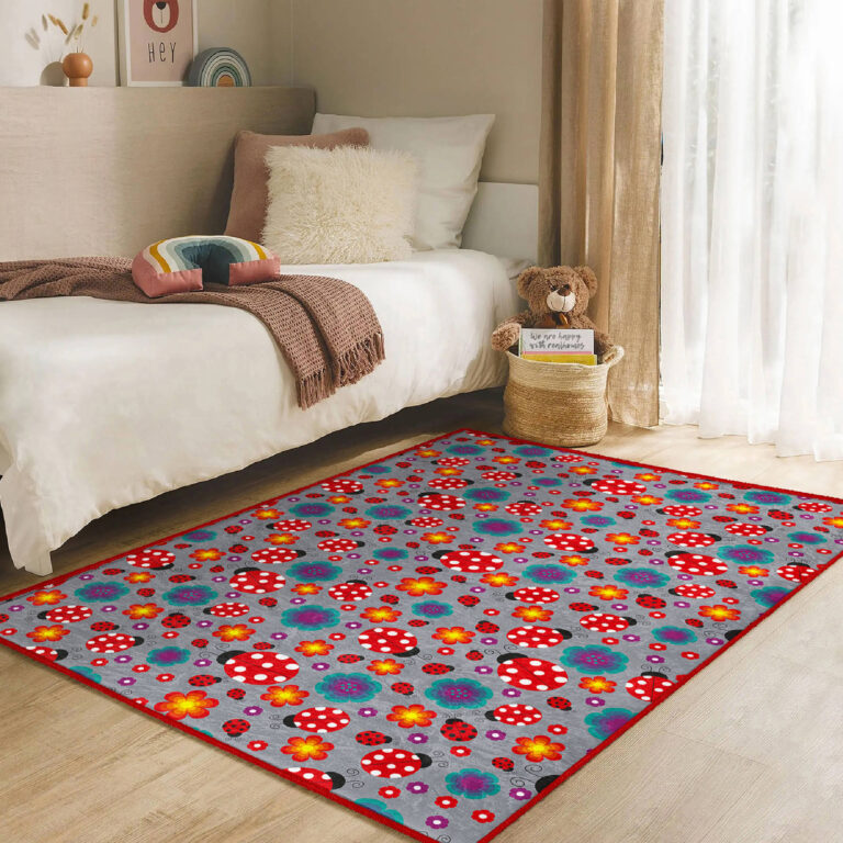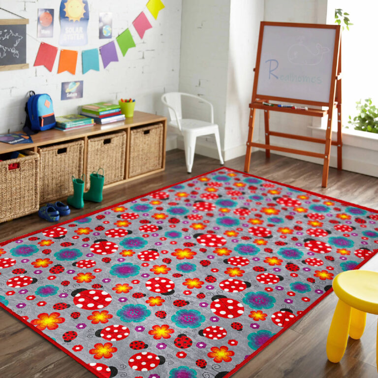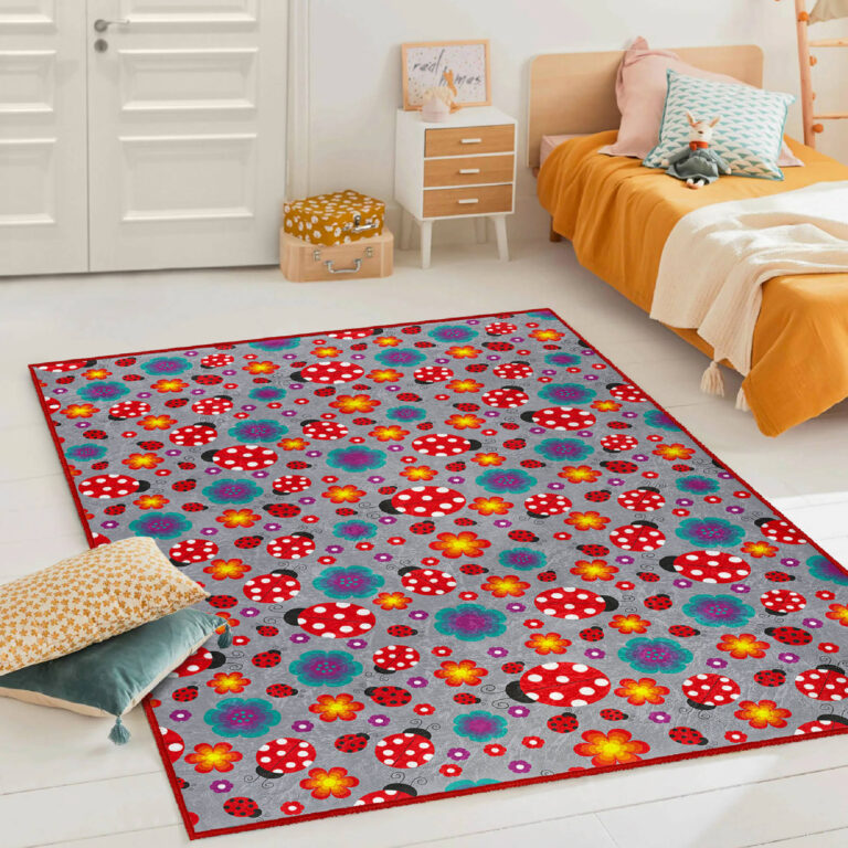 Çiçekli ve Uğur Böceği Desenli Renkli Çocuk Halısı – Makinede Yıkanabilir Kaymaz Tabanlı Dikdörtgen Halı
