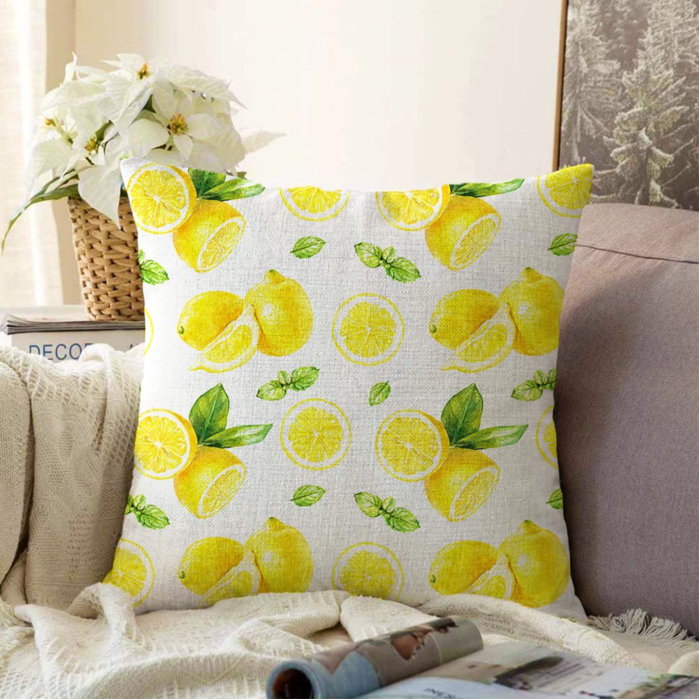 Beyaz Zeminde Limonlar Desenli Dijital Baskılı Raşel Yastık Kırlent Kılıfı