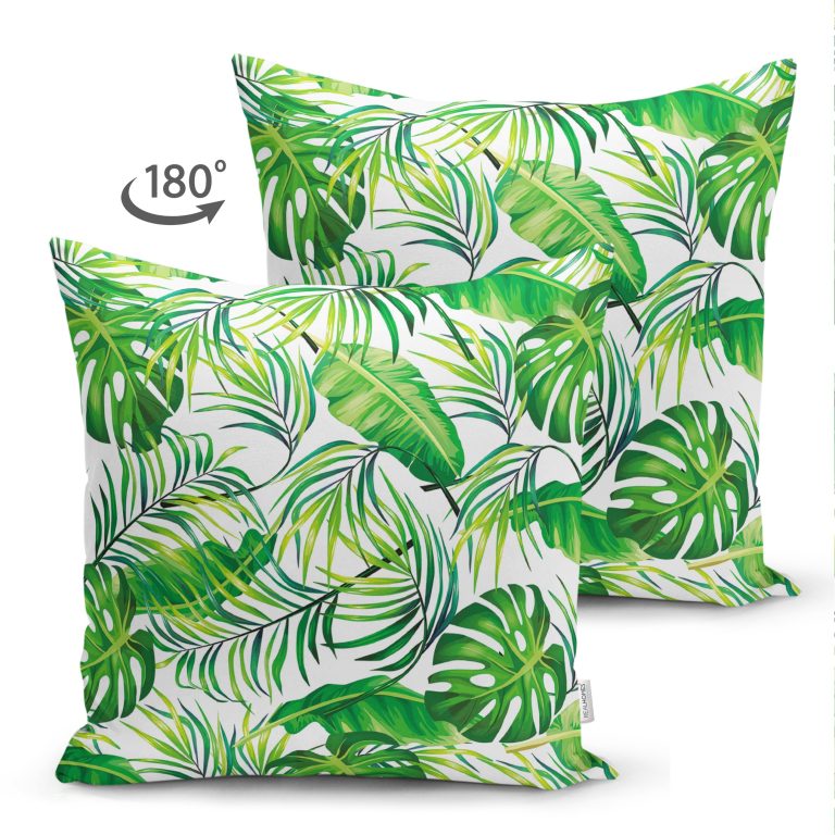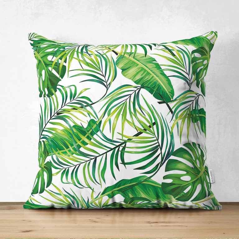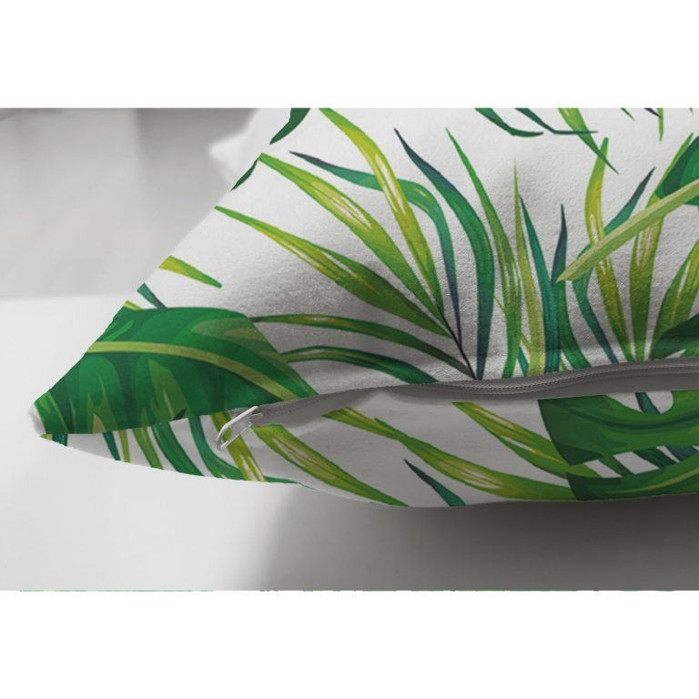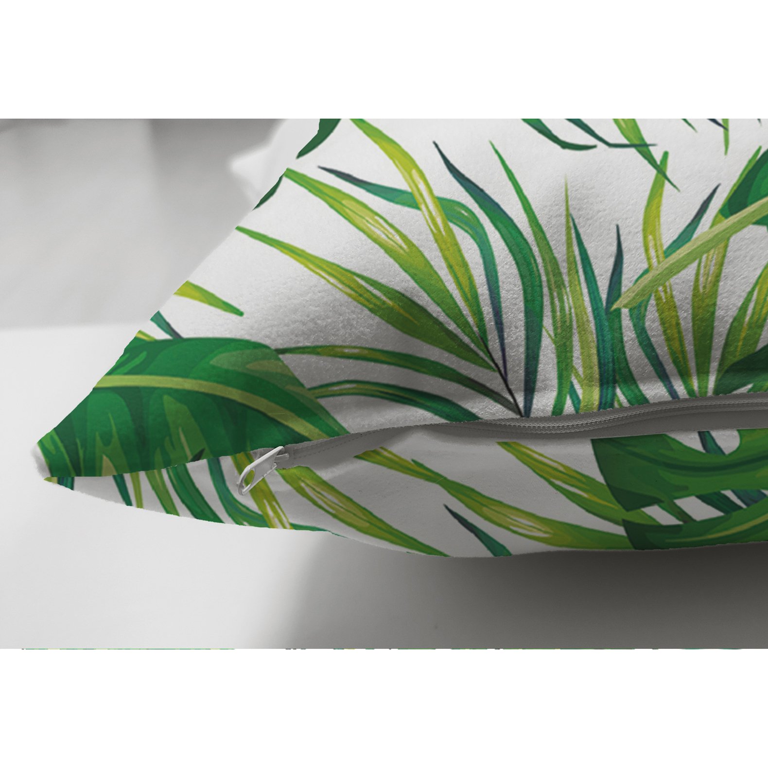 Beyaz Zeminde Yeşil Yapraklar Tasarımlı Modern Süet Yastık Kırlent Kılıfı