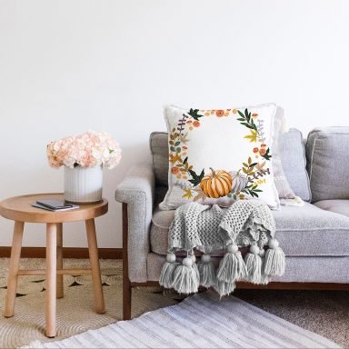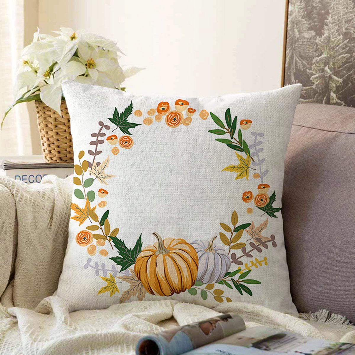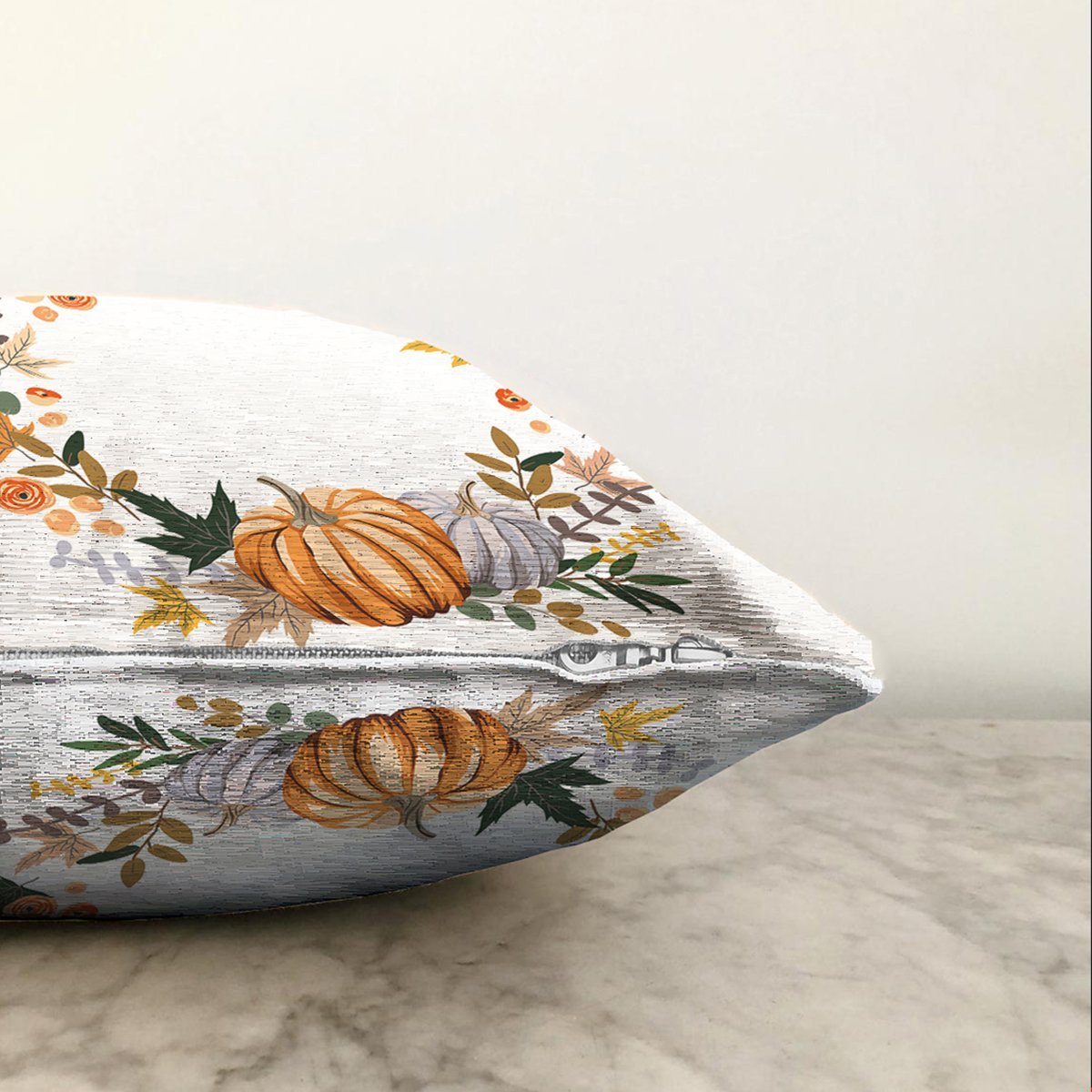 Beyaz Zeminli Bal Kabağı Desenli Dijital Baskılı Modern Raşel Yastık Kırlent Kılıfı