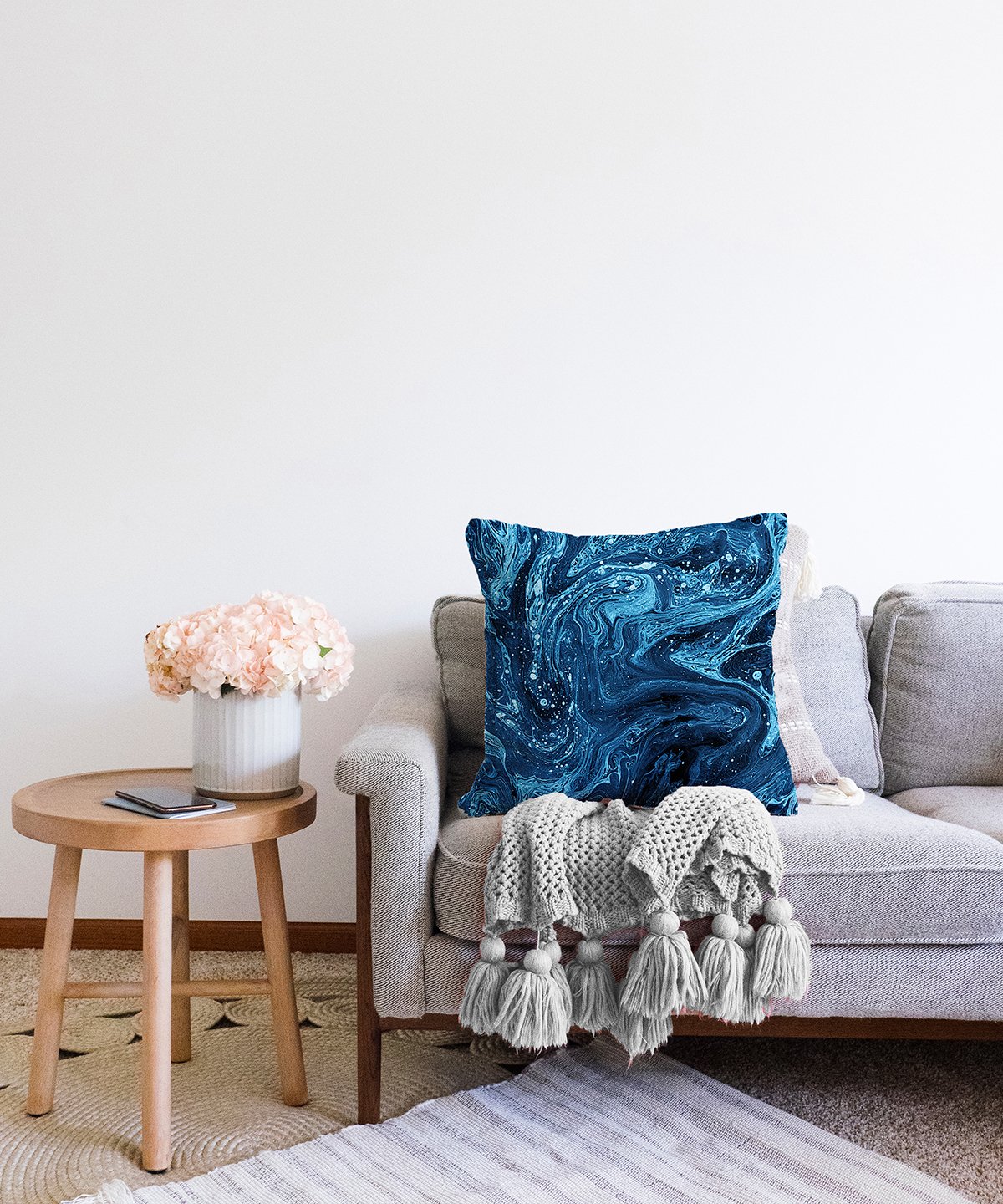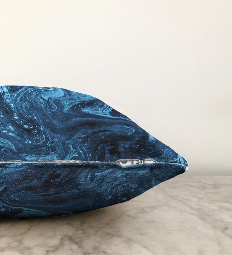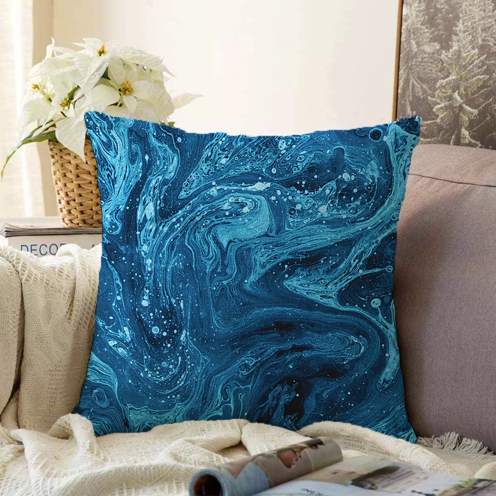 Mavi Ebru Motifleri Dijital Baskılı Raşel Yastık Kırlent Kılıfı