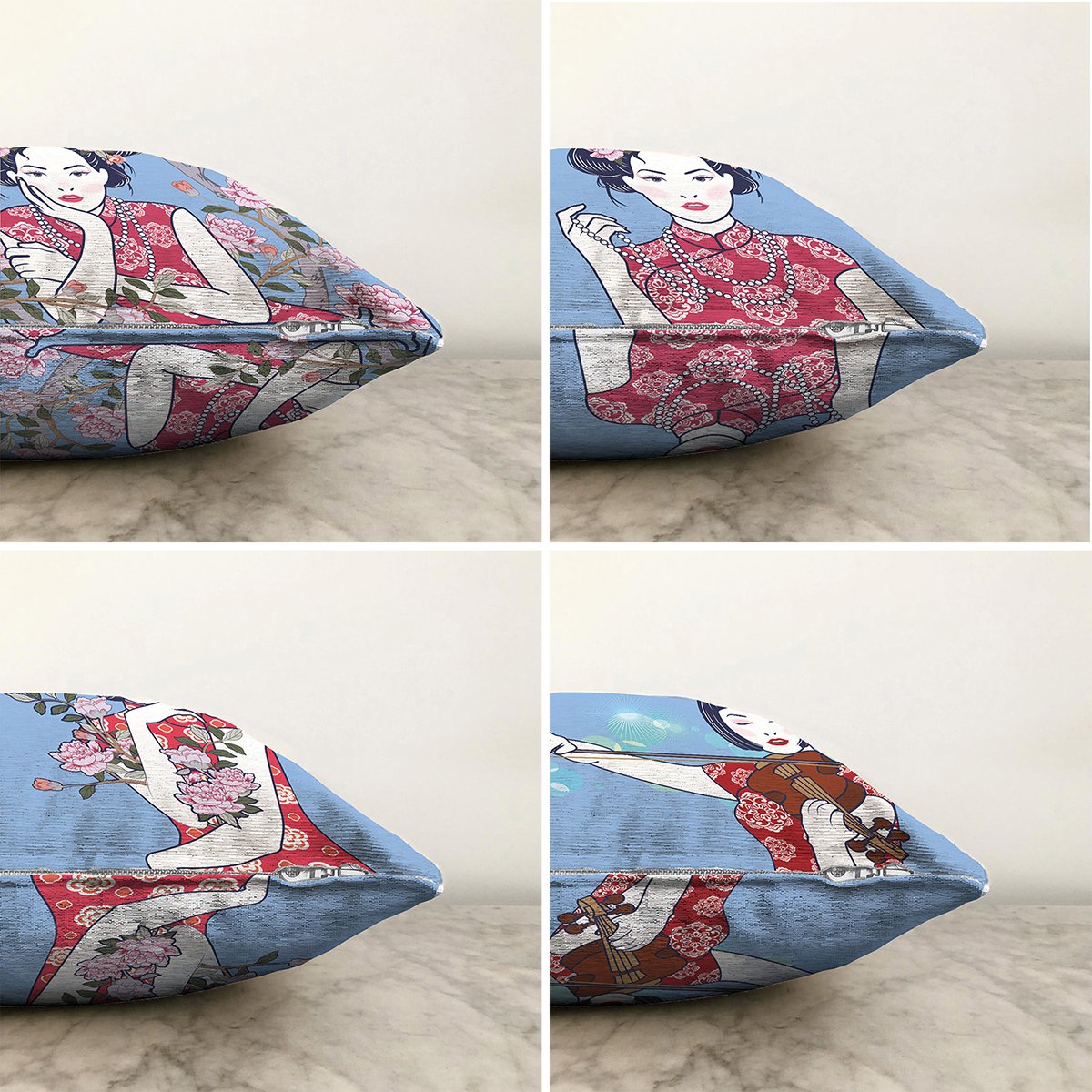 Mavi Zemin Üzerimde Japon Kız Motifli 4’Lü Raşel Kadife Kırlent Kılıf Seti