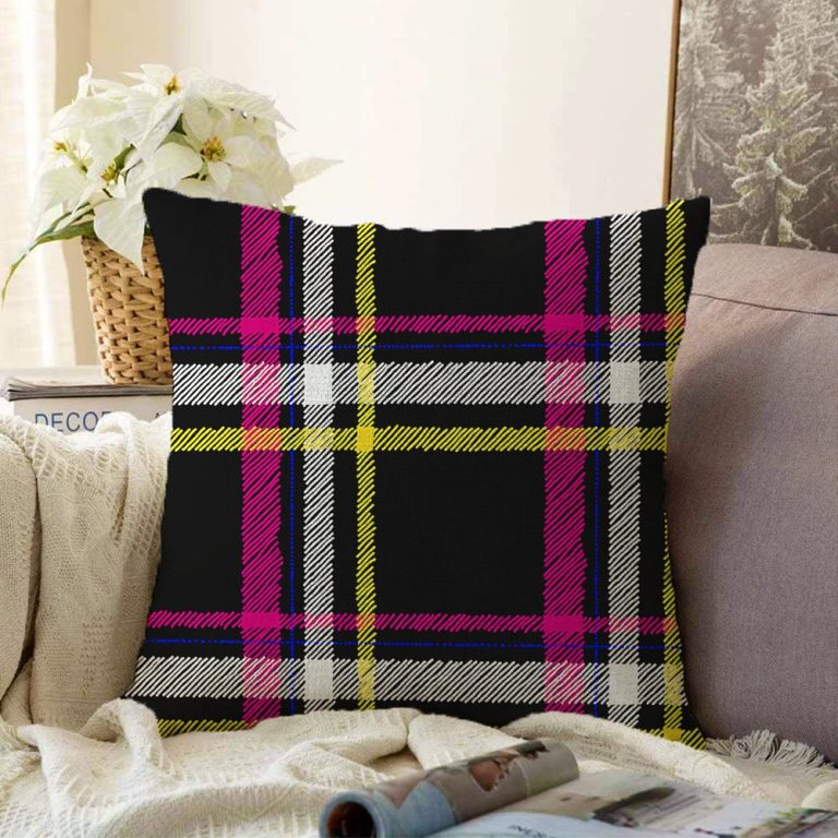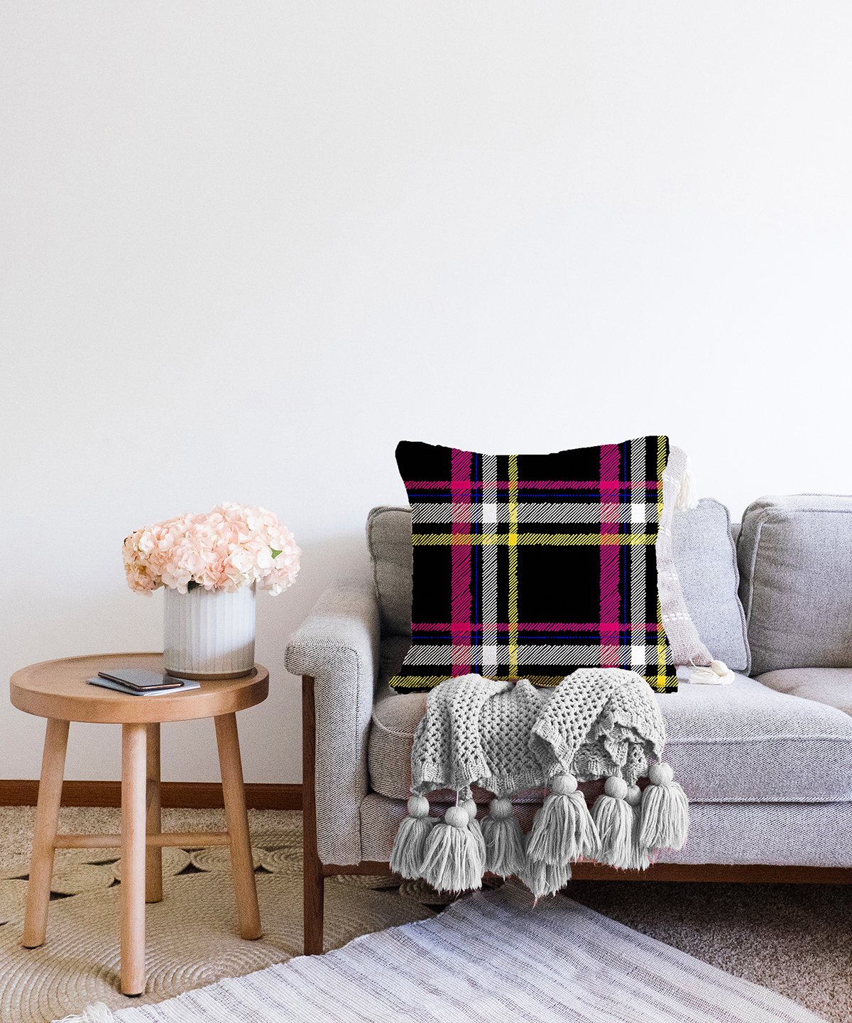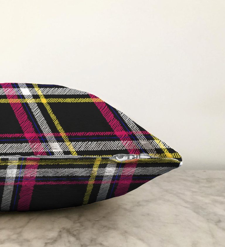 Siyah Sarı Pembe Ekose Desenli Dijital Baskılı Dekoratif Raşel Yastık Kırlent Kılıfı