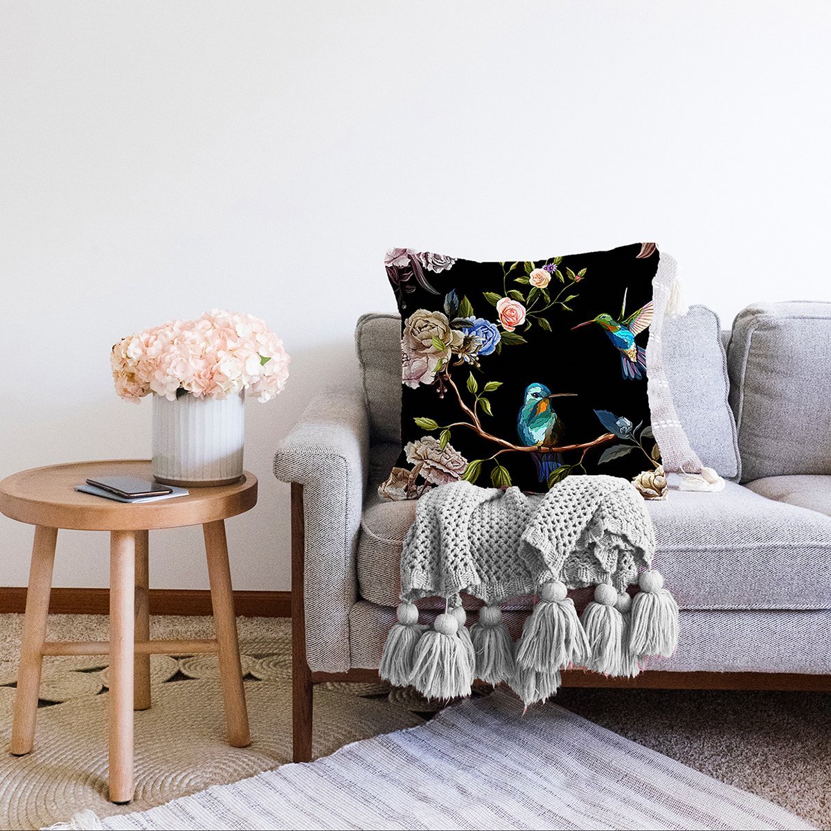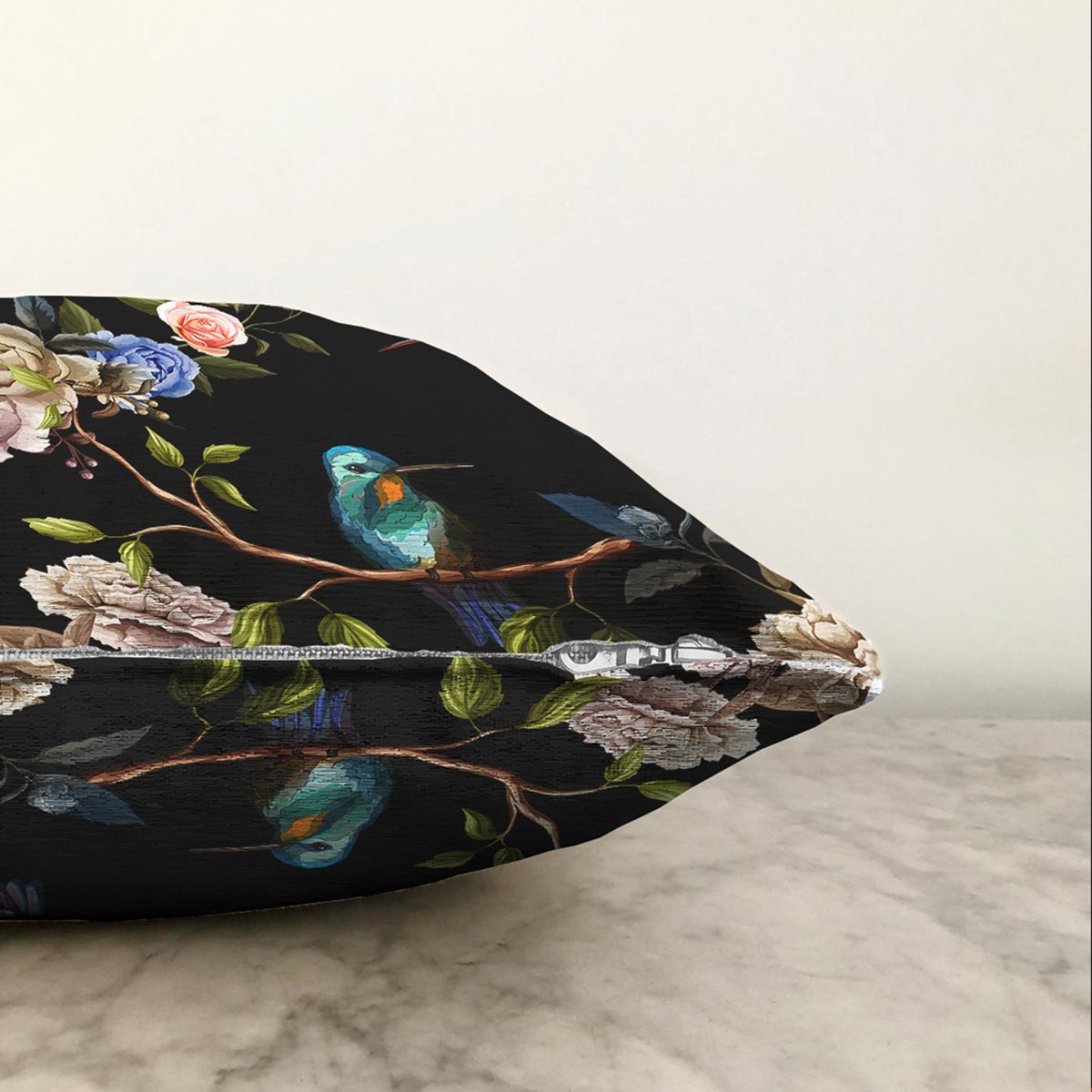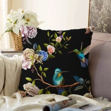 Siyah Zemin Üzerinde Kuş Desenli Dijital Baskılı Modern Raşel Yastık Kırlent Kılıfı