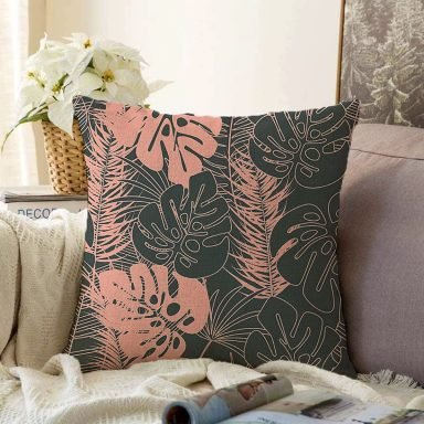Siyah Zemin Üzerinde Pastel Renkli Yaprak Desenli Modern Raşel Yastık Kırlent Kılıfı