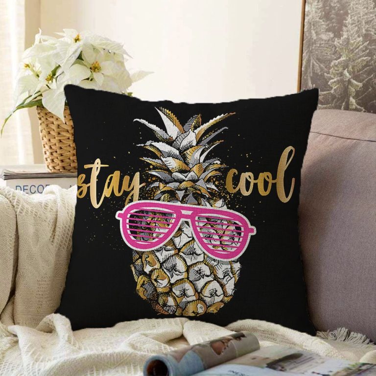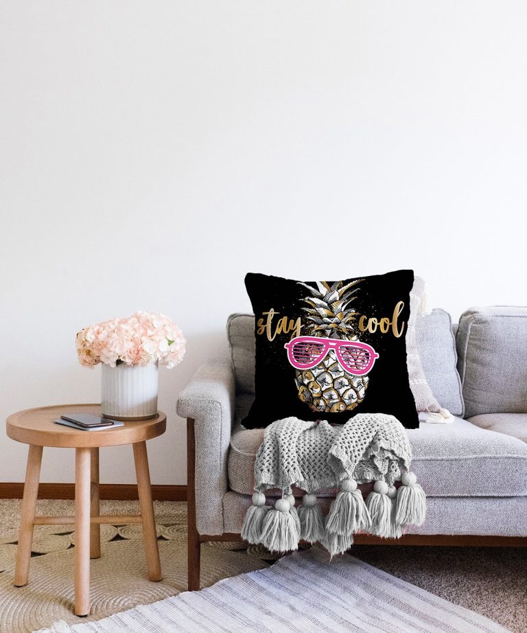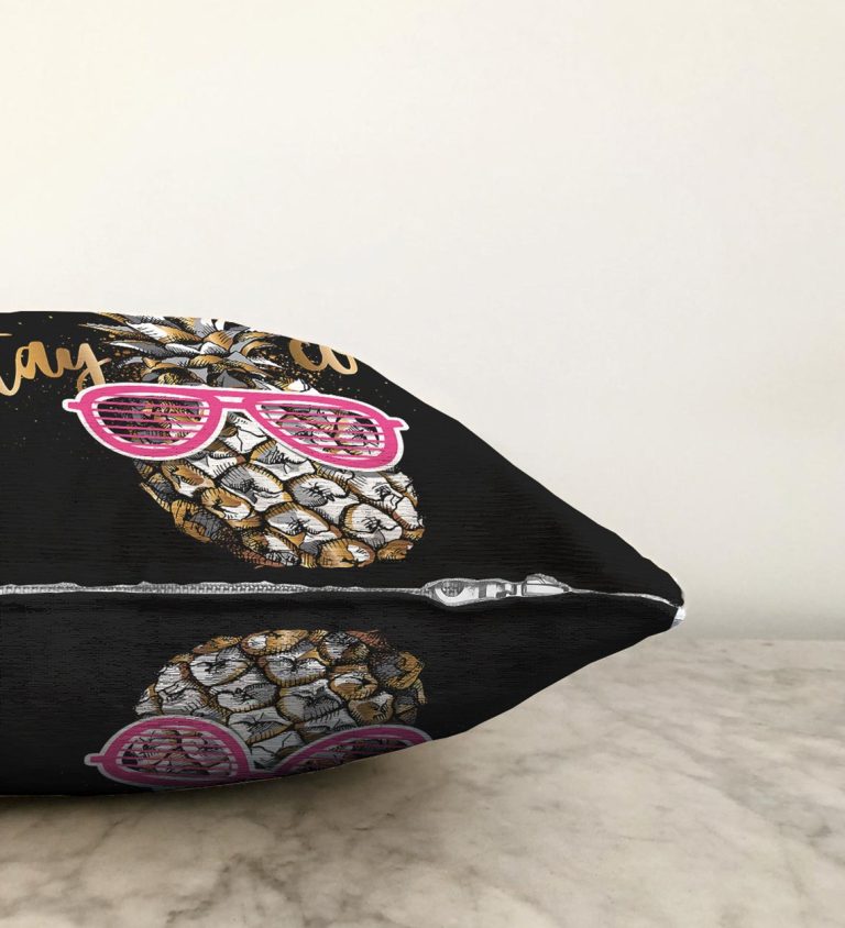 Siyah Zeminde Cool Ananas Desenli Modern Raşel Yastık Kırlent Kılıfı