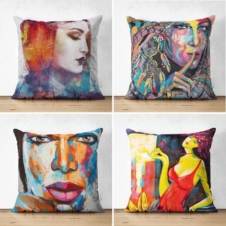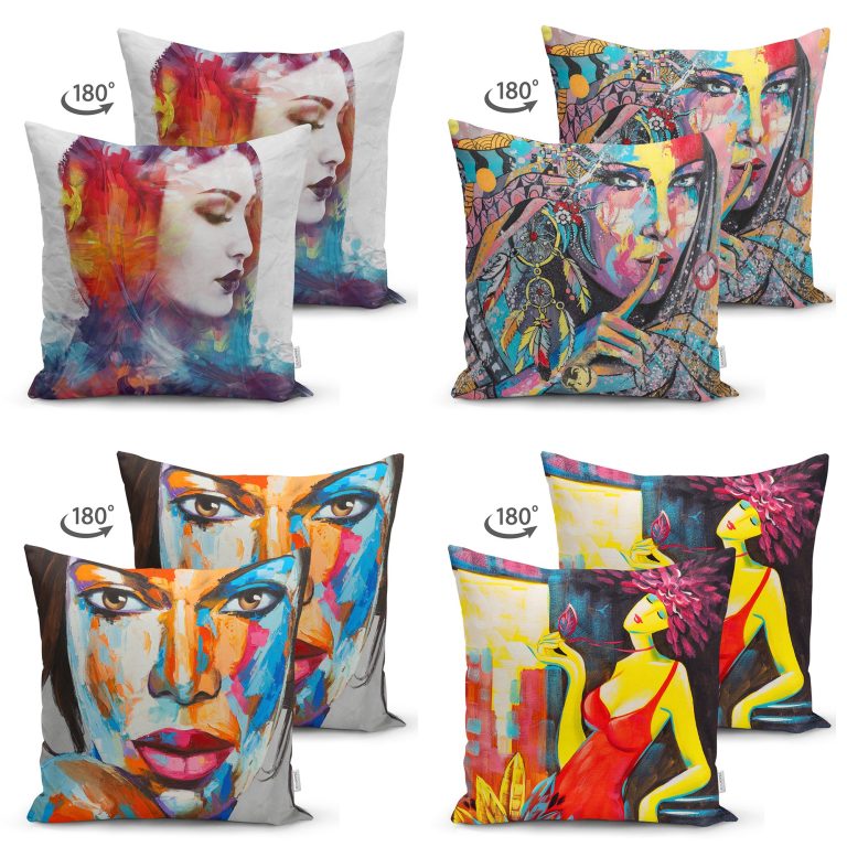 Soyut Sulu Boya Çizimli Fashion Girl Tasarımlı 4’Lü Süet Kırlent Kılıf Seti
