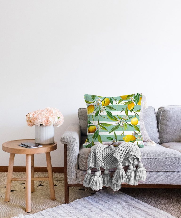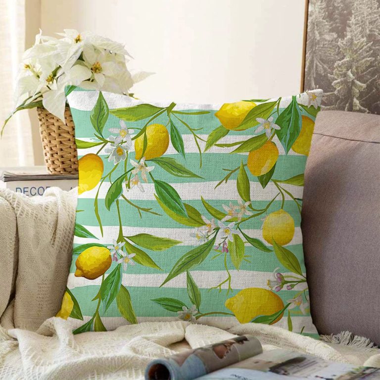 Yeşil Çizgili Limon Desenli Dijital Baskılı Dekoratif Raşel Yastık Kırlent Kılıfı