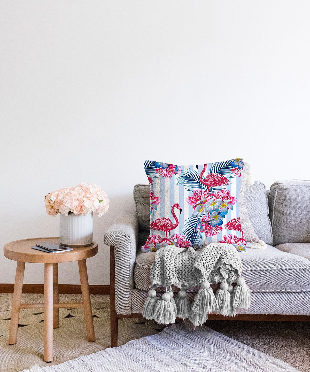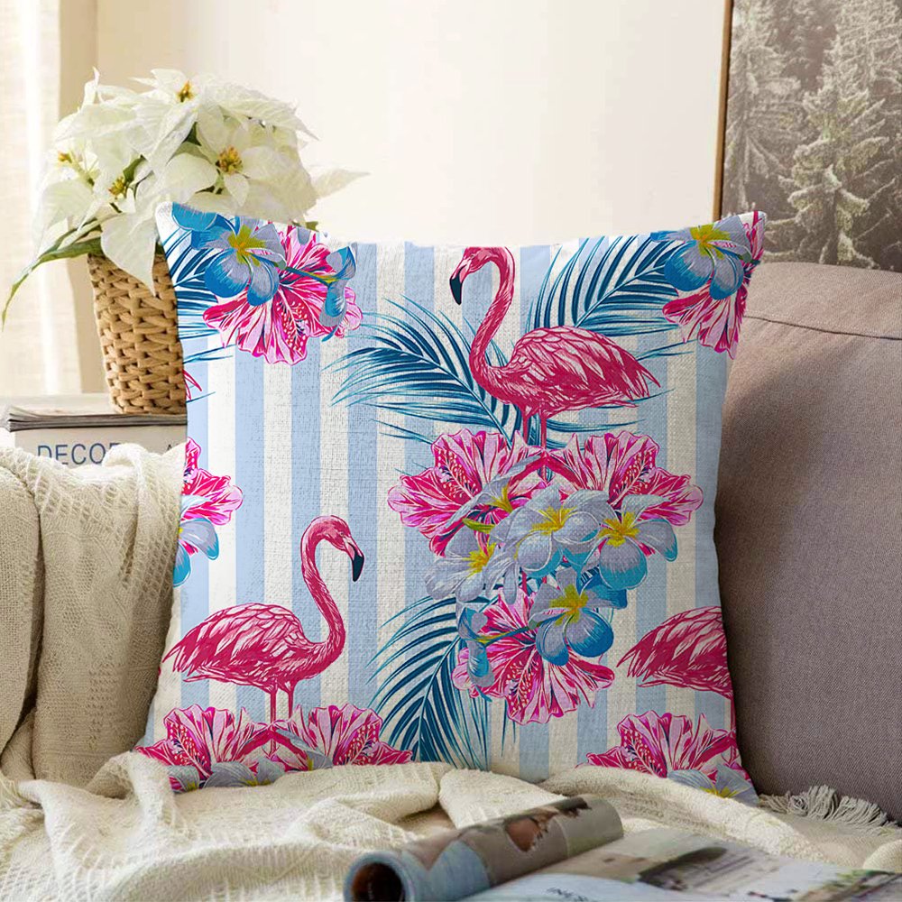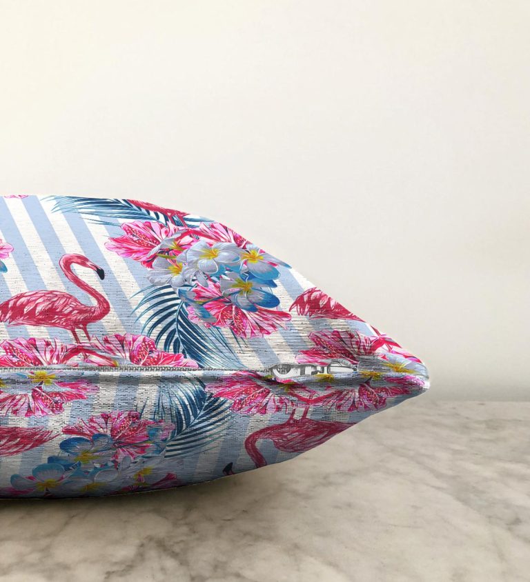 Çizgili Flamingo Zeminli Dekoratif Raşel Yastık Kırlent Kılıfı