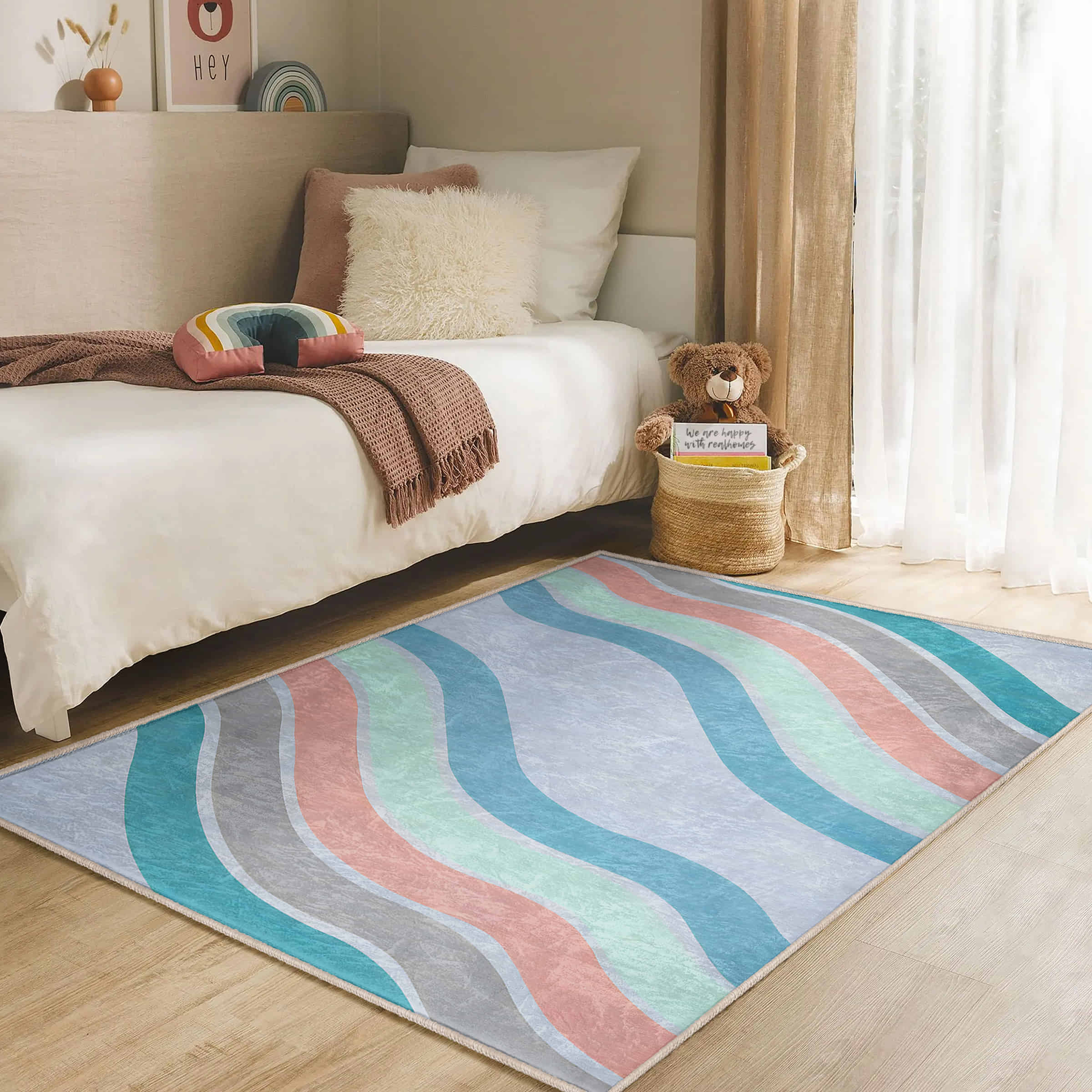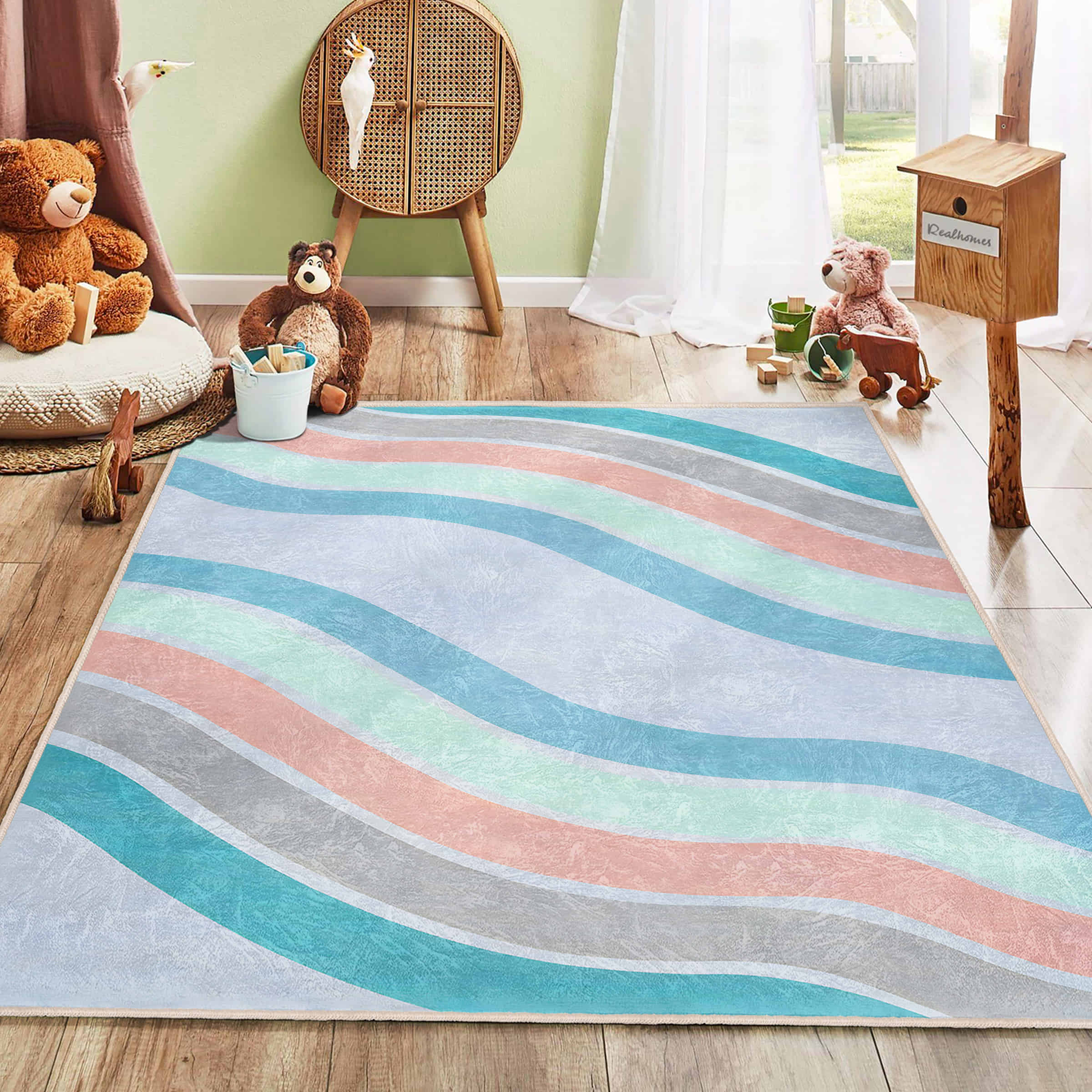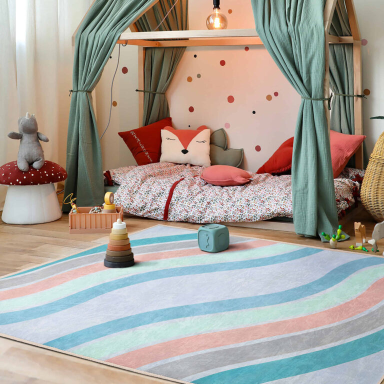Çizgili Pastel Renklerde Eğlenceli Design Çocuk Halısı – Makinede Yıkanabilir Kaymaz Tabanlı Halı
