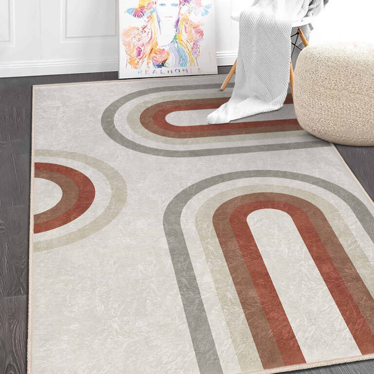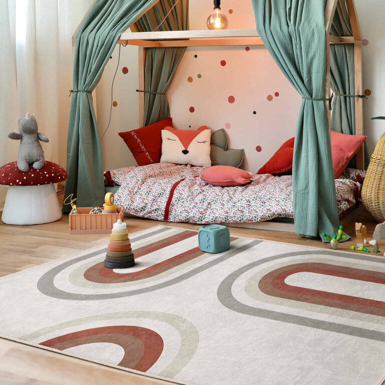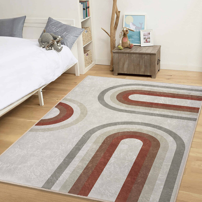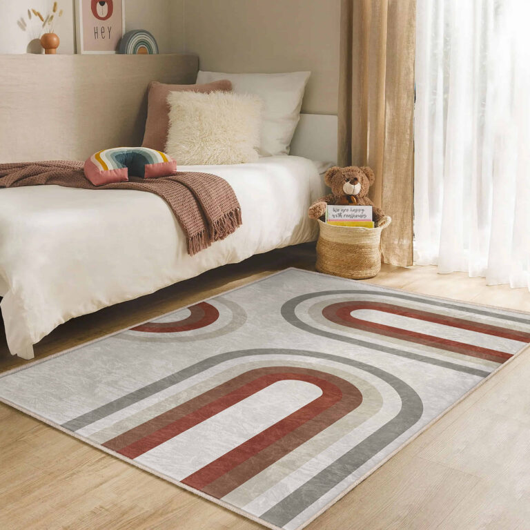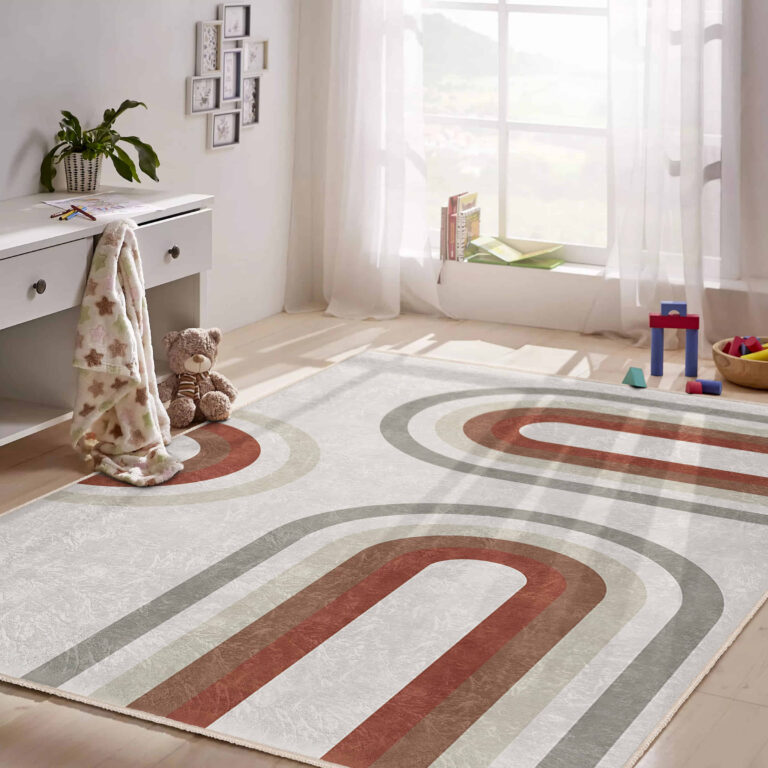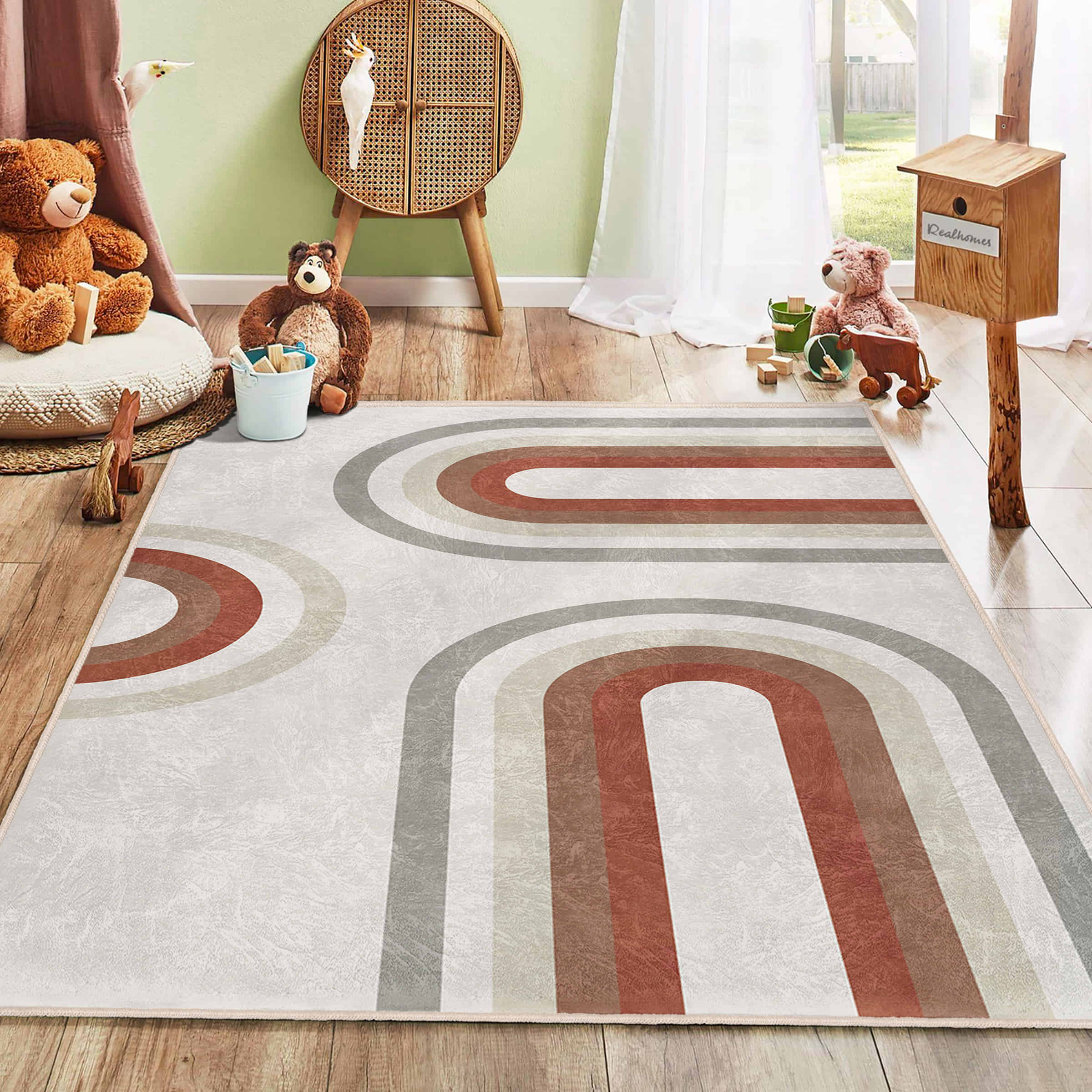 Çizgili Retro Desenli Modern Renklerle Tasarlanmış Kaymaz Tabanlı Çocuk Halısı – Makinede Yıkanabilir Dikdörtgen Halı