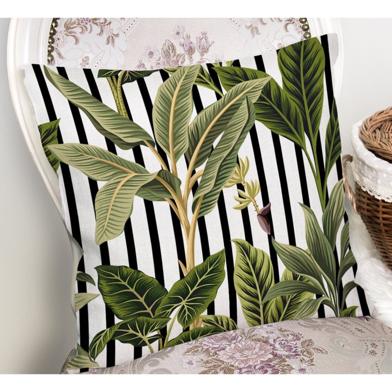 Çizgili Zemin Tropik Yaprak Motifli Modern Yastık Kırlent Kılıfı