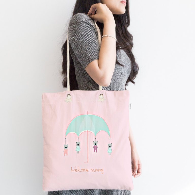 Çocuk Çantası – Pembe Zeminde Şemsiye ve Sevimli Ayıcıklar Motifli Kumaş Çanta