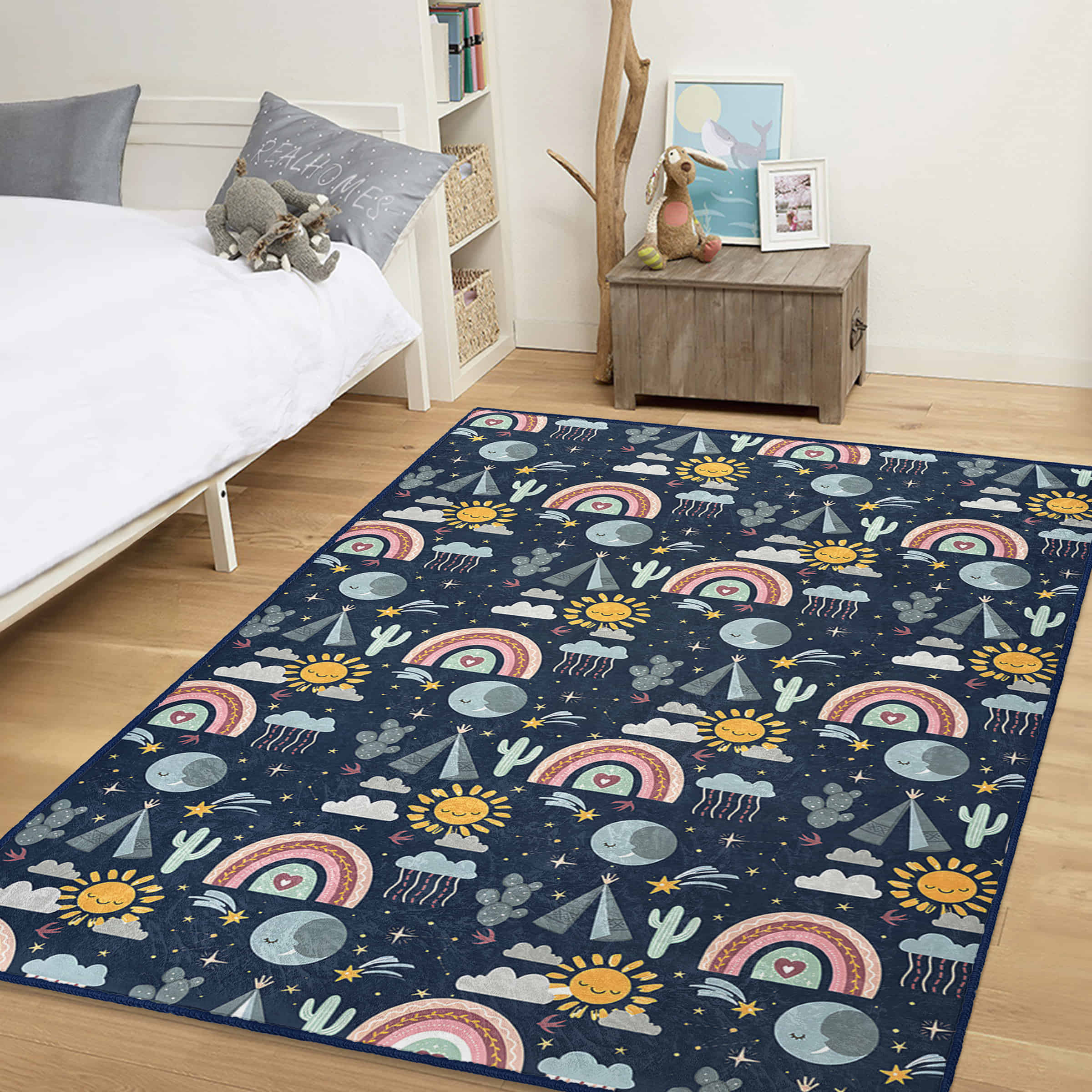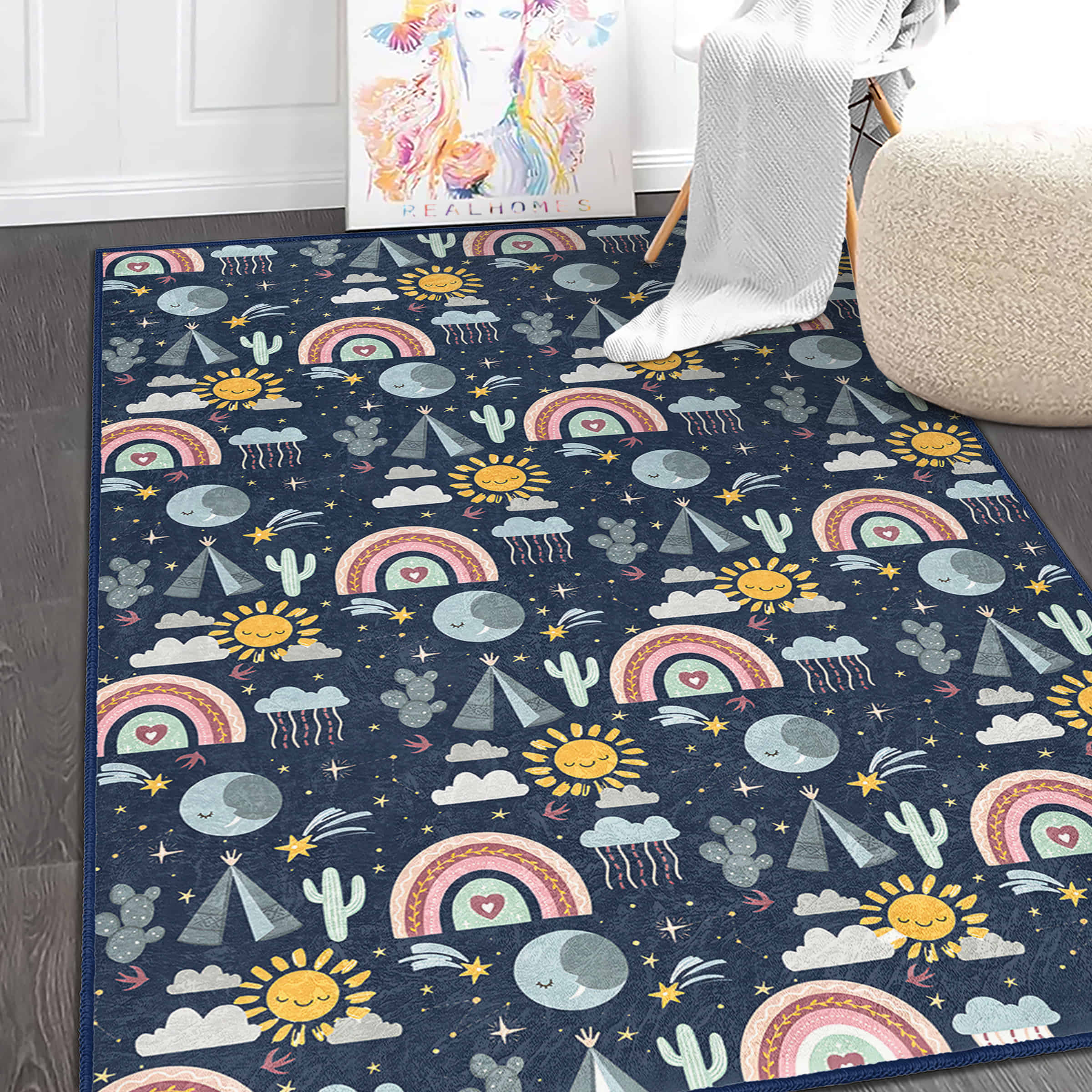 Çocuk Odası İçin Renkli Gökkuşağı Motifli 3D Dijital Baskılı Makinede Yıkanabilir Kaymaz Taban Halı