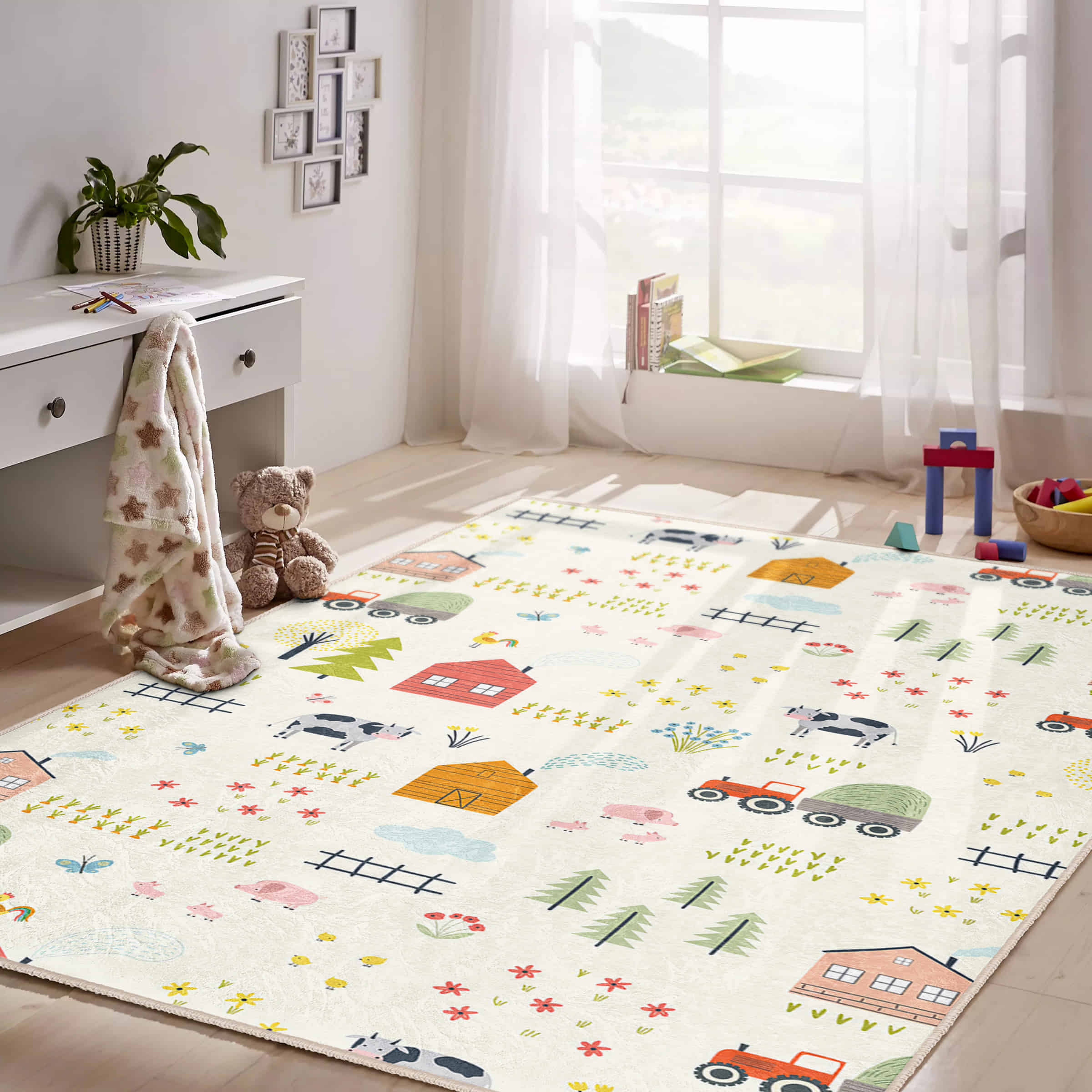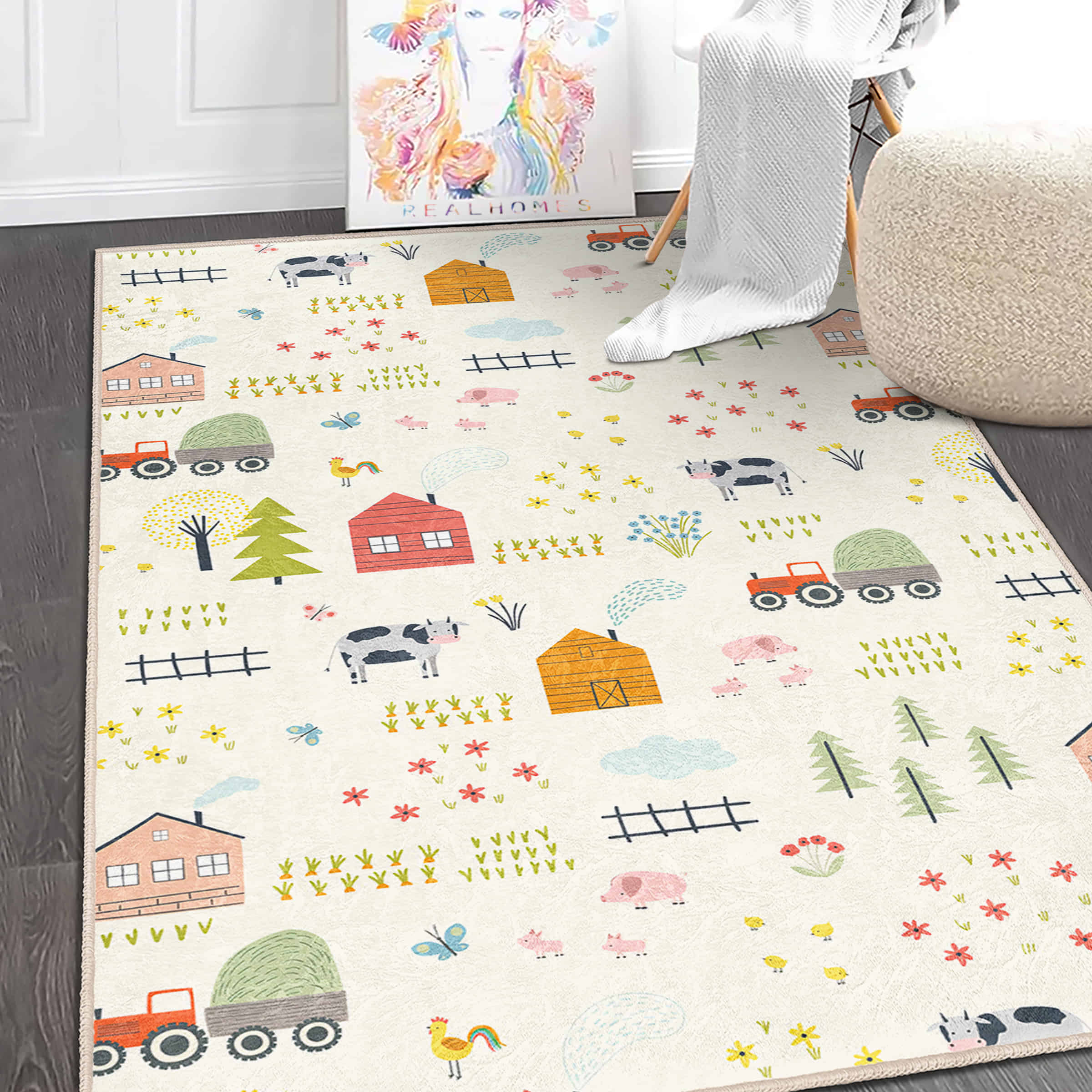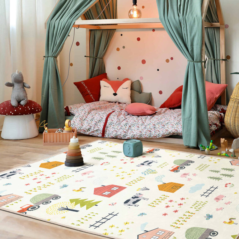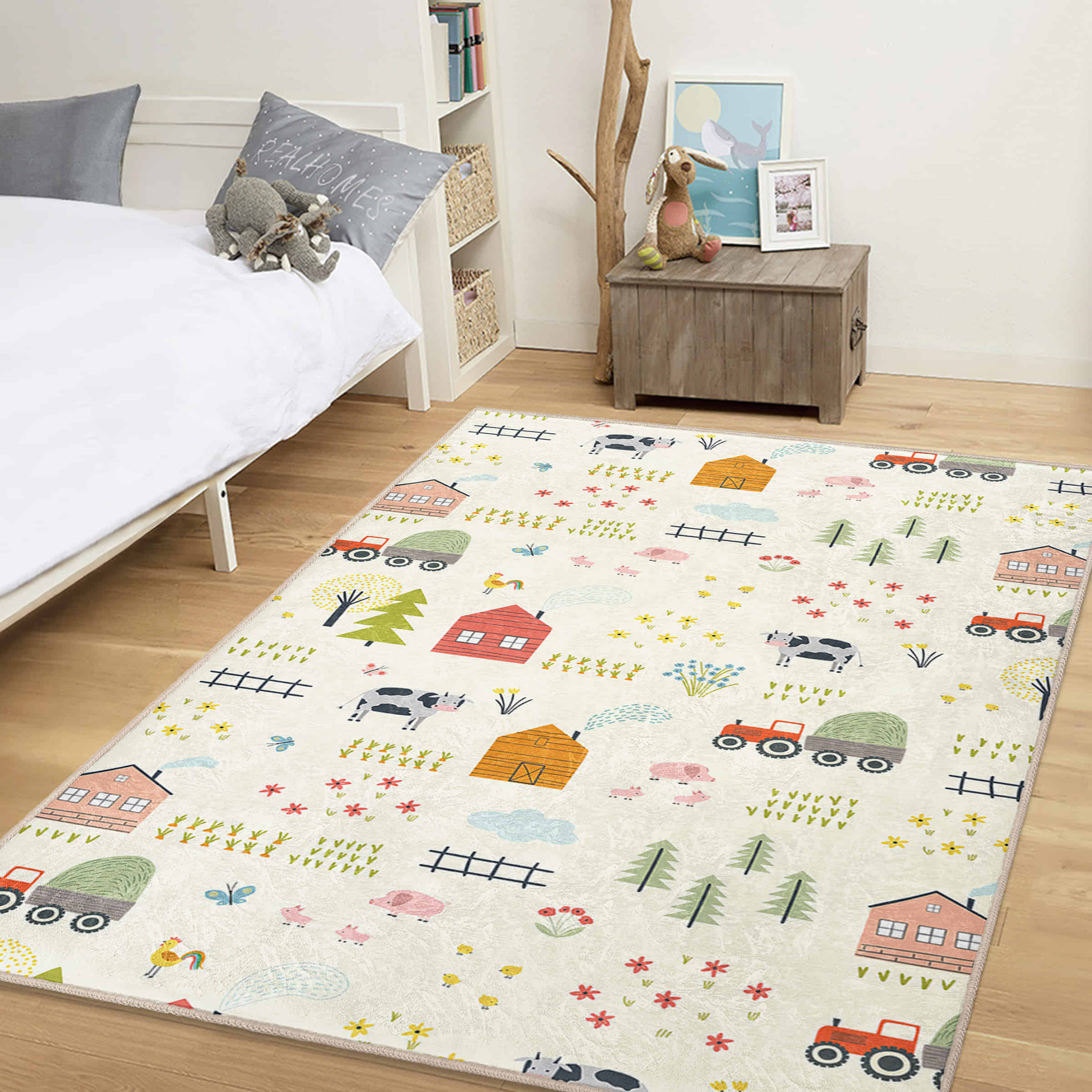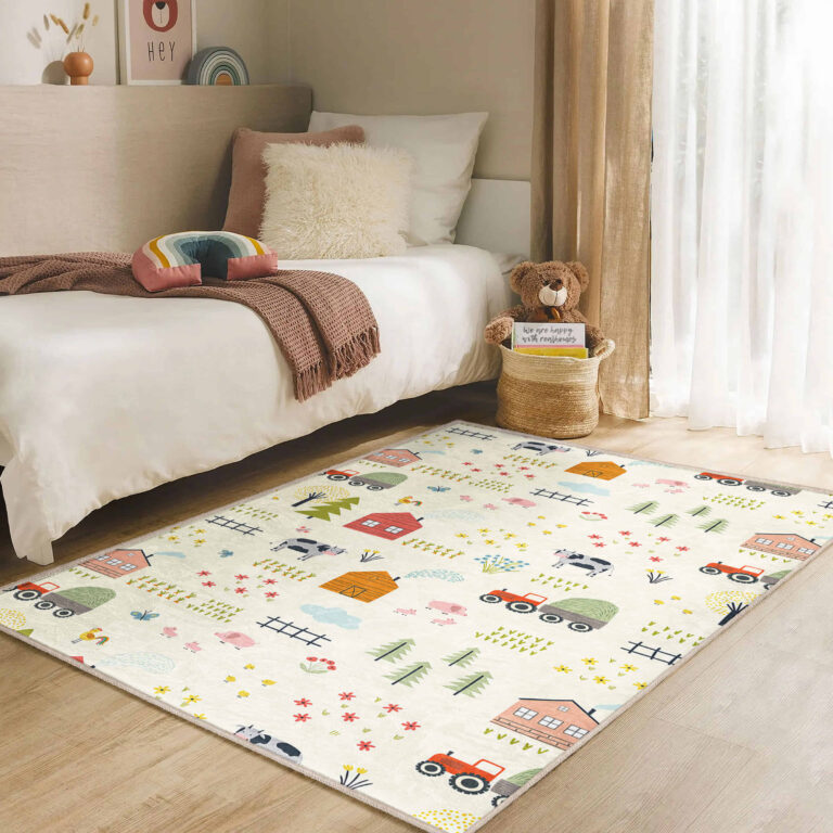 Çocuk Odası için Sevimli Çiftlik Temalı Renkli Desenli Dikdörtgen Yıkanabilir Kaymaz Taban Halı