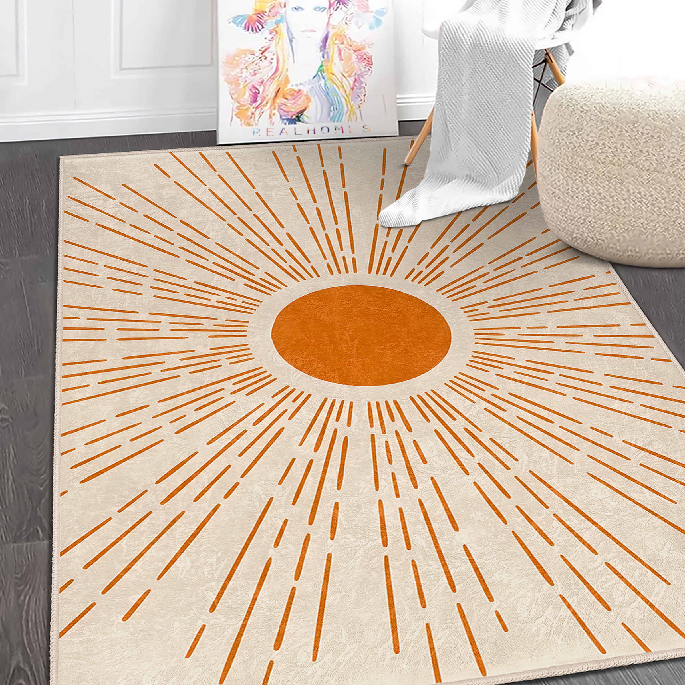Çocuk Odası için Turuncu ve Krem Güneş Desenli Dikdörtgen Yıkanabilir Kaymaz Taban Halı