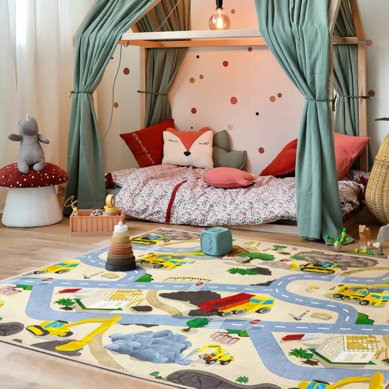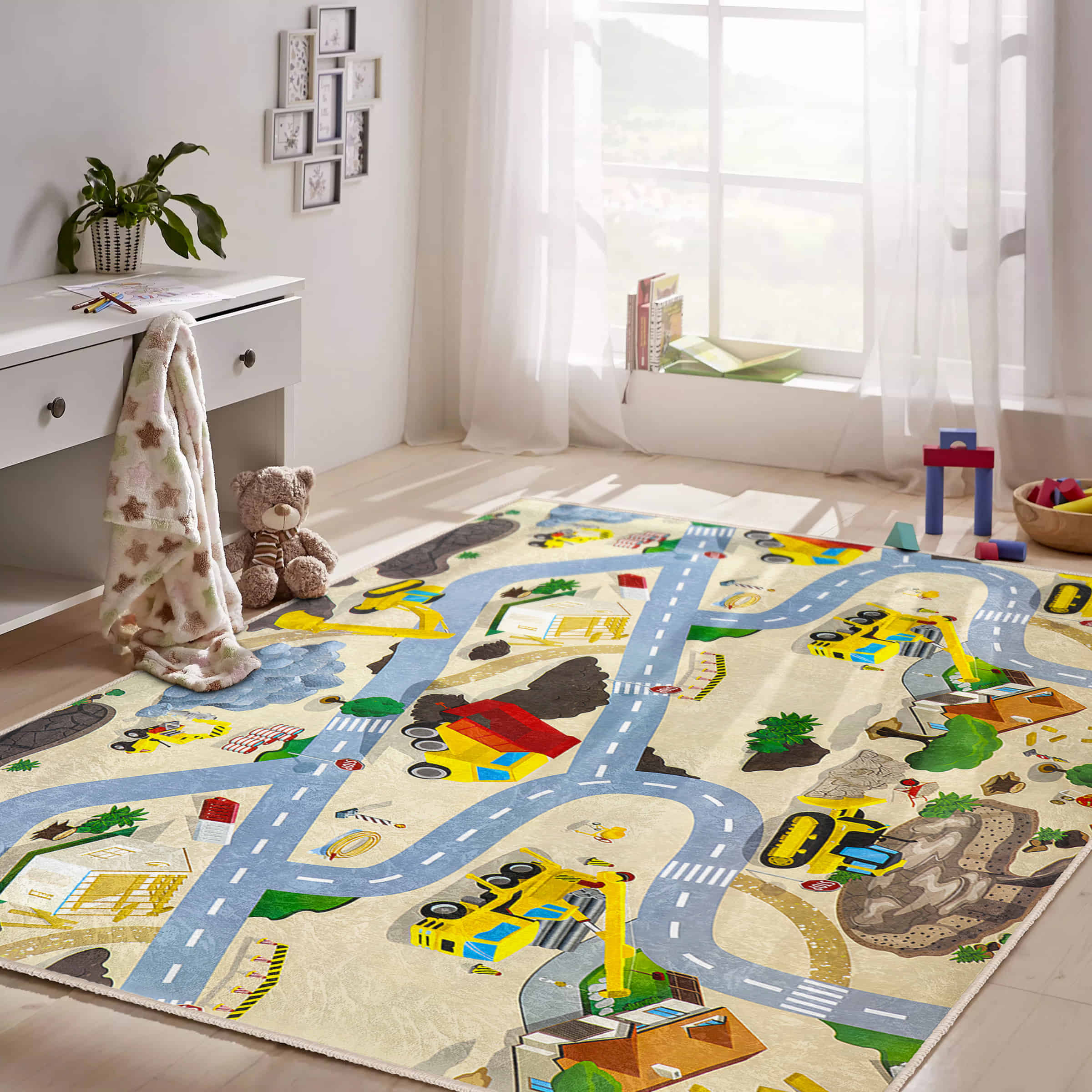 Çocuklar İçin İnşaat Temalı Canlı Renklerde Kaymaz Tabanlı Makinede Yıkanabilir Dikdörtgen Halı