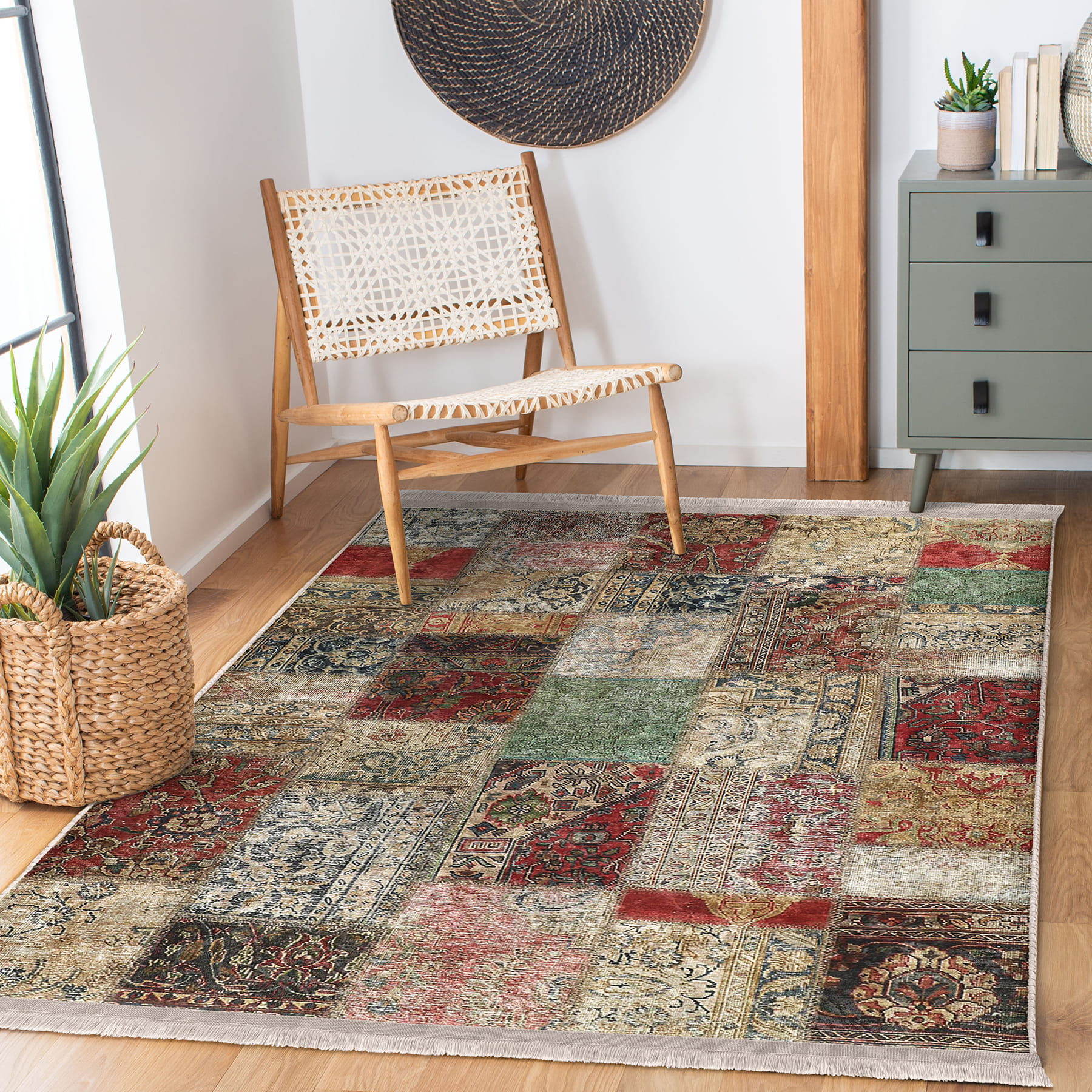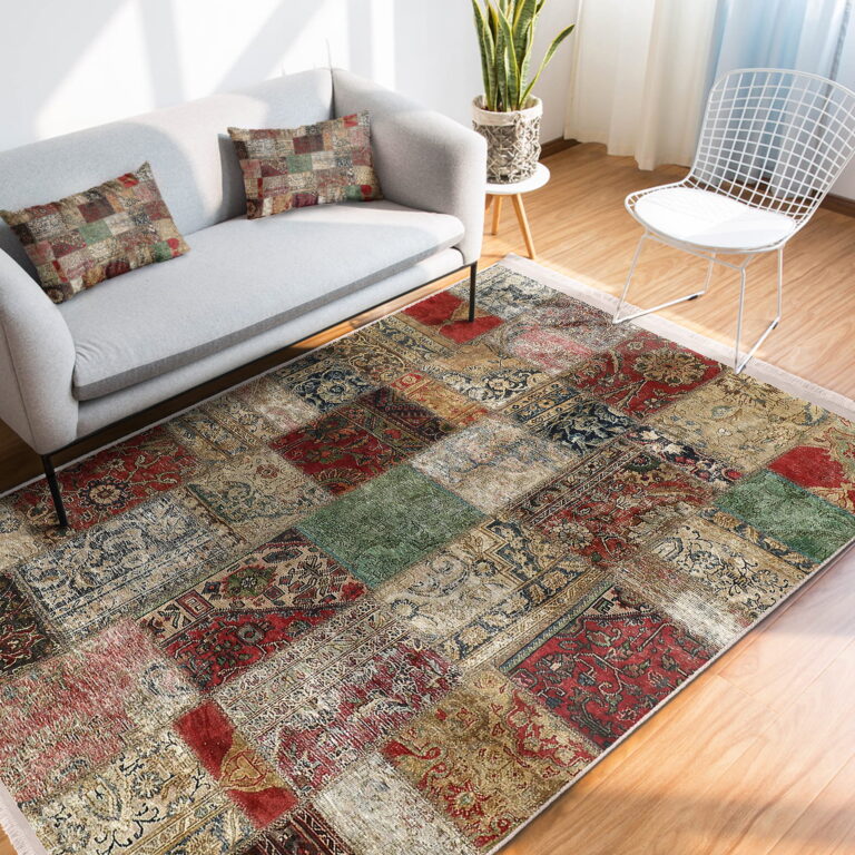 Çok Renki Zeminde Patchwork Motifli Eskitme Desenli Etnik Motifler Vintage Salon & Oturma Odası Koridor & Antre Dijital Baskılı Makinede Yıkanabilir Kaymaz Taban Saçaklı Halı