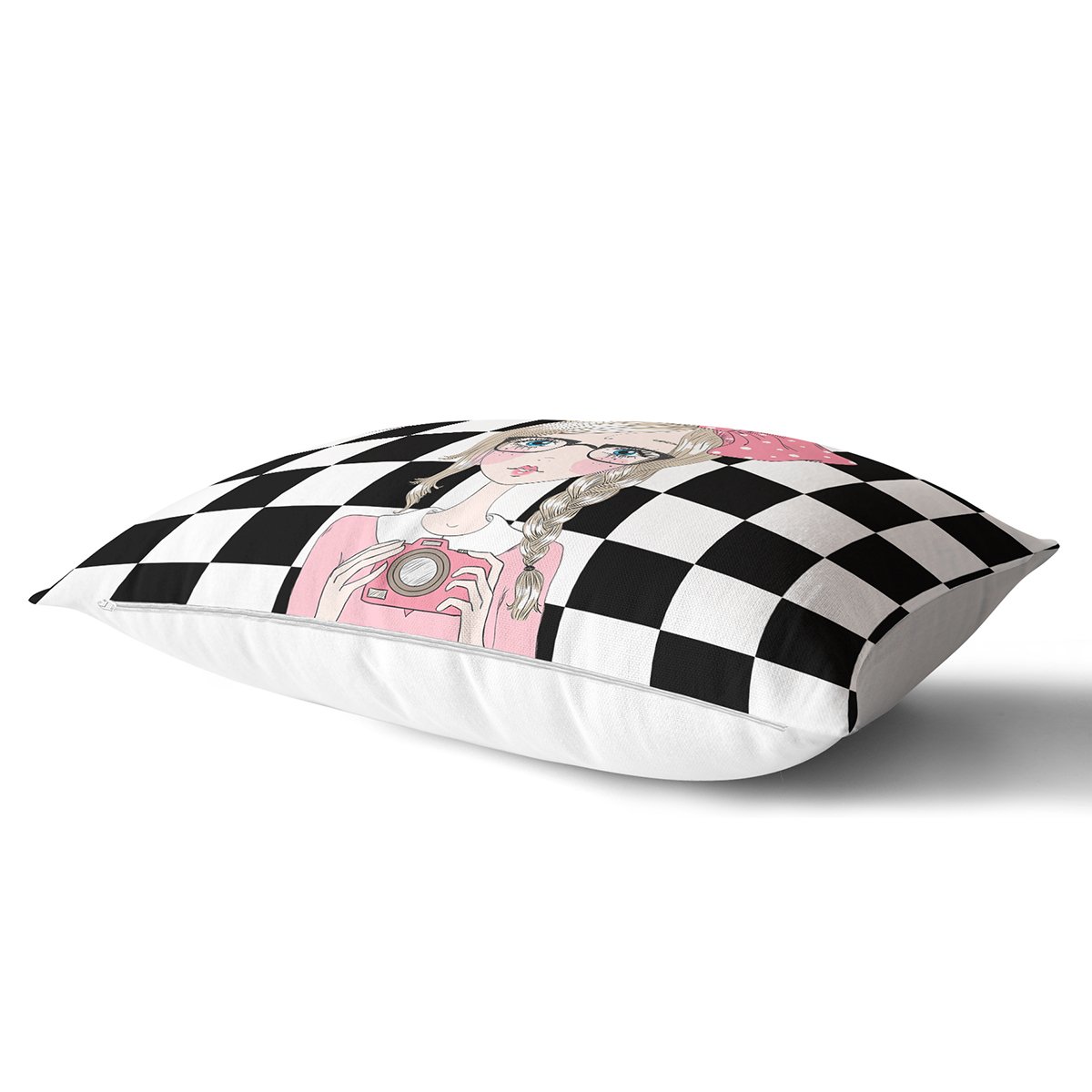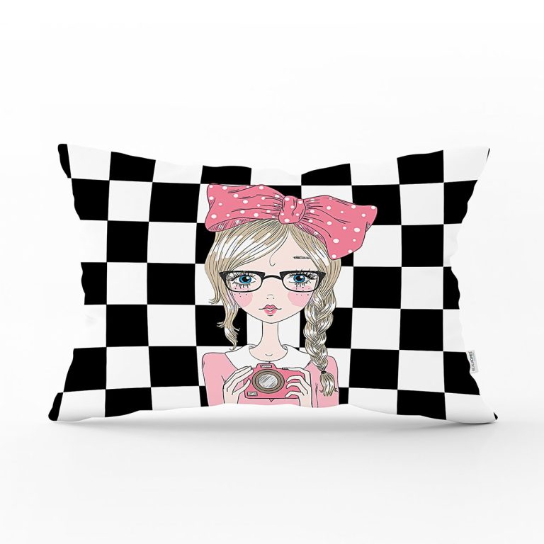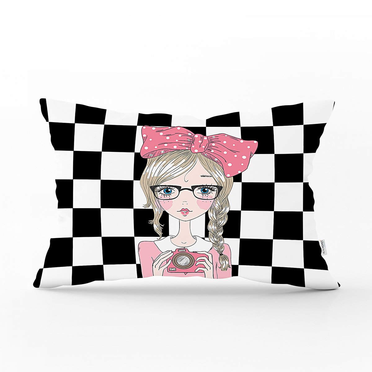 Dama Zeminli Fotoğraf Çeken Kız Tasarımlı Dijital Baskılı Dekoratif Dikdörtgen Kırlent Kılıfı