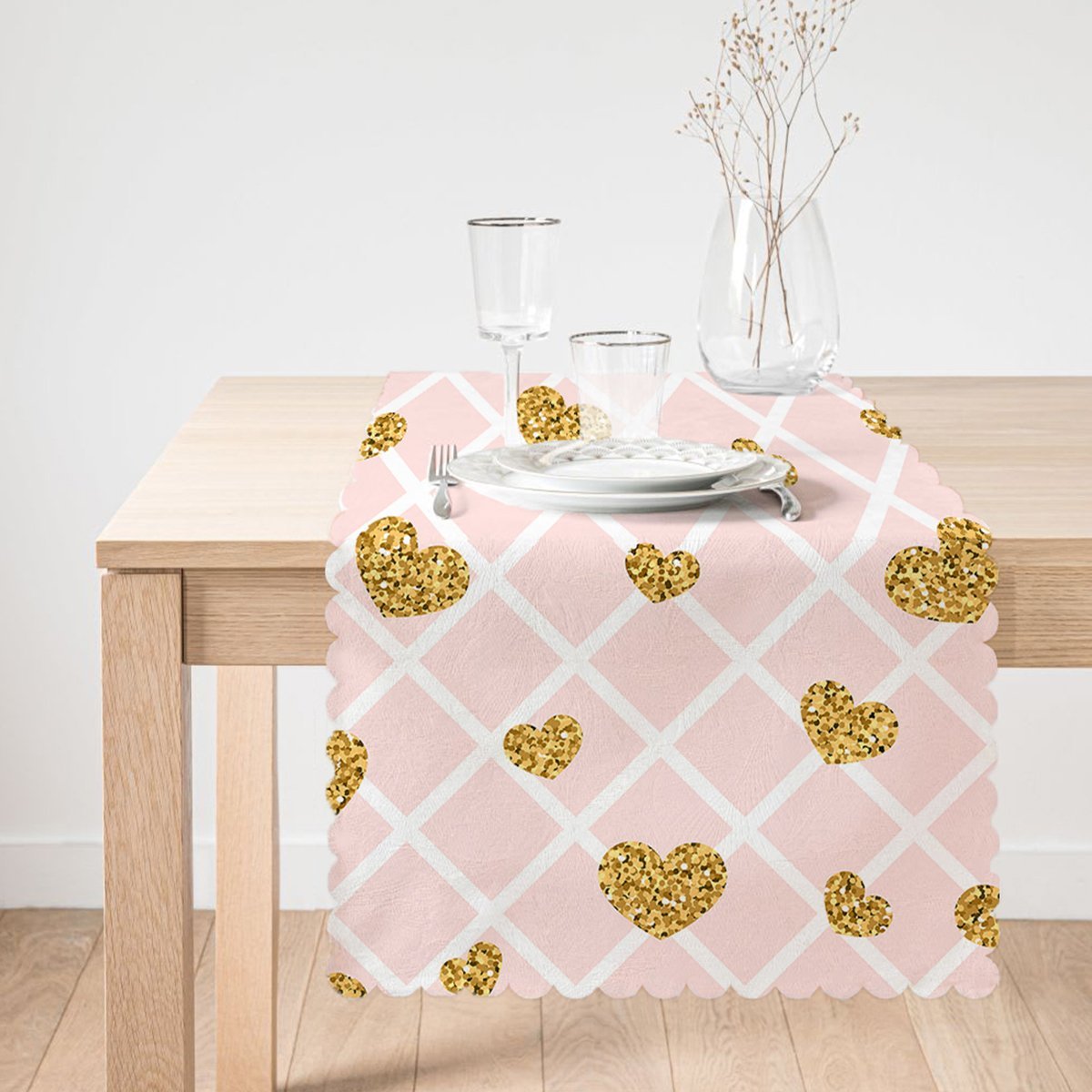 Damalı Pudra Renkli Altın Kalpler Özel Tasarım Runner