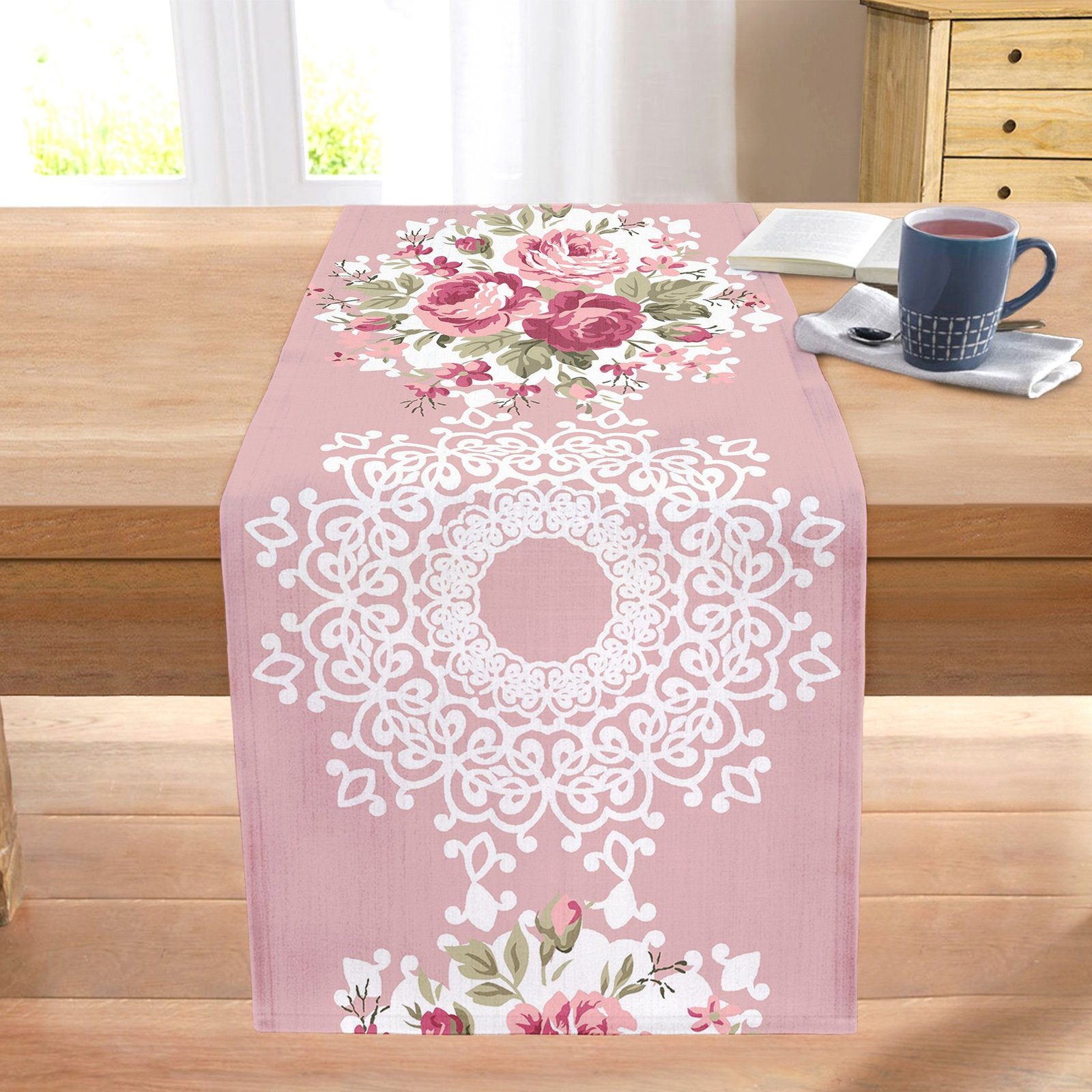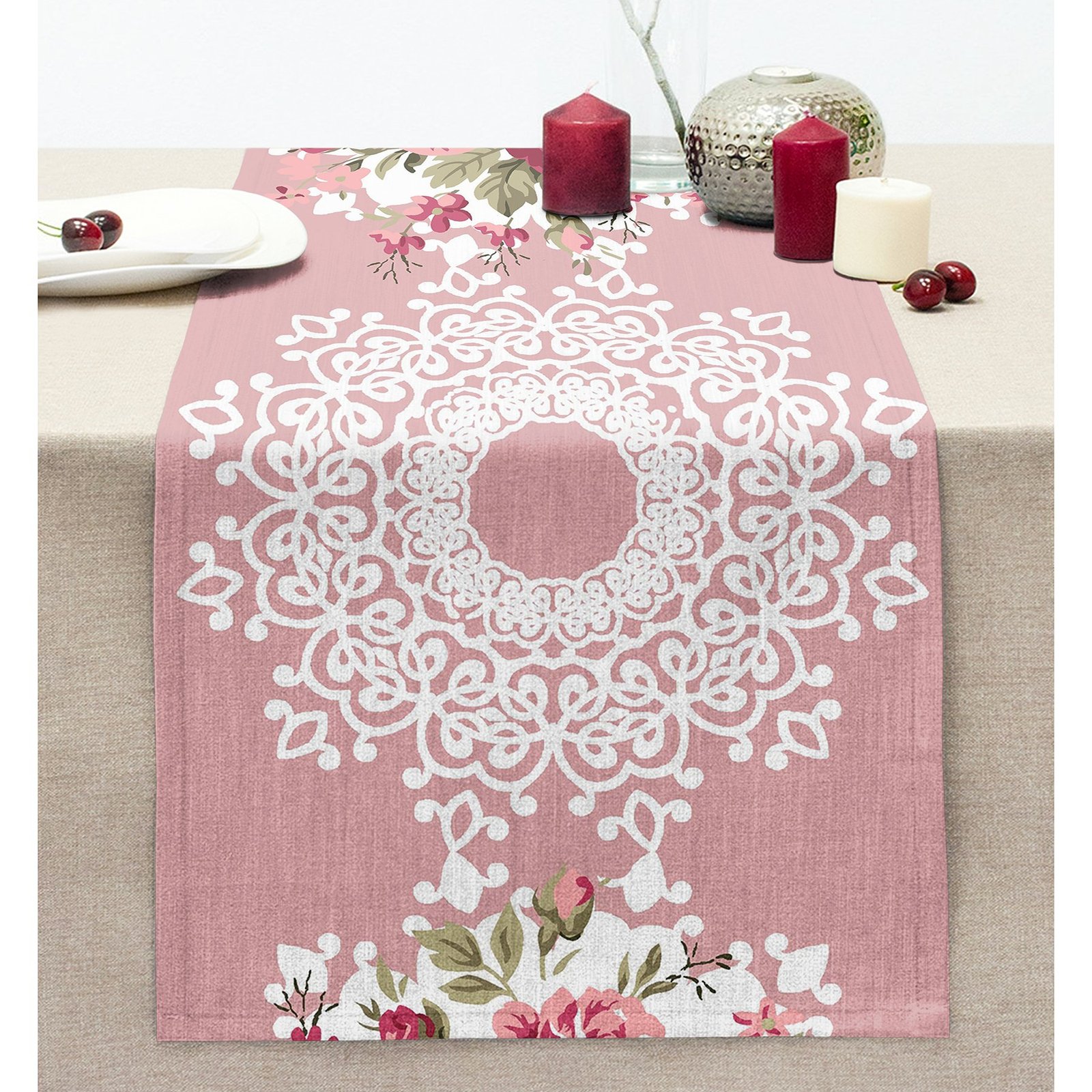 Damask Temalı Gül Tasarımlı Dijital Baskılı Dikişli Şönil Runner