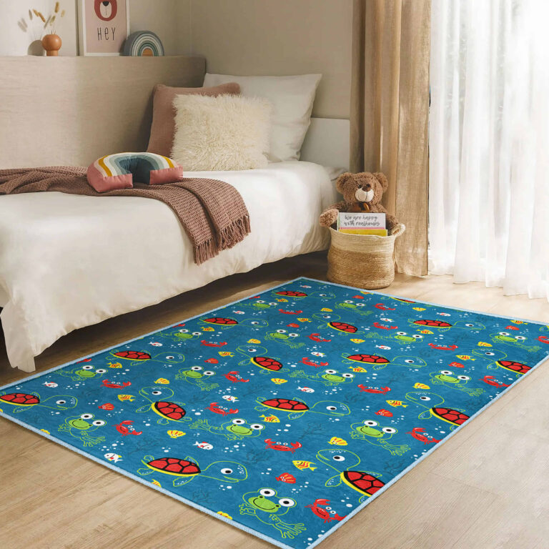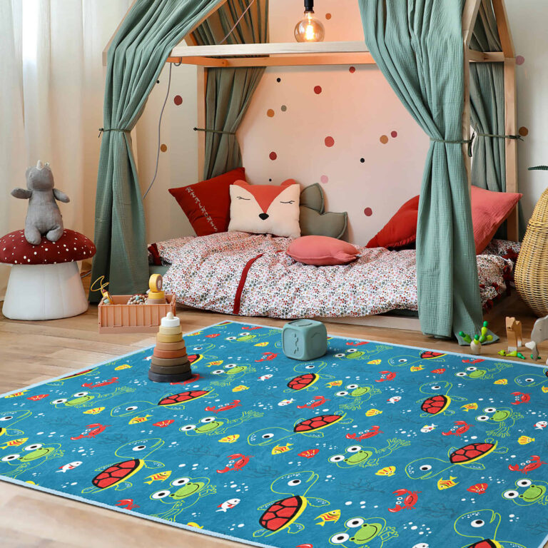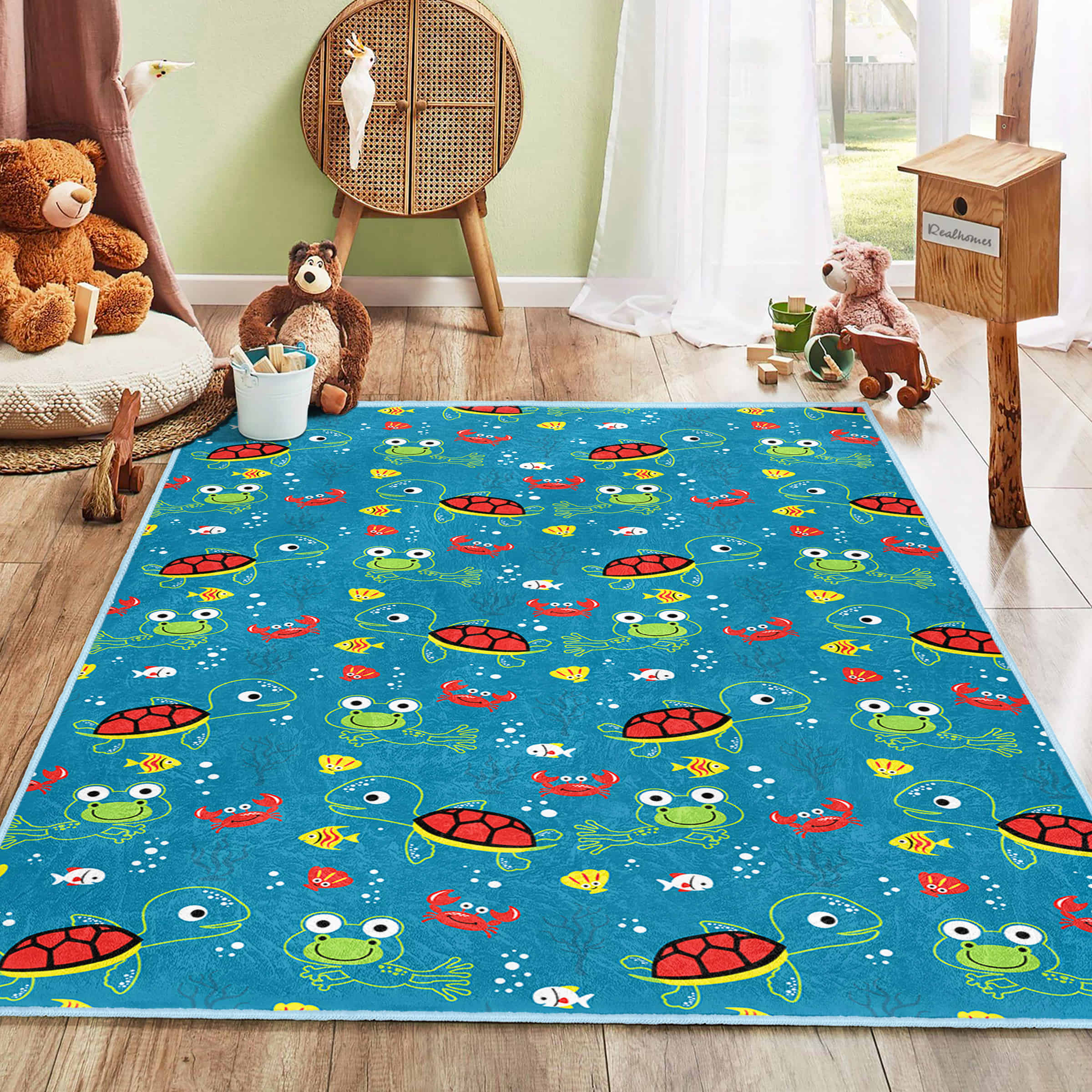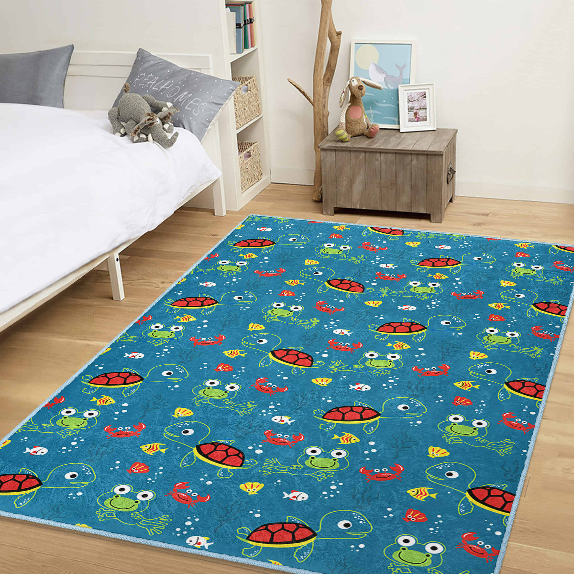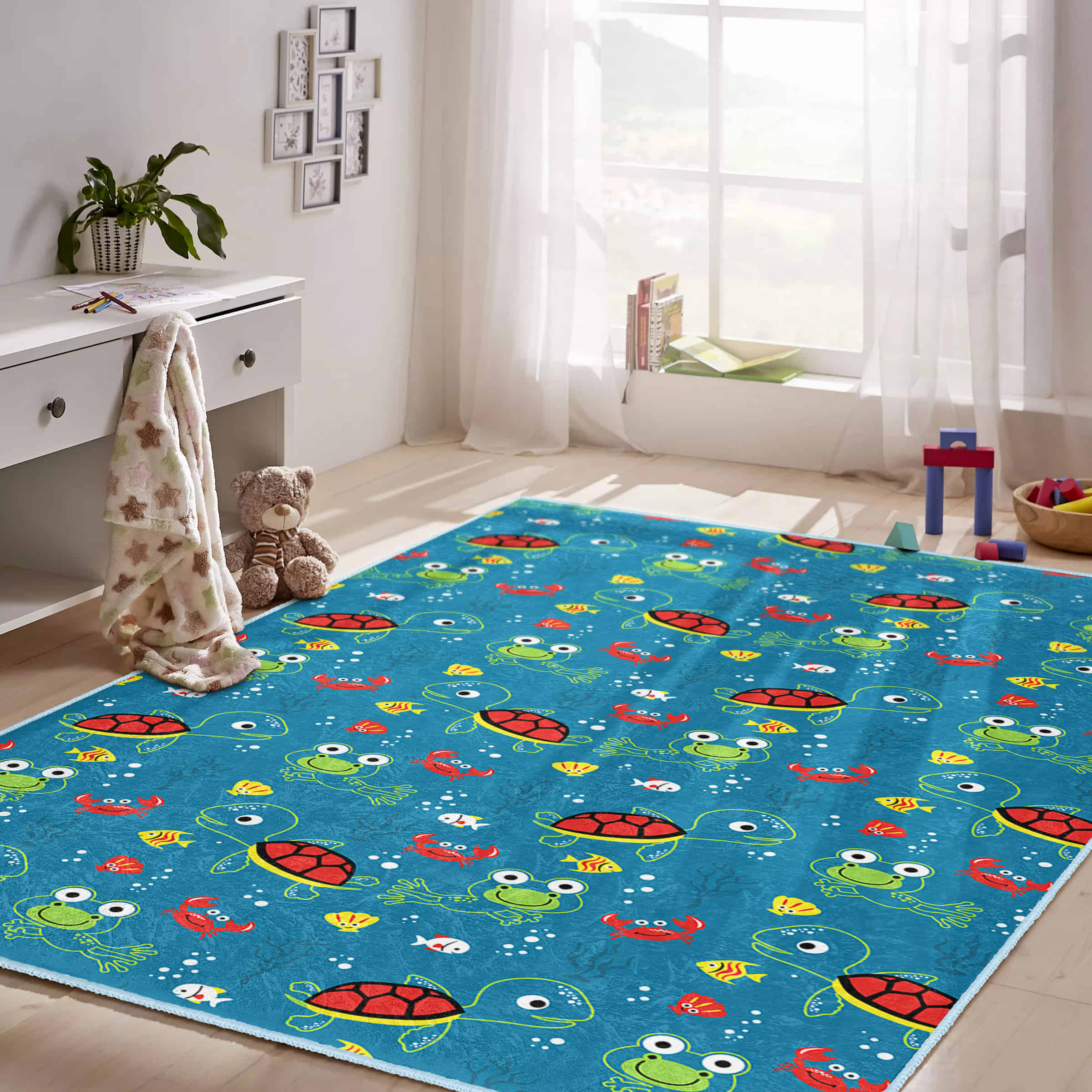 Deniz Altında Eğlenceli Deniz Canlıları Desenli Yıkanabilir Kaymaz Taban Çocuk Halısı