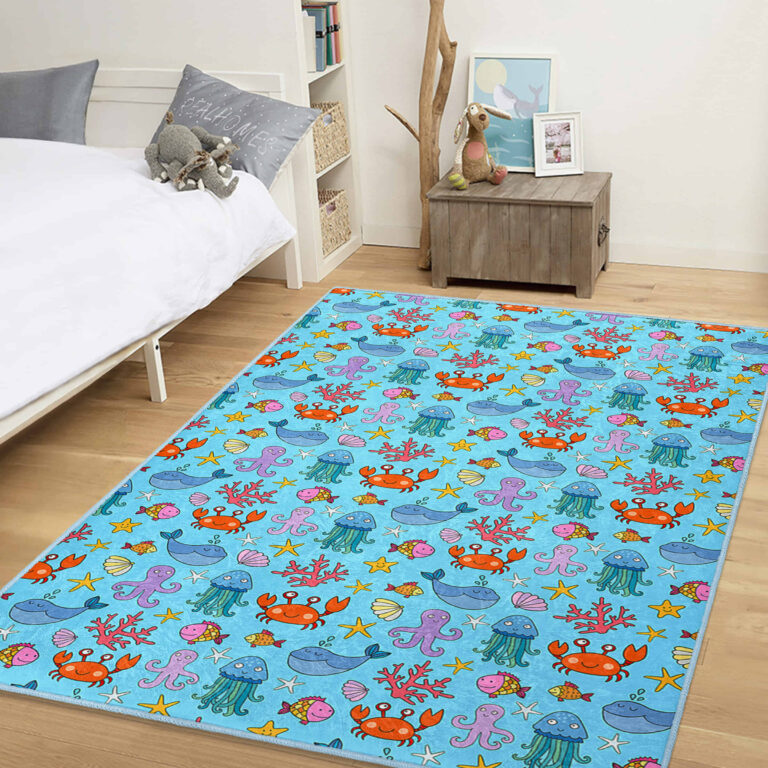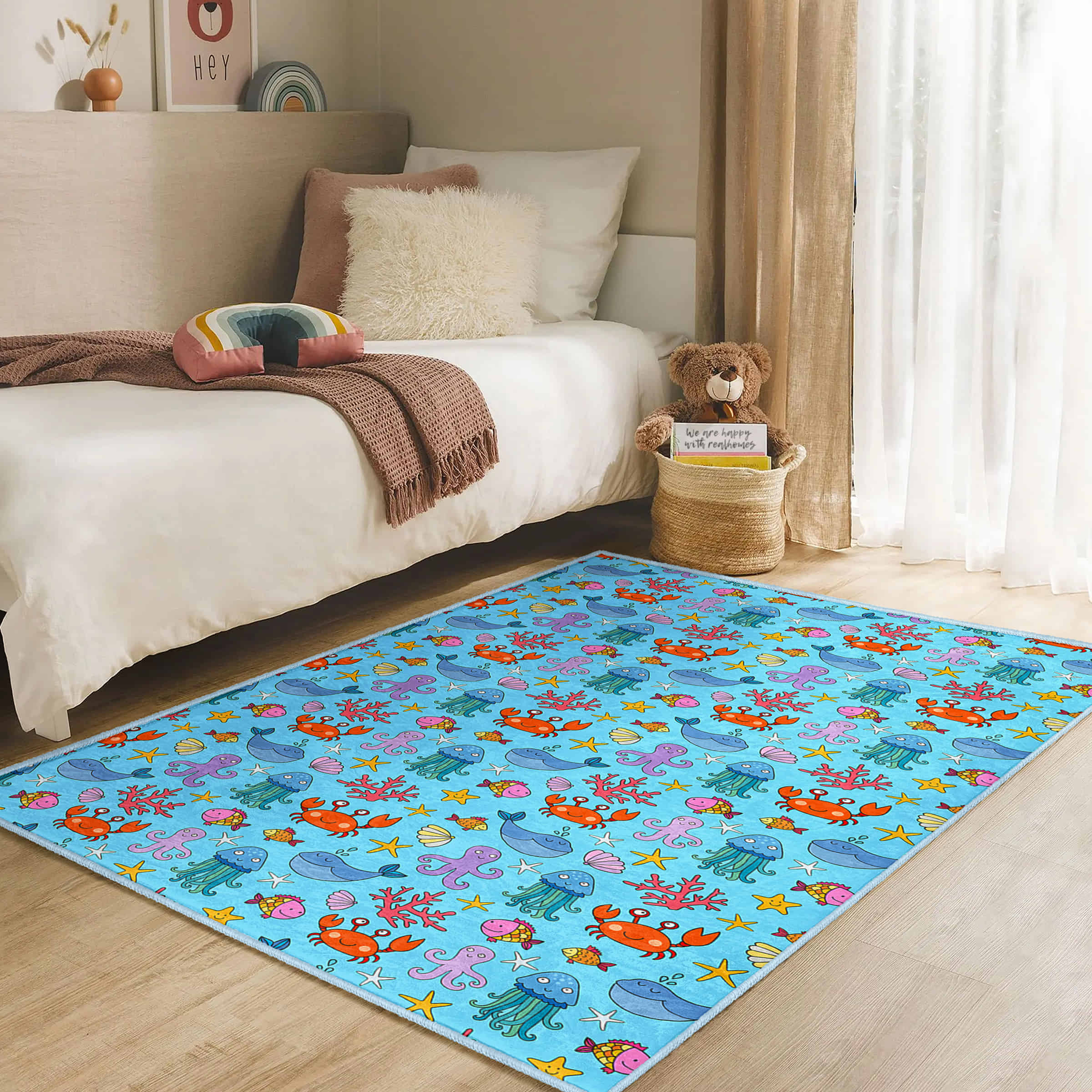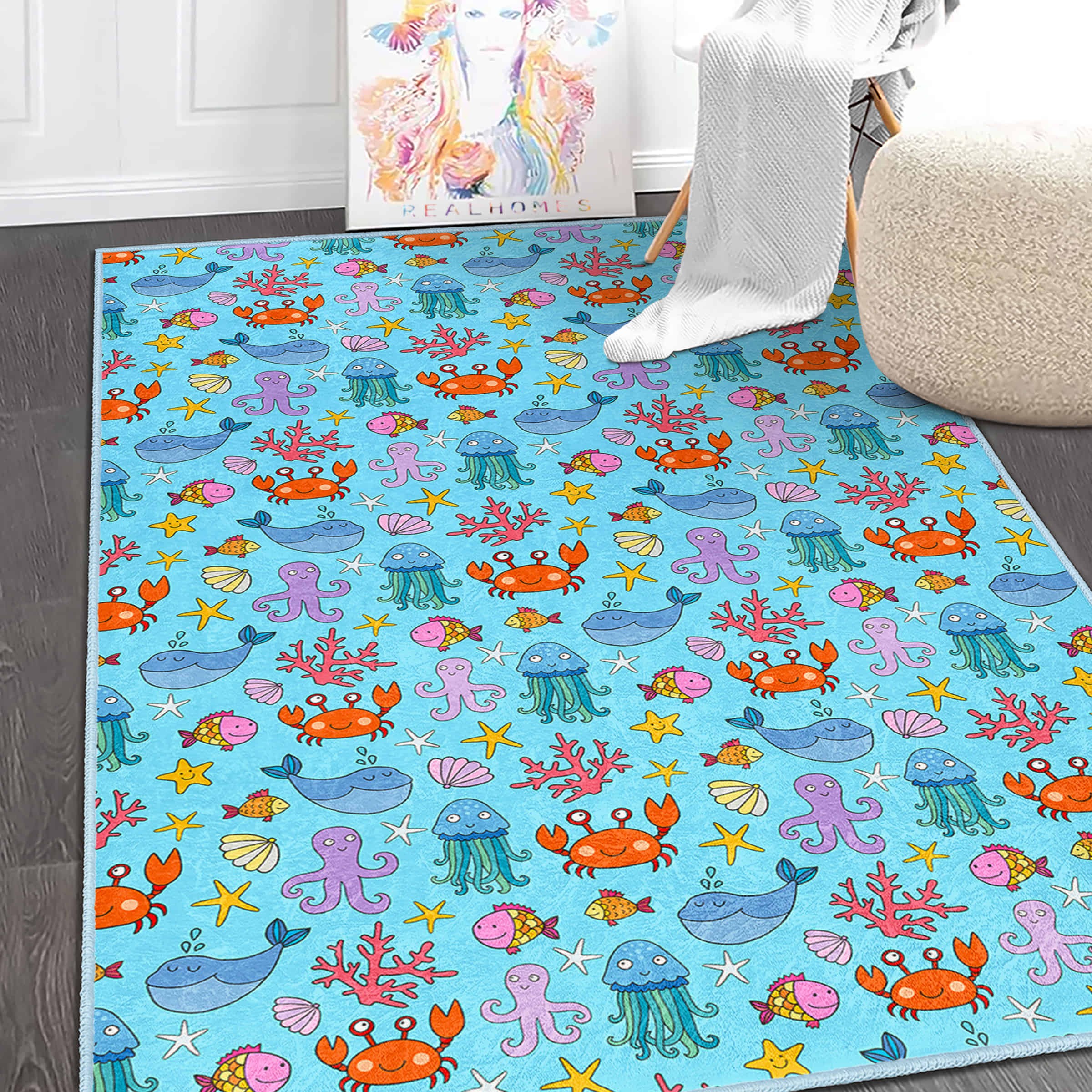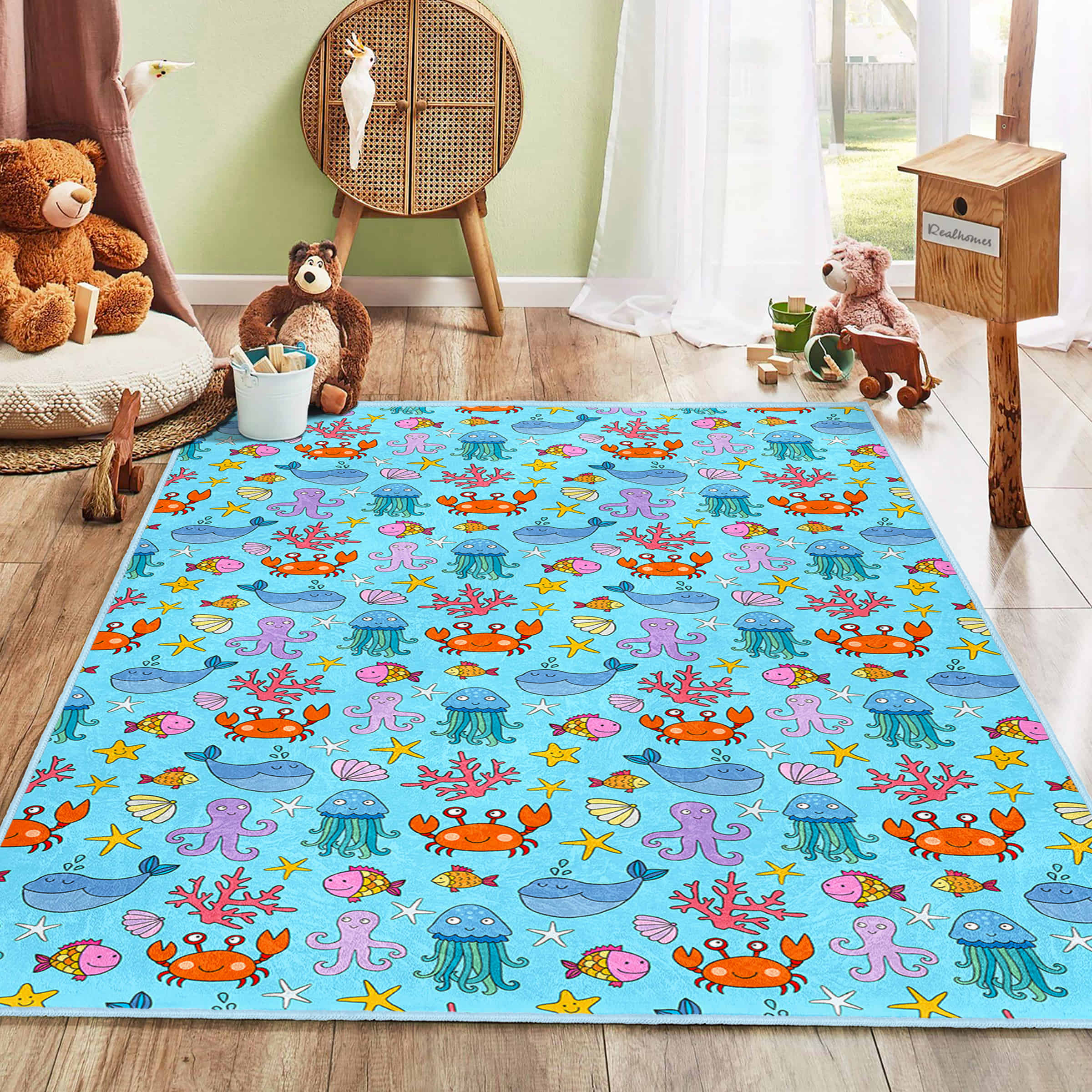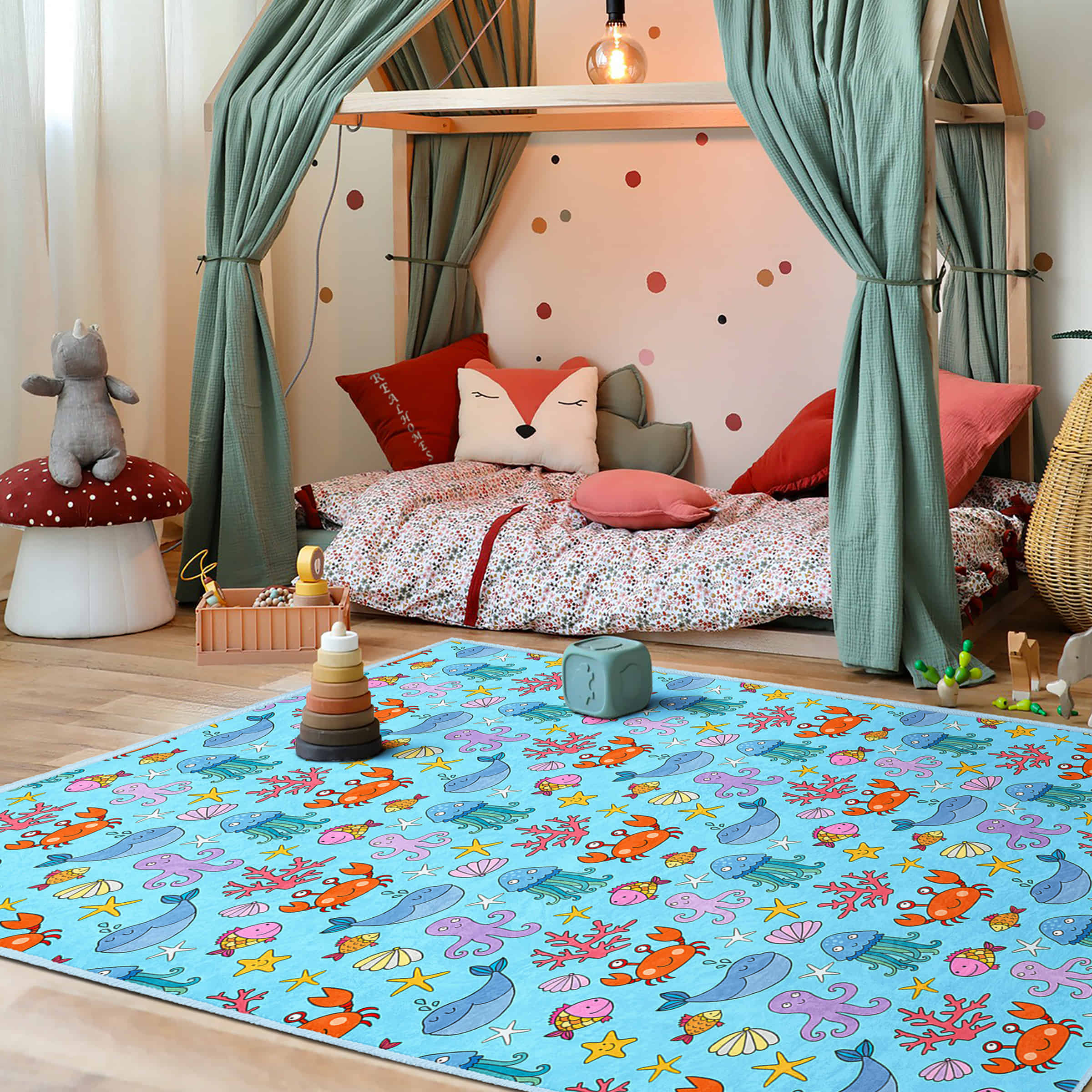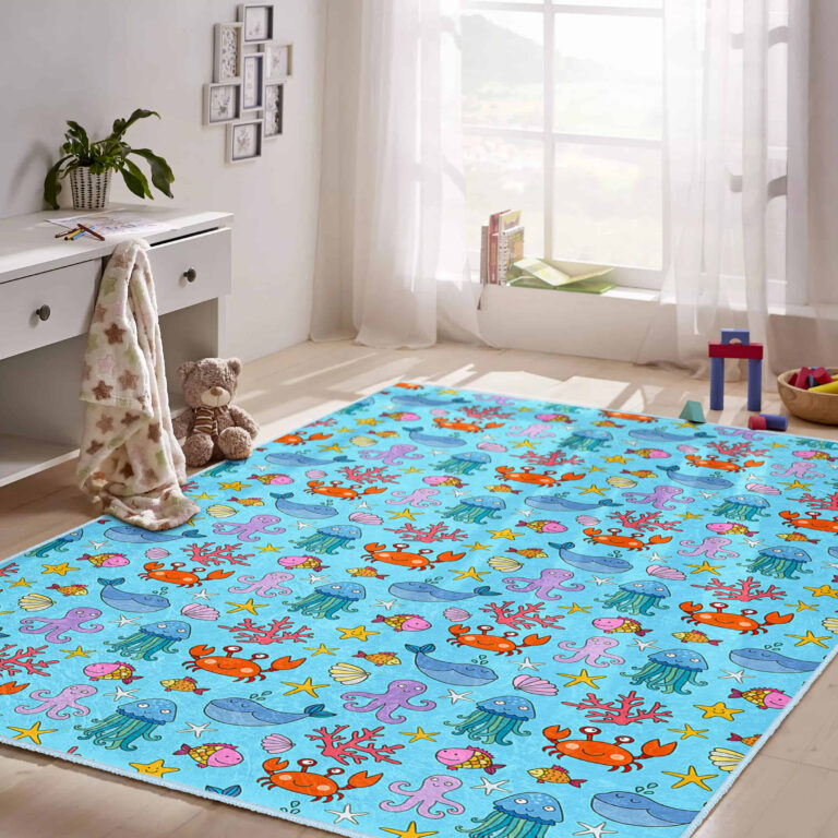 Deniz Temalı Canlı Renklerle Tasarlanmış Çocuk Halısı – Yıkanabilir Kaymaz Tabanlı Dikdörtgen Halı