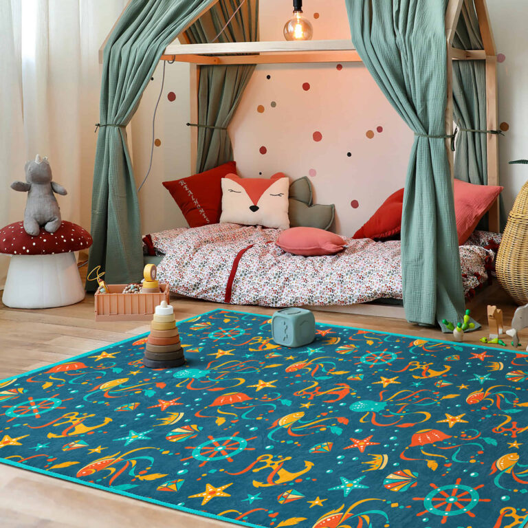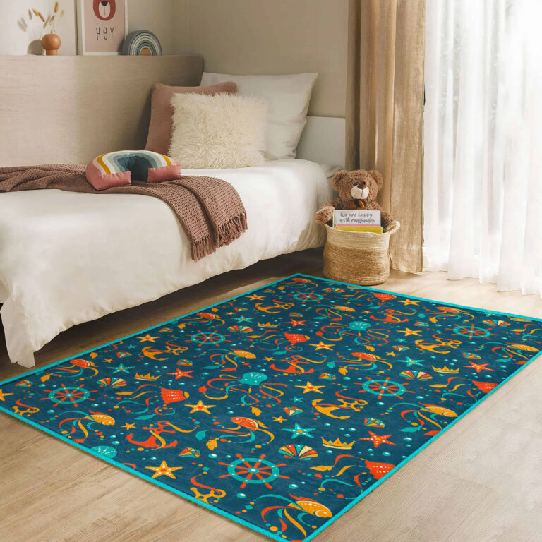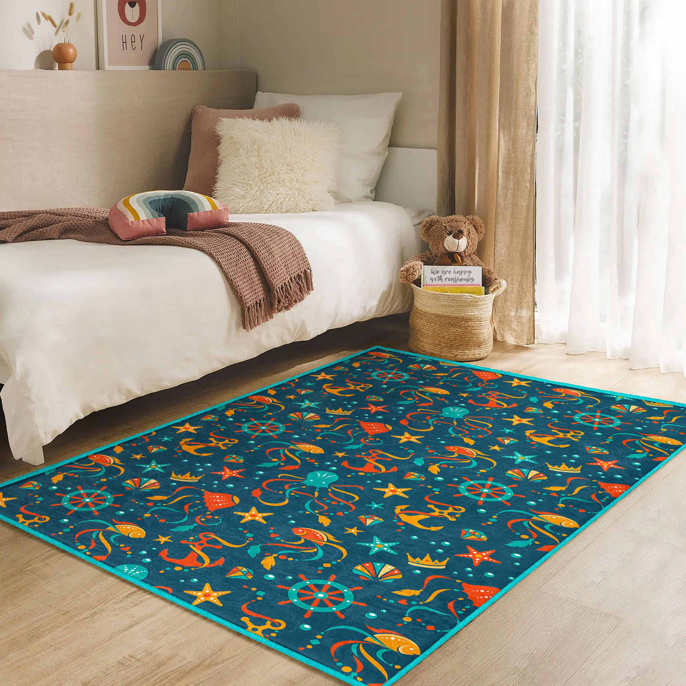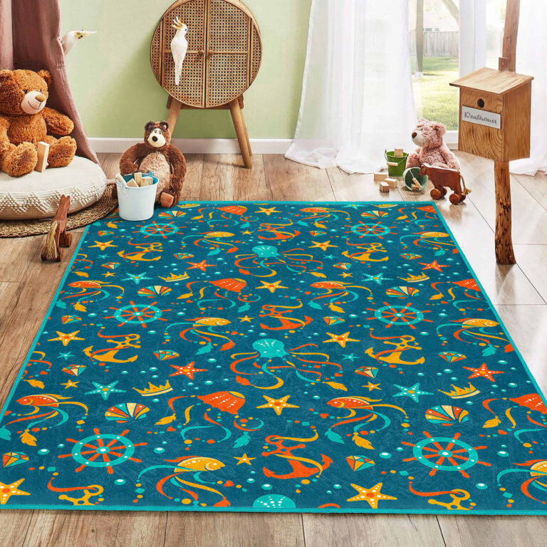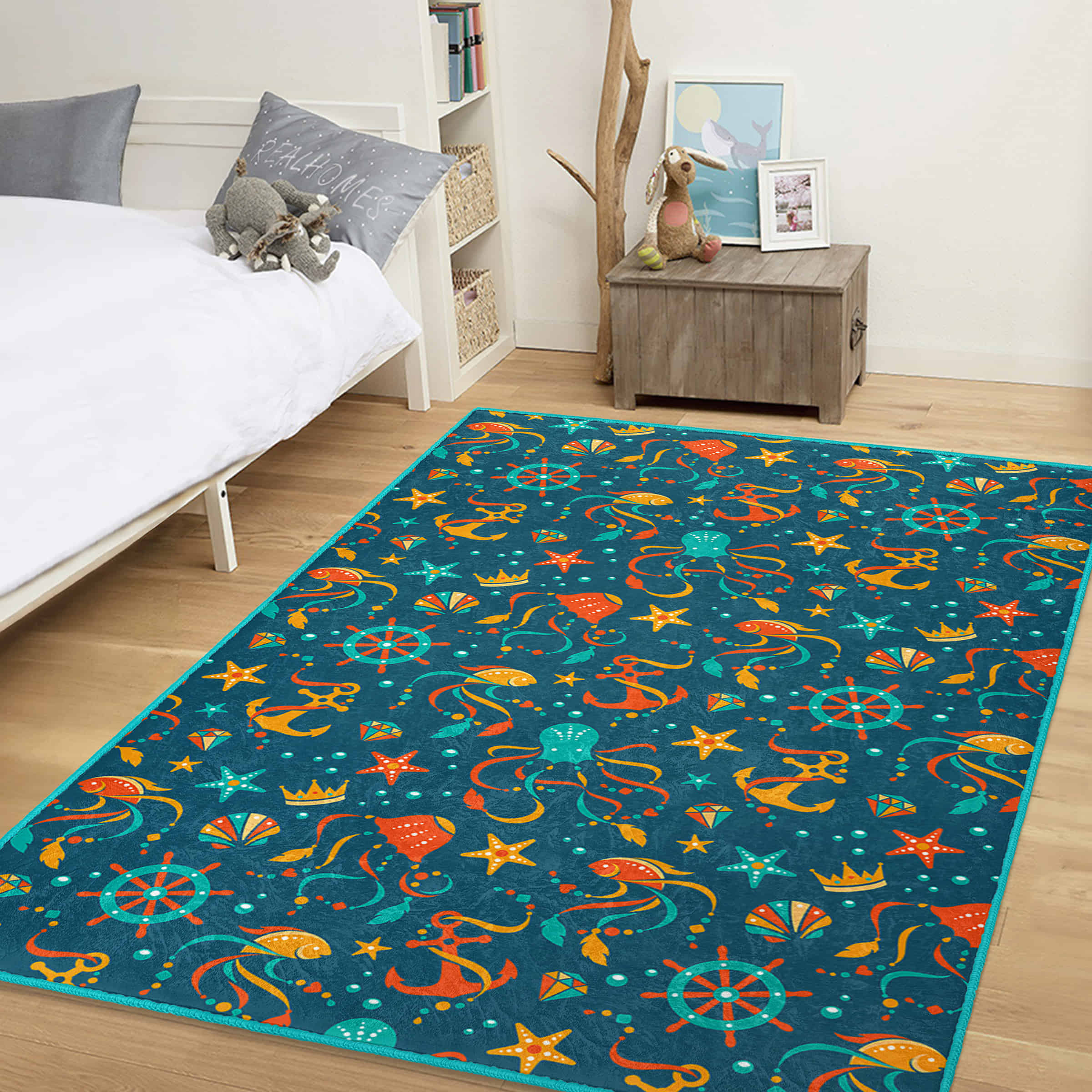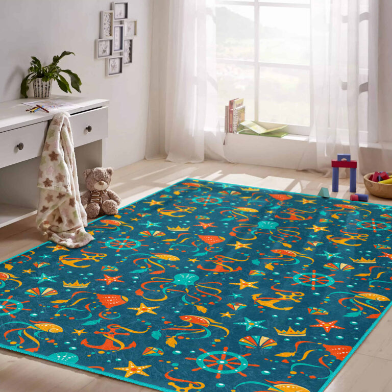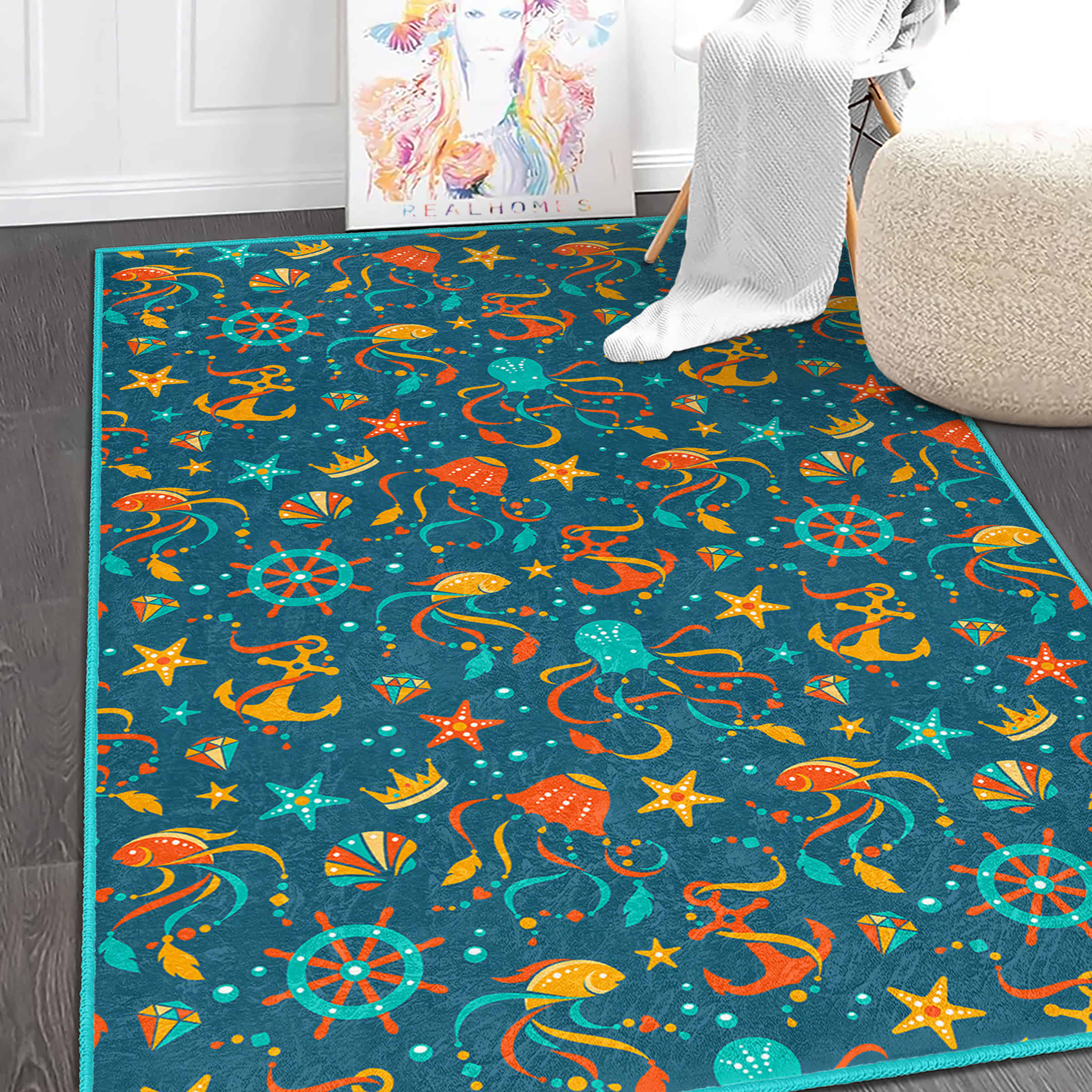Deniz Temalı Canlı Renkli 3D Dijital Baskılı Dikdörtgen Çocuk Halısı – Kaymaz Tabanlı Yıkanabilir