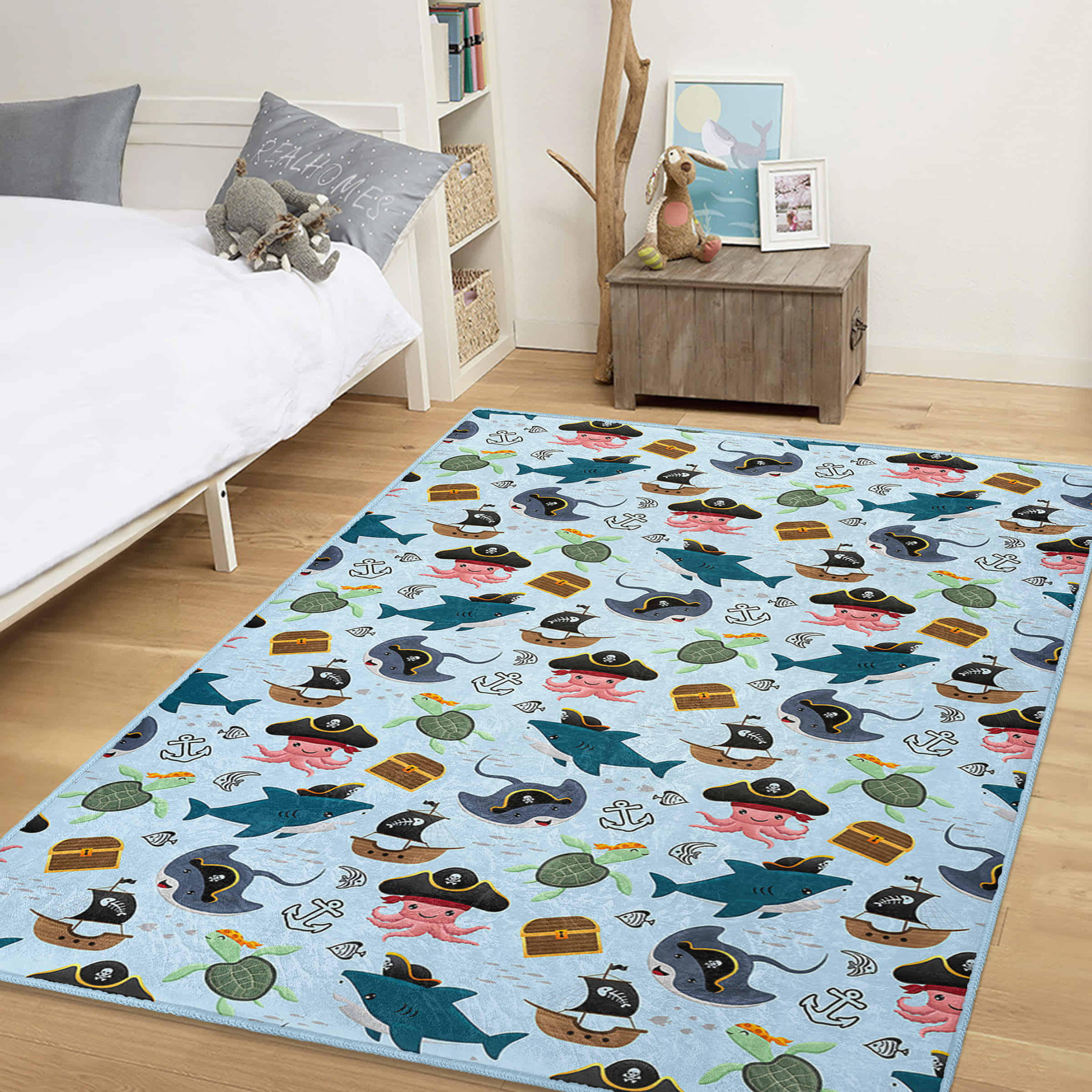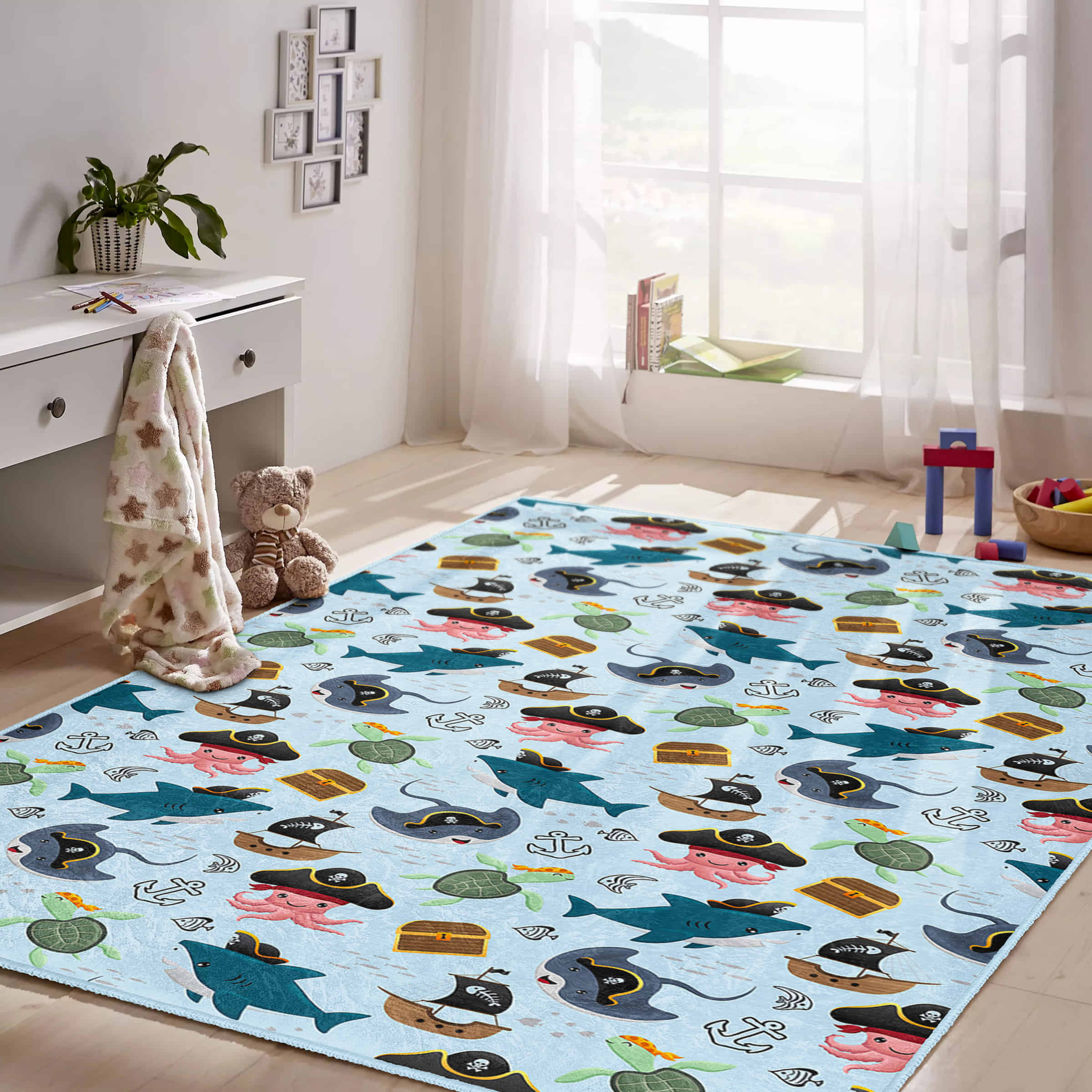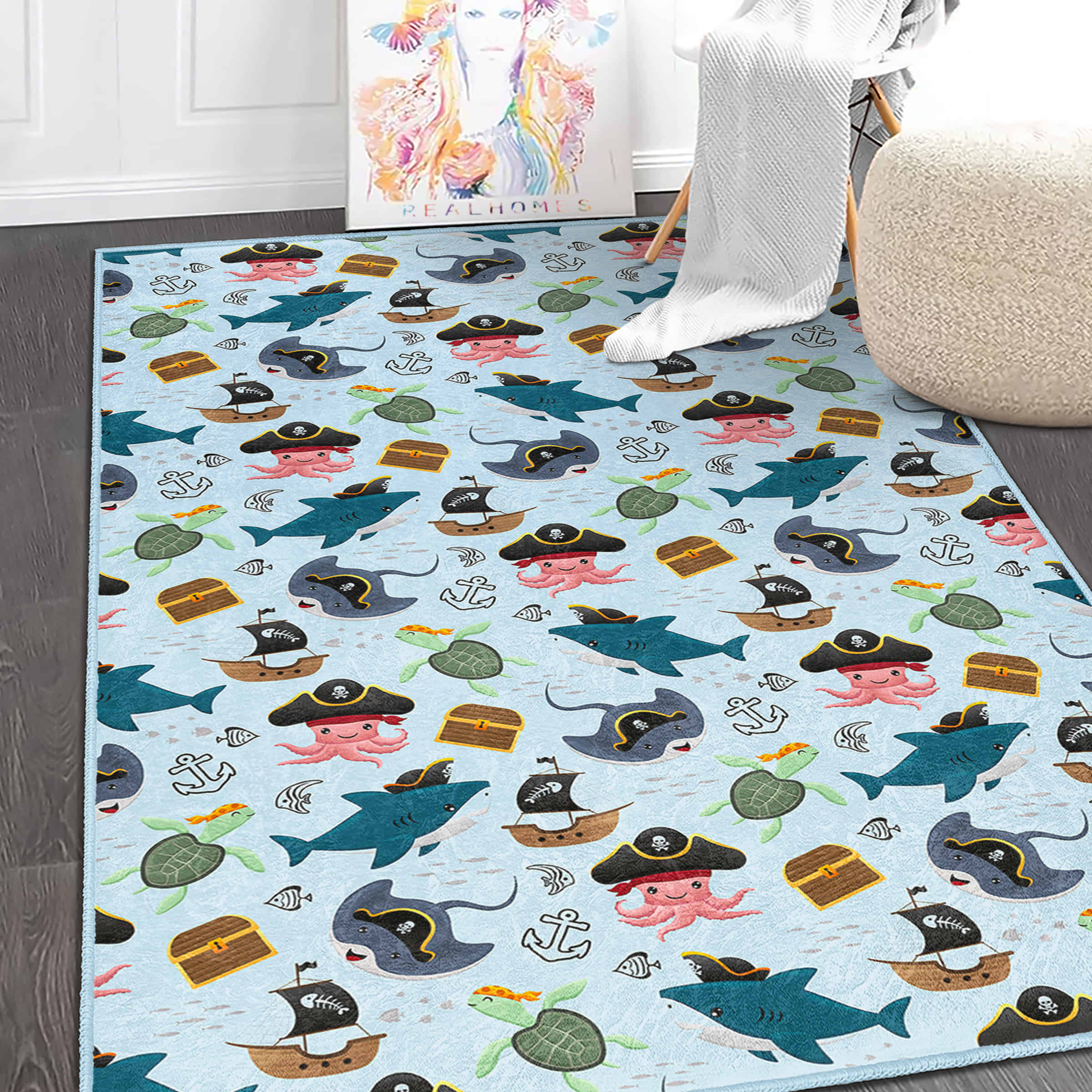 Deniz Temalı Çocuk Halısı – Canlı Renklerle Tasarlanmış Şirin Korsan & Deniz Canlıları Desenli Yıkanabilir Kaymaz Taban Halı