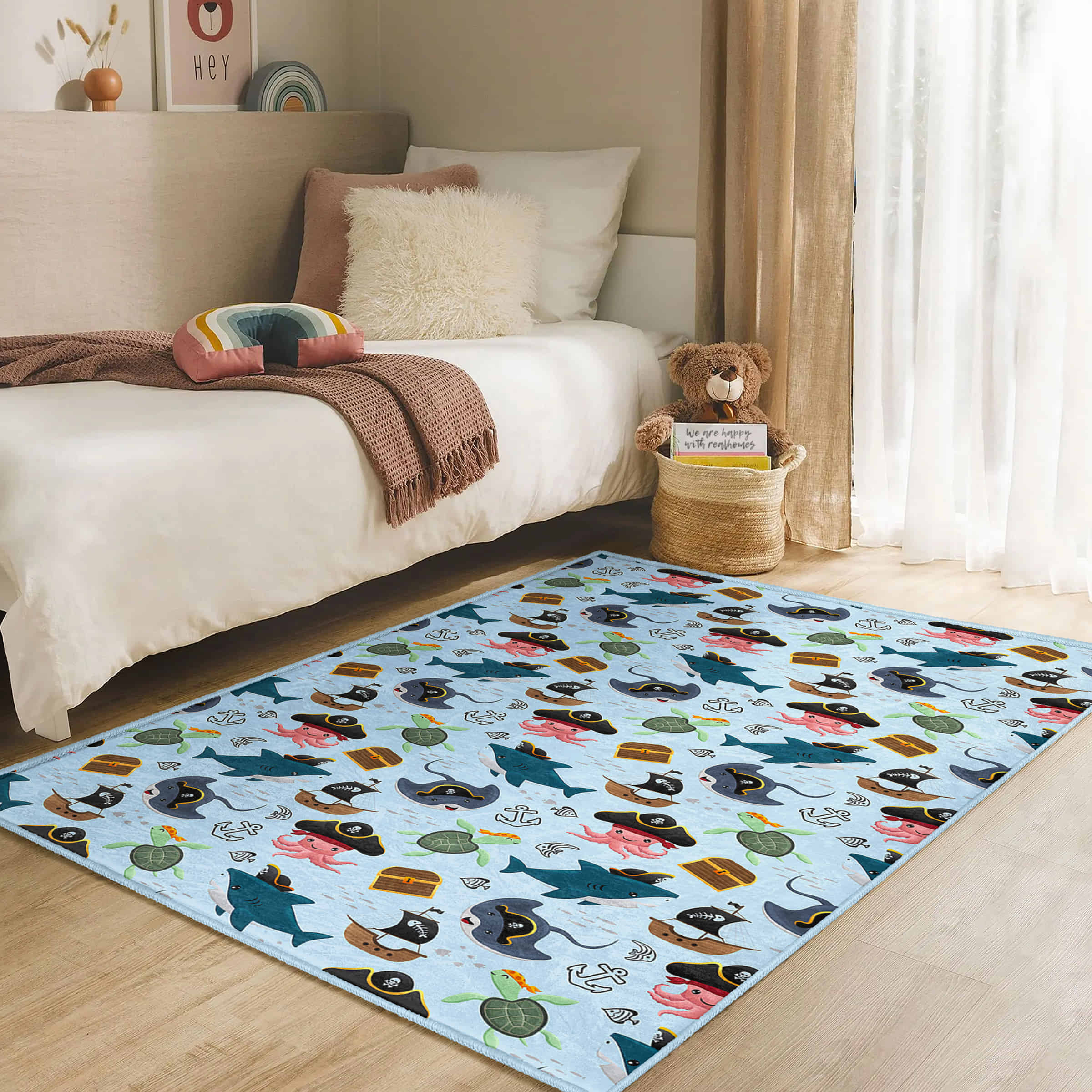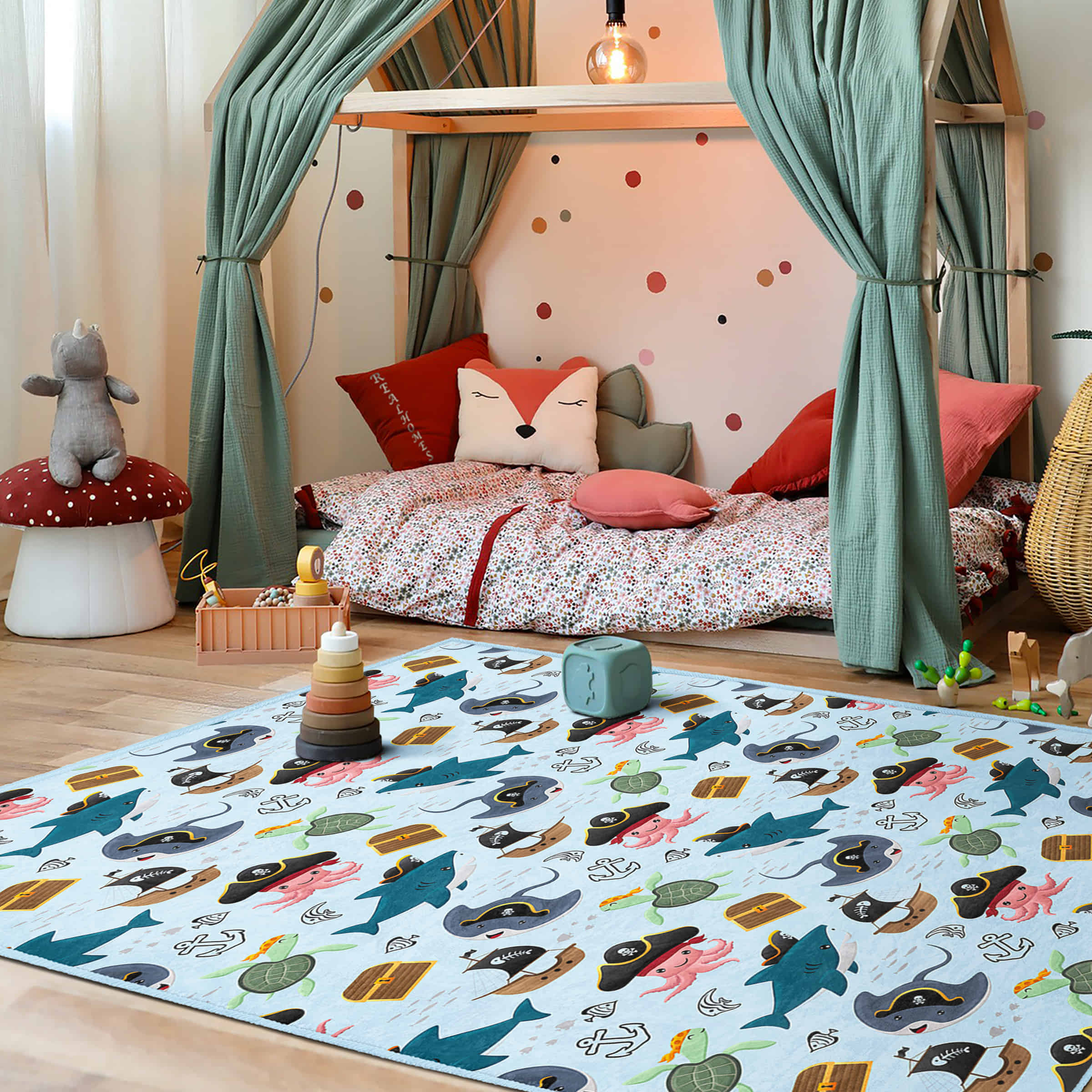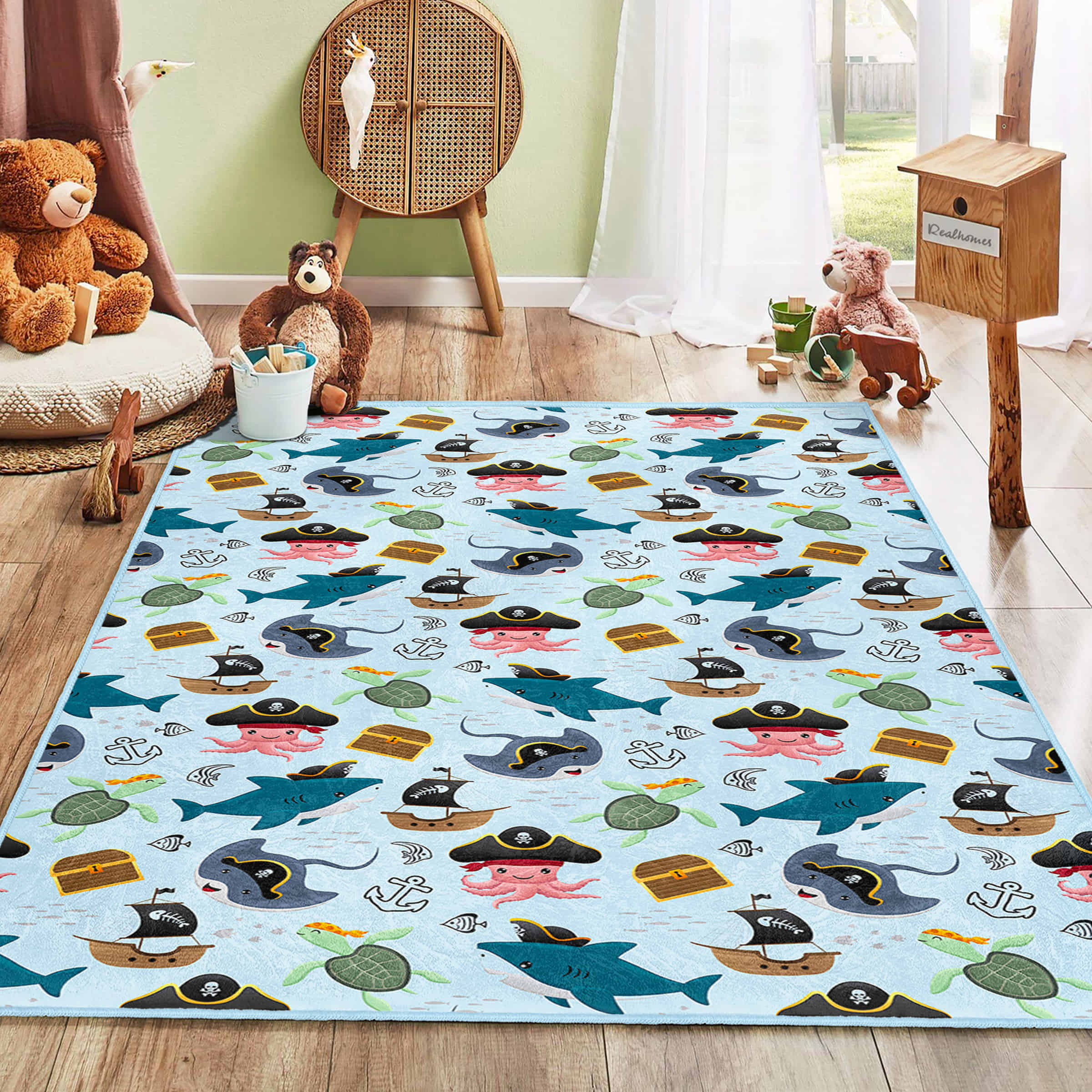 Deniz Temalı Çocuk Halısı – Canlı Renklerle Tasarlanmış Şirin Korsan & Deniz Canlıları Desenli Yıkanabilir Kaymaz Taban Halı