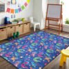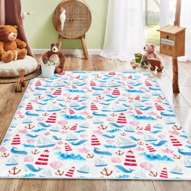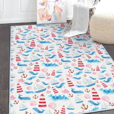 Deniz Temalı Çocuk Halısı: Mavi ve Kırmızı Yelkenler ile Sevimli Balinalar Desenli Yıkanabilir Kaymaz Taban Halı