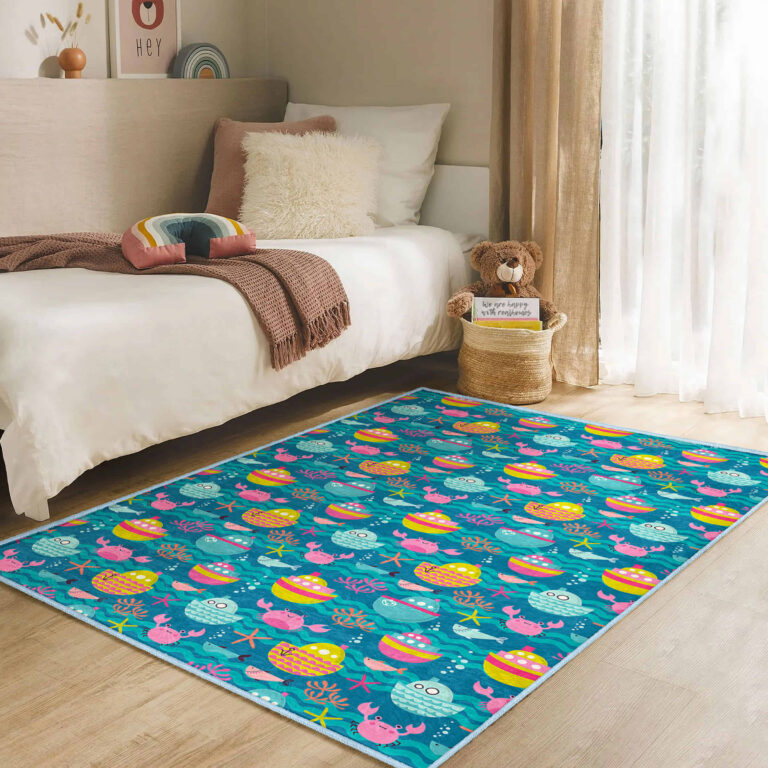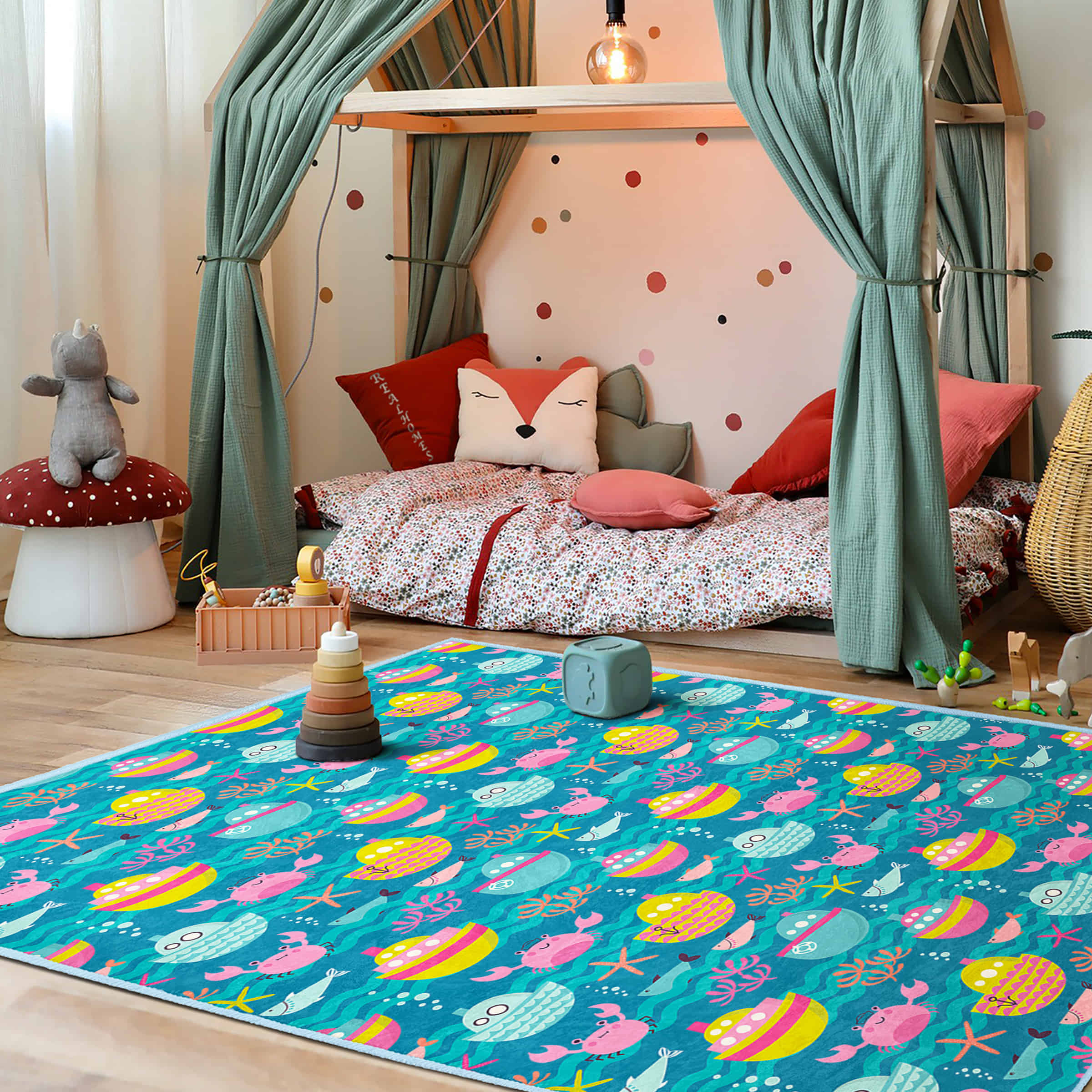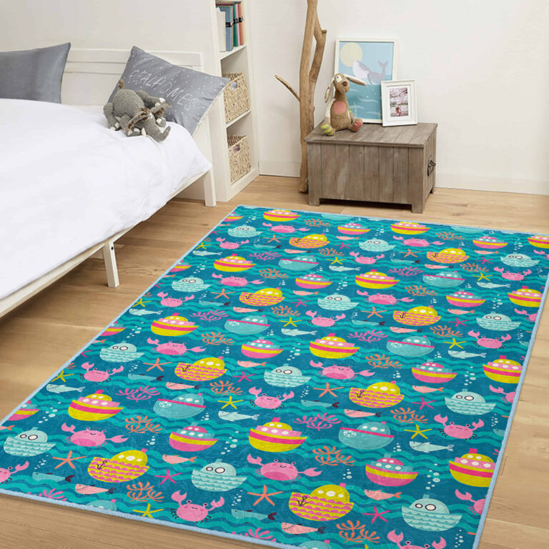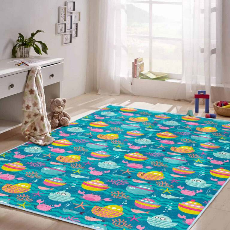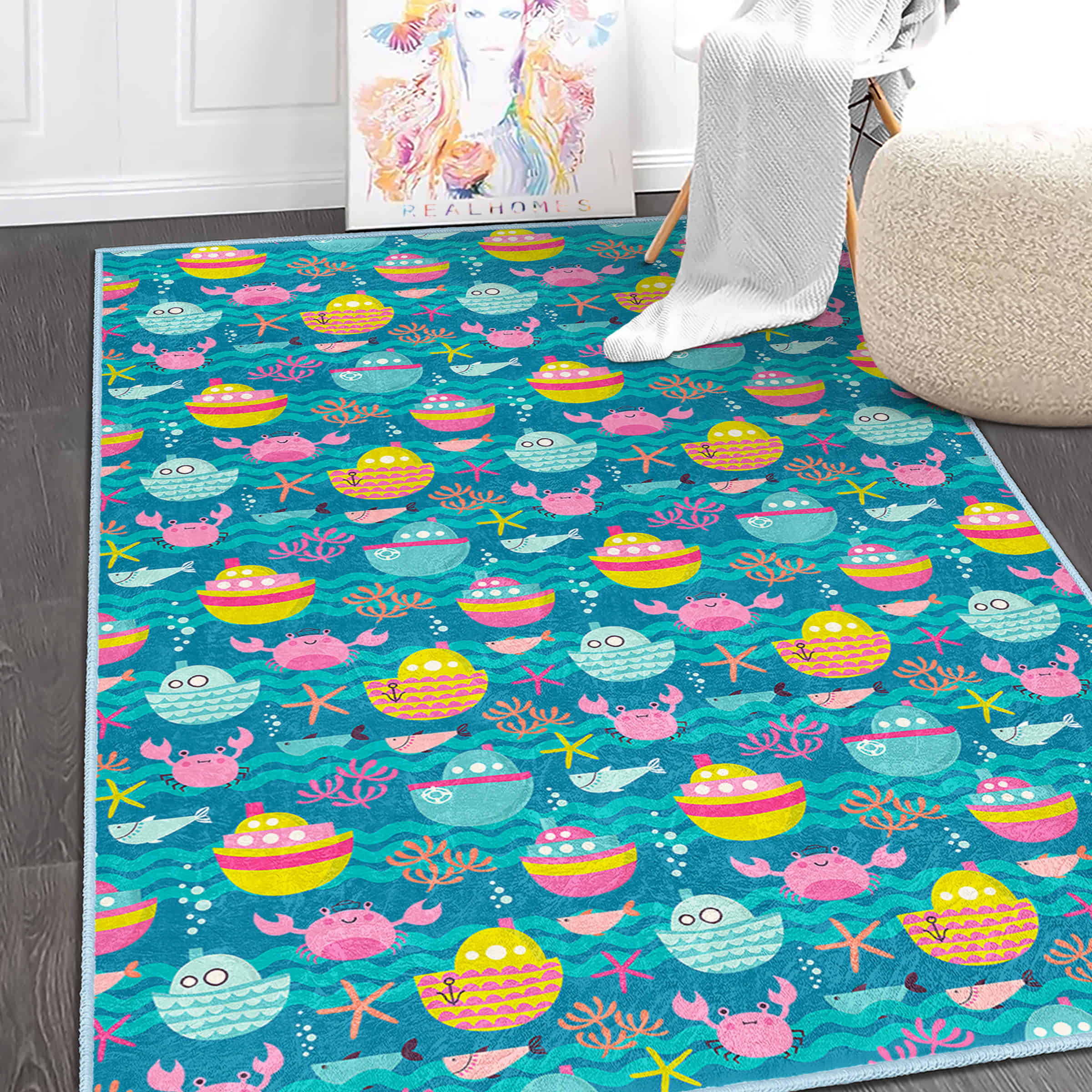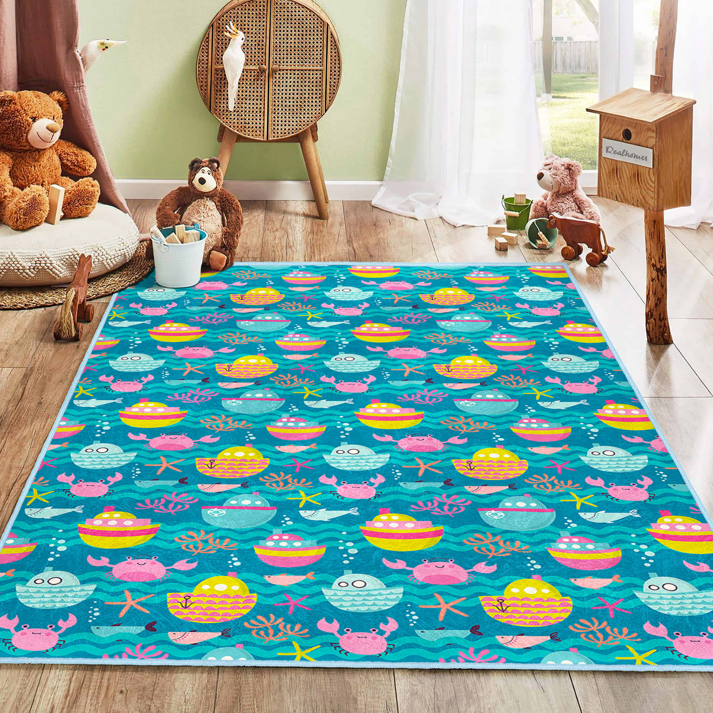 Deniz Temalı Çocuk Halısı: Renkli Gemiler, Krallar ve Deniz Canlılarıyla Dizayn Edilmiş Dikdörtgen Kaymaz Taban Halı