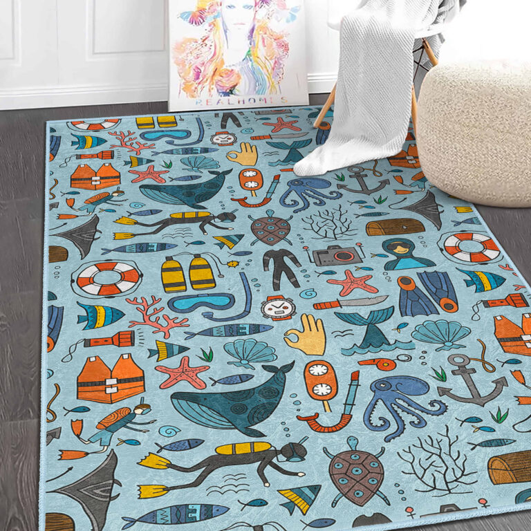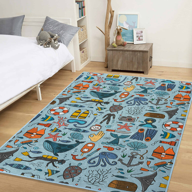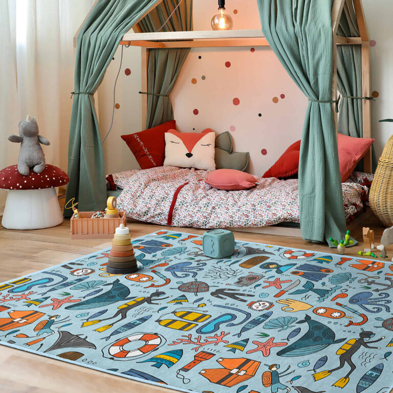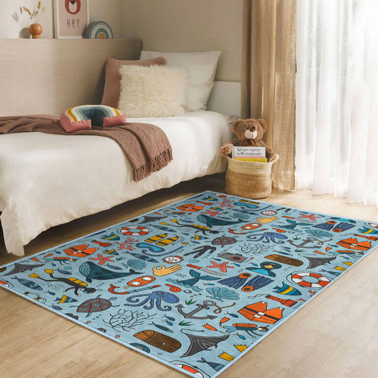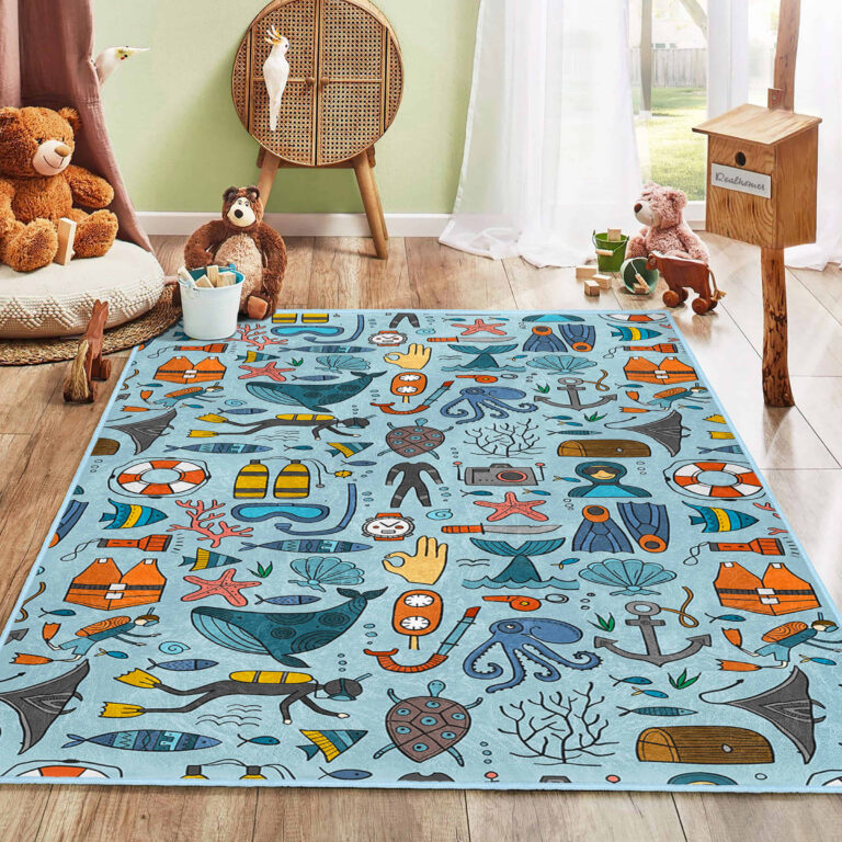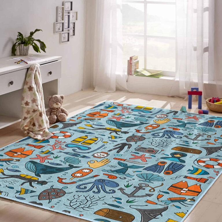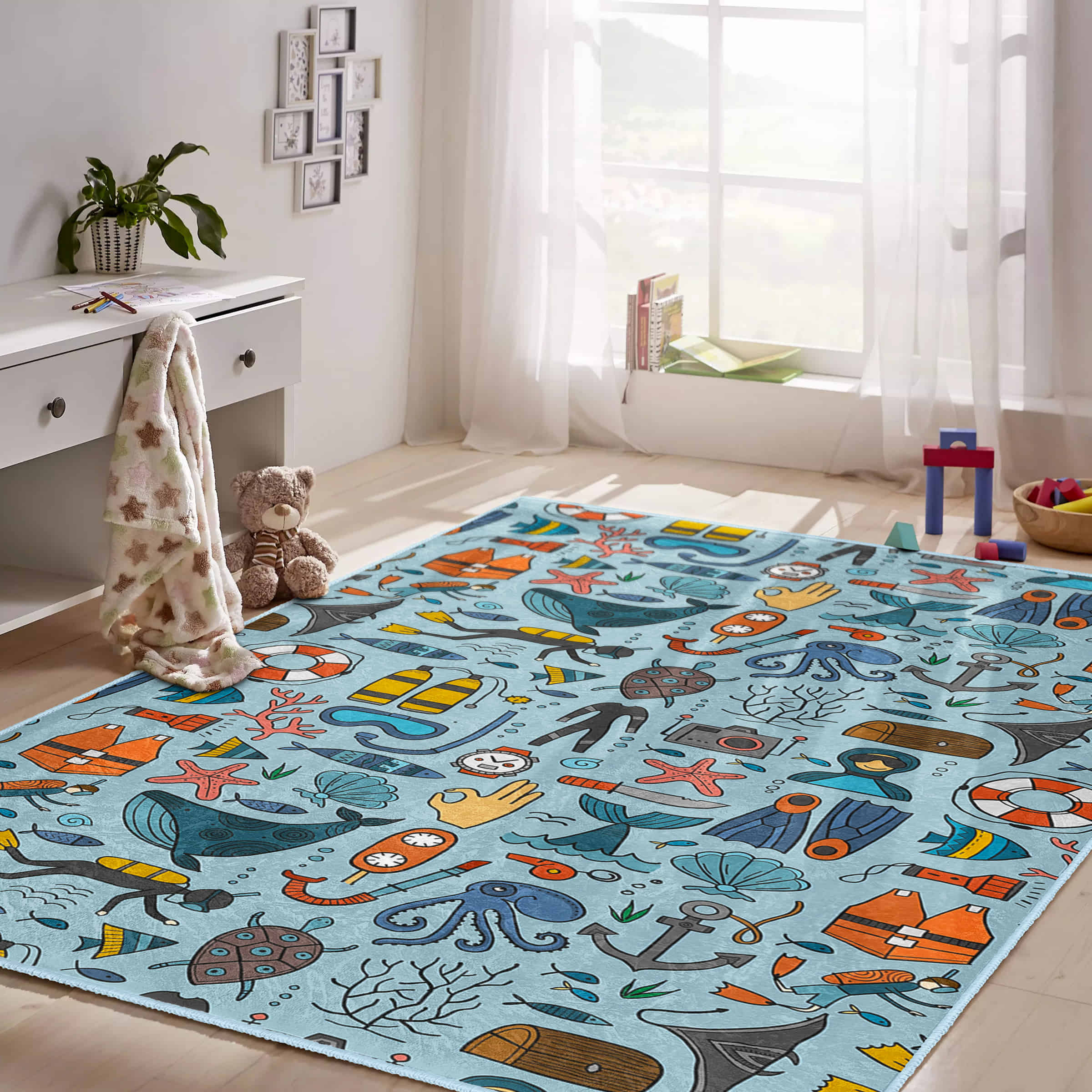 Deniz Temalı Renkli Çocuk Halısı – Eğlenceli Denizaltı Macerası, Makinede Yıkanabilir Kaymaz Tabanlı