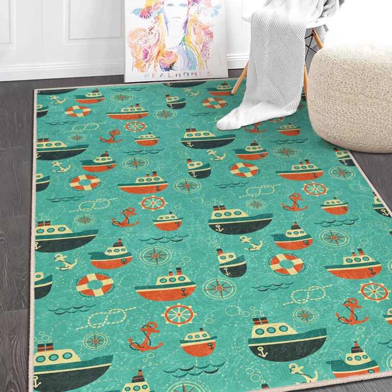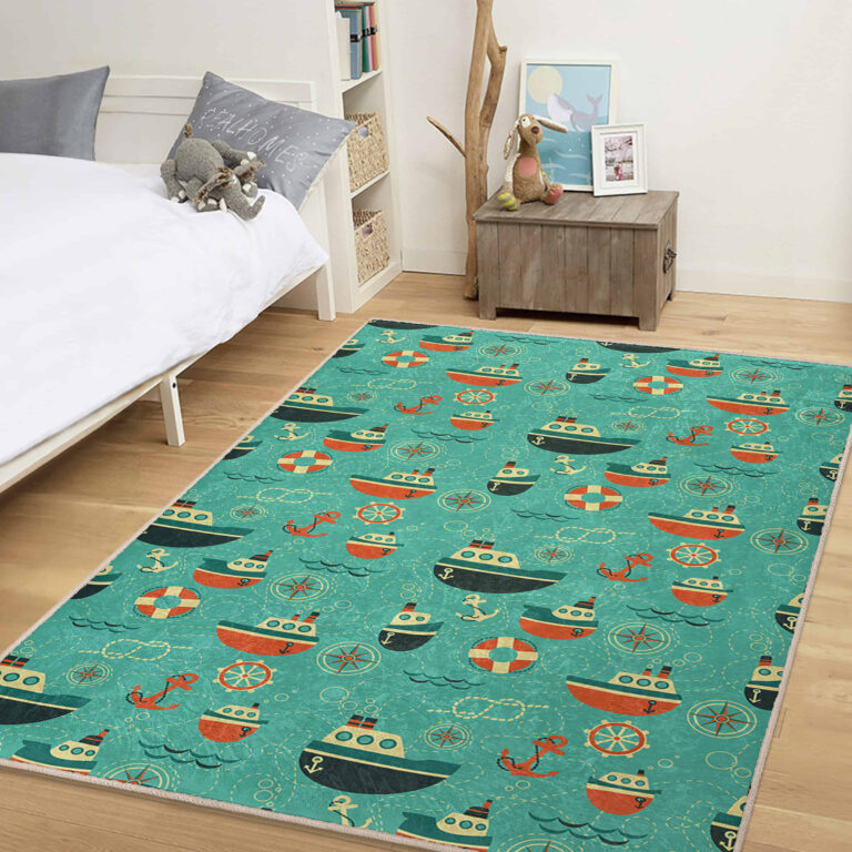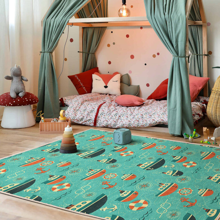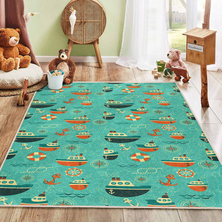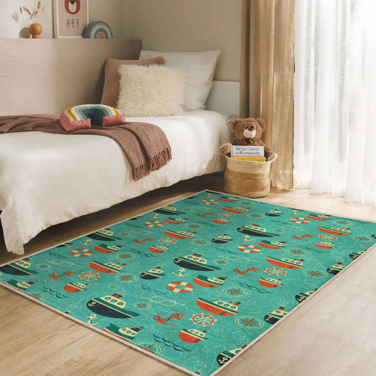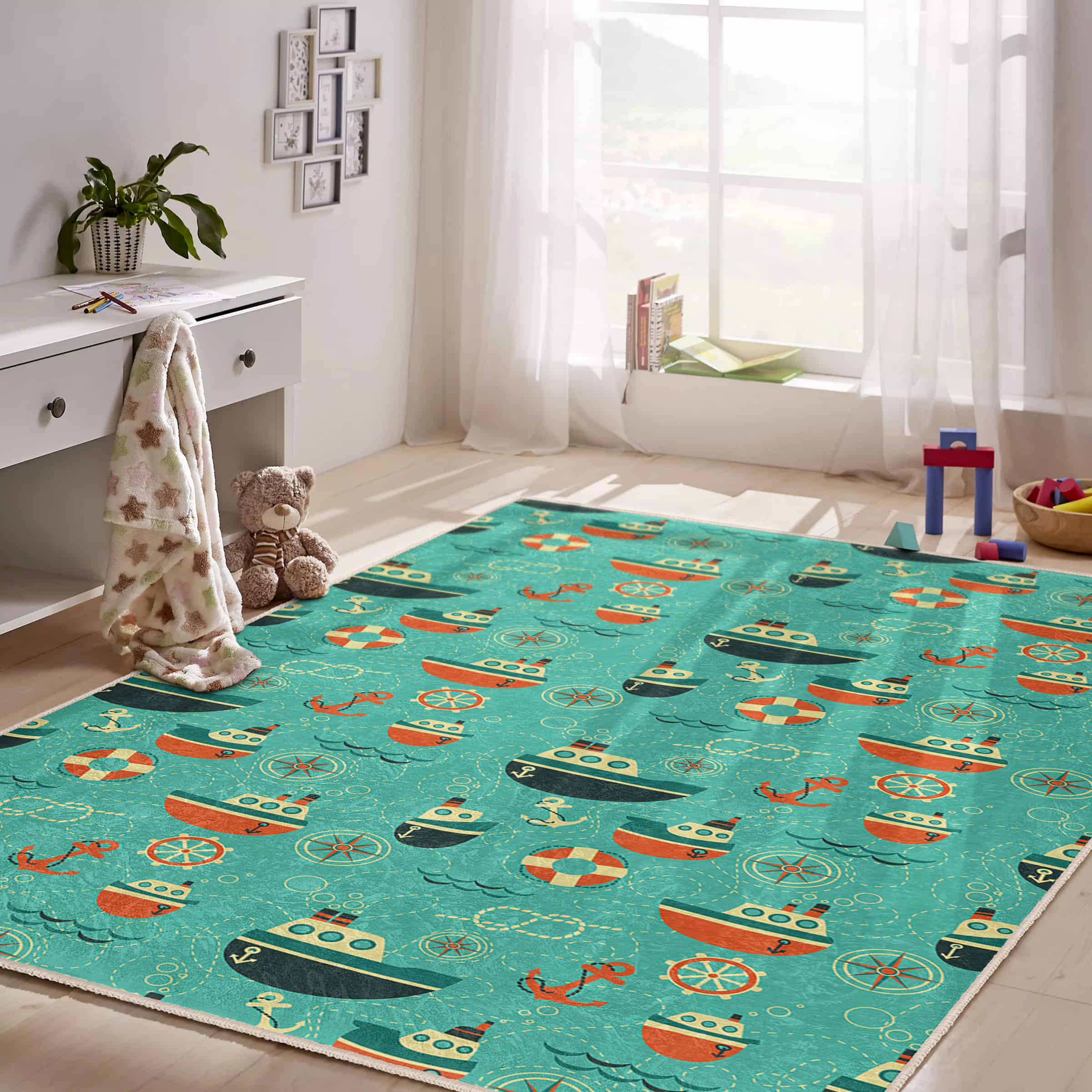 Deniz Temalı Renkli Çocuk Halısı – Yıkanabilir ve Kaymaz Tabanlı Dikdörtgen Desenli Halı